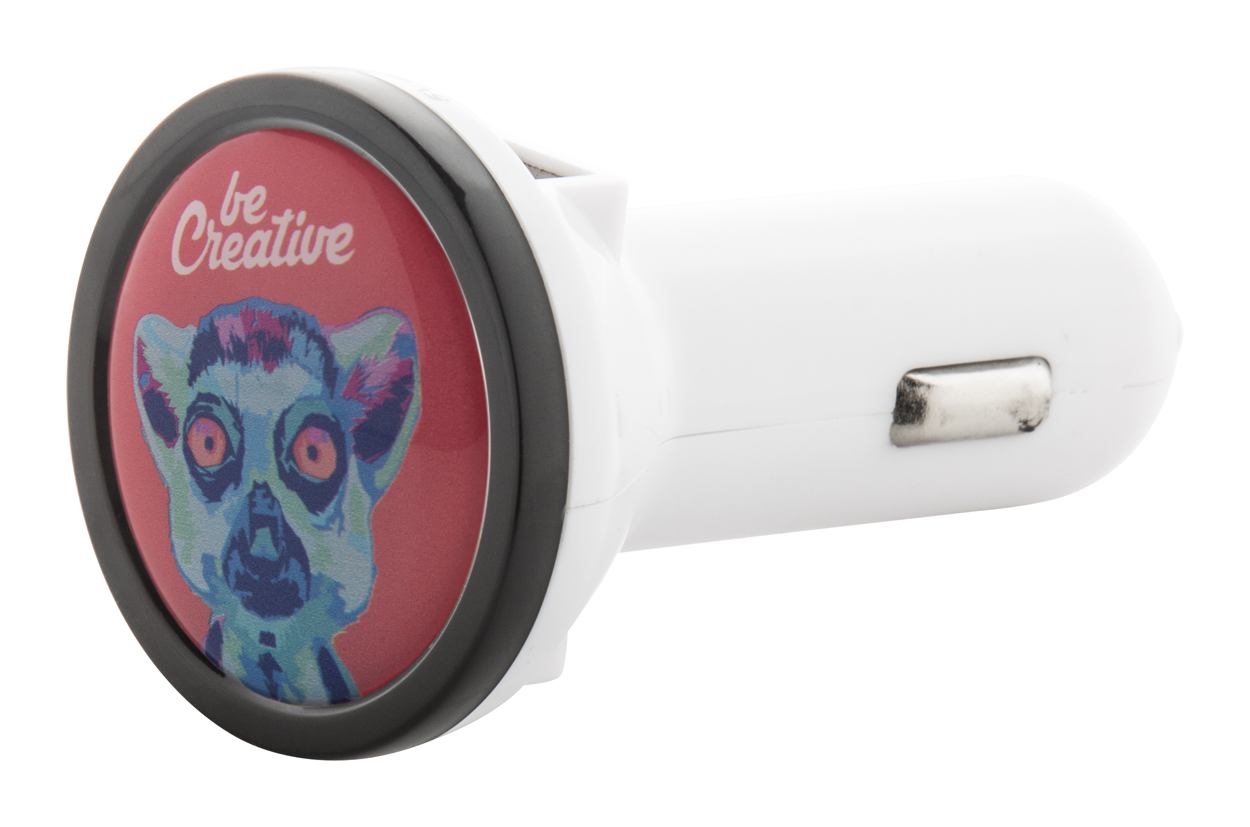 USB-Ladeadapter fürs Auto mit 2 USB Ports (max. Ausgang: 1000 mA (Port 1), 2100 mA (Port 2). Ideal für Doming-Druck.
