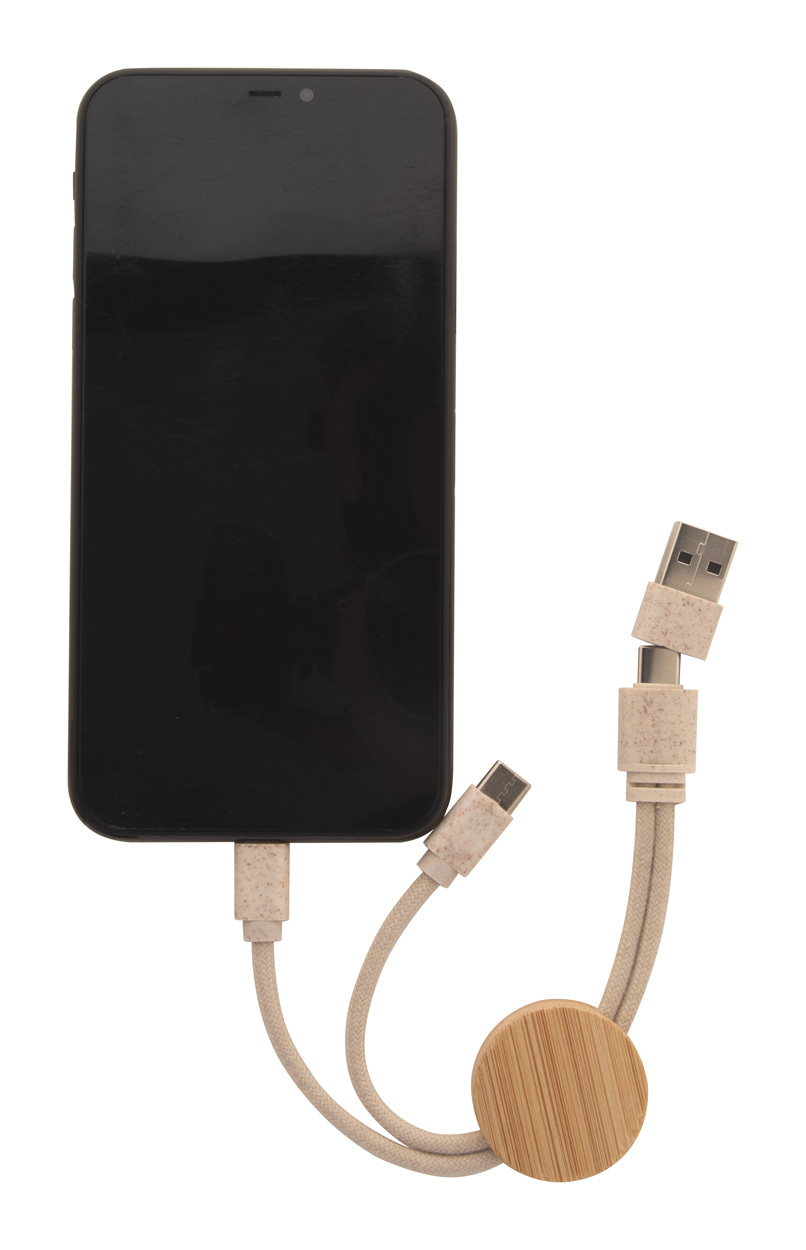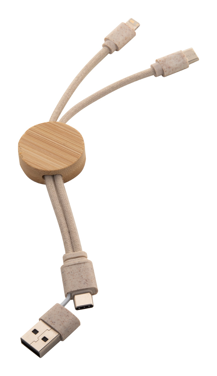 USB Ladekabel aus ökologischem Weizenstrohkunststoff, Baumwolle und Bambus mit Mikro-USB, USB-C und Lightning-Steckern. Mit USB und USB-C Eingangsbuchsen.
