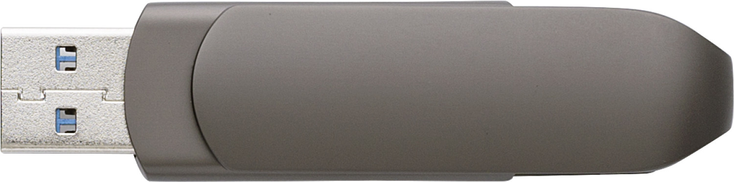 USB-Stick 3.0 aus verzinkter Oberfläche. Metall, mattes Finish in Graphit. 64gb Kapazität. Mit Twist-Funktion für USB-A und USB-C. Einzeln verpackt in einem Metallgehäuse.