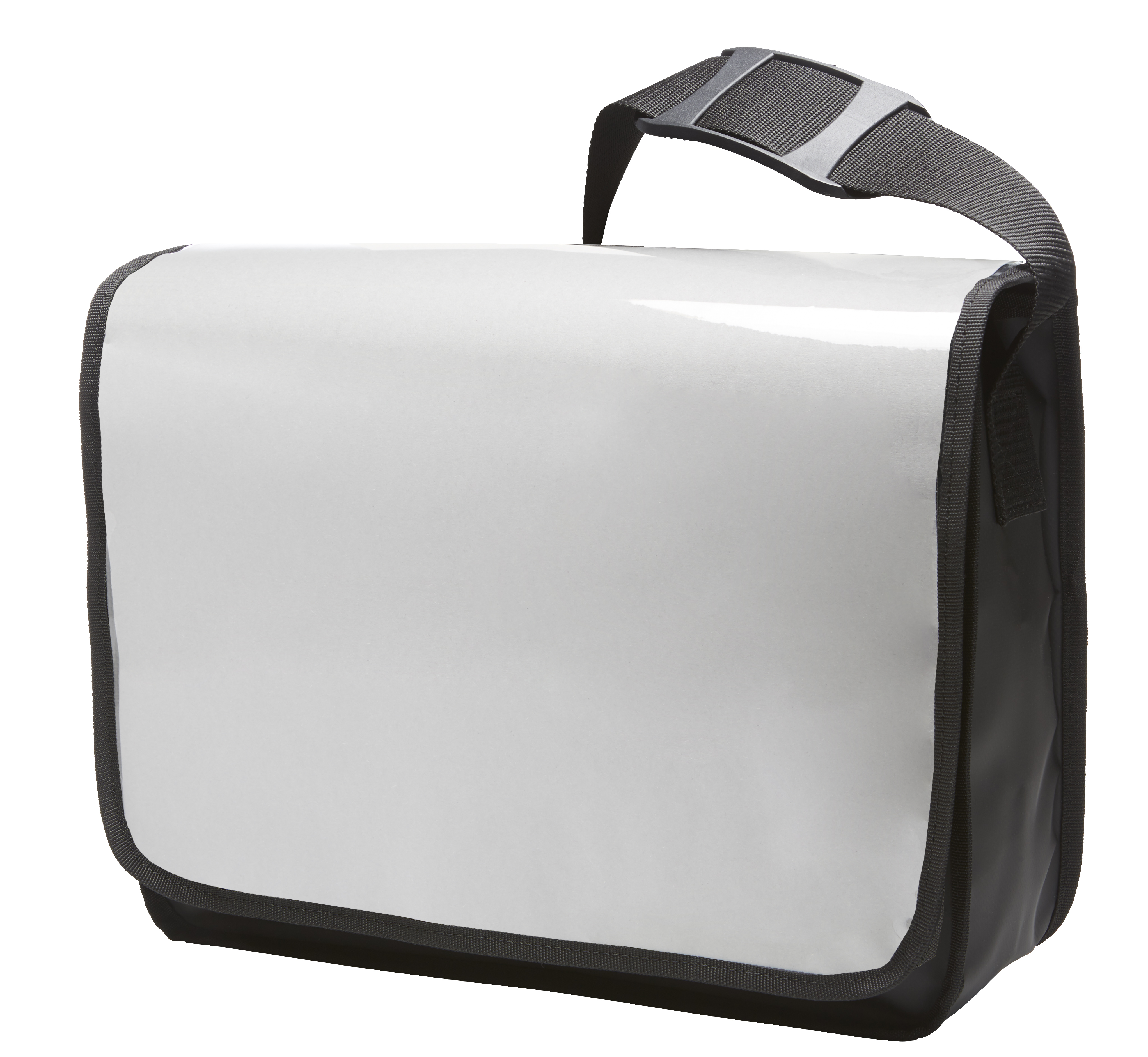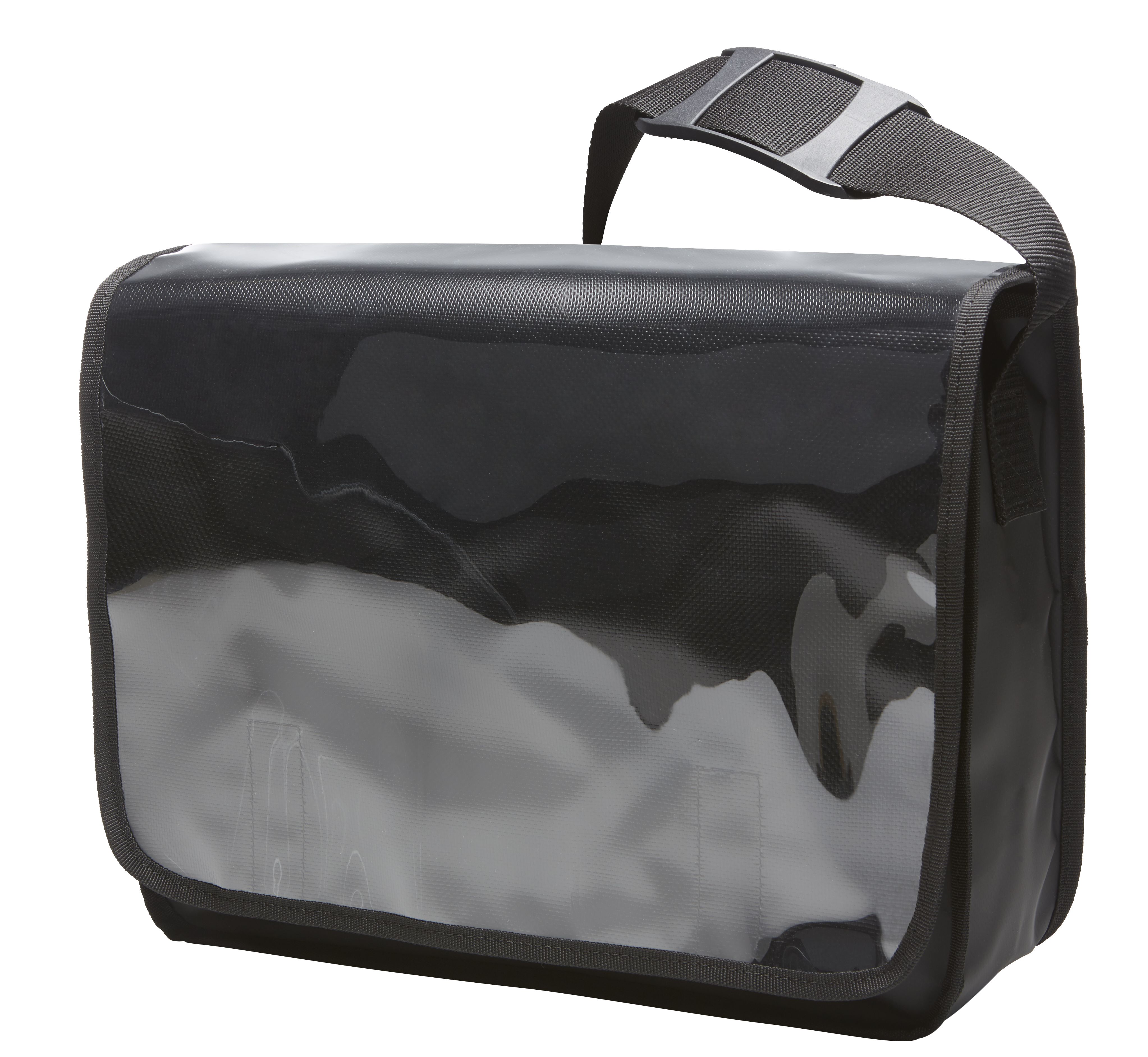 Trendige Display-Tasche zur Präsentation Ihrer Werbebotschaft; Folienfenster auf dem Überschlag; rückseitiges Reißverschluss-Einsteckfach; längenverstellbarer Schultergurt mit PVC-Rutschsicherung