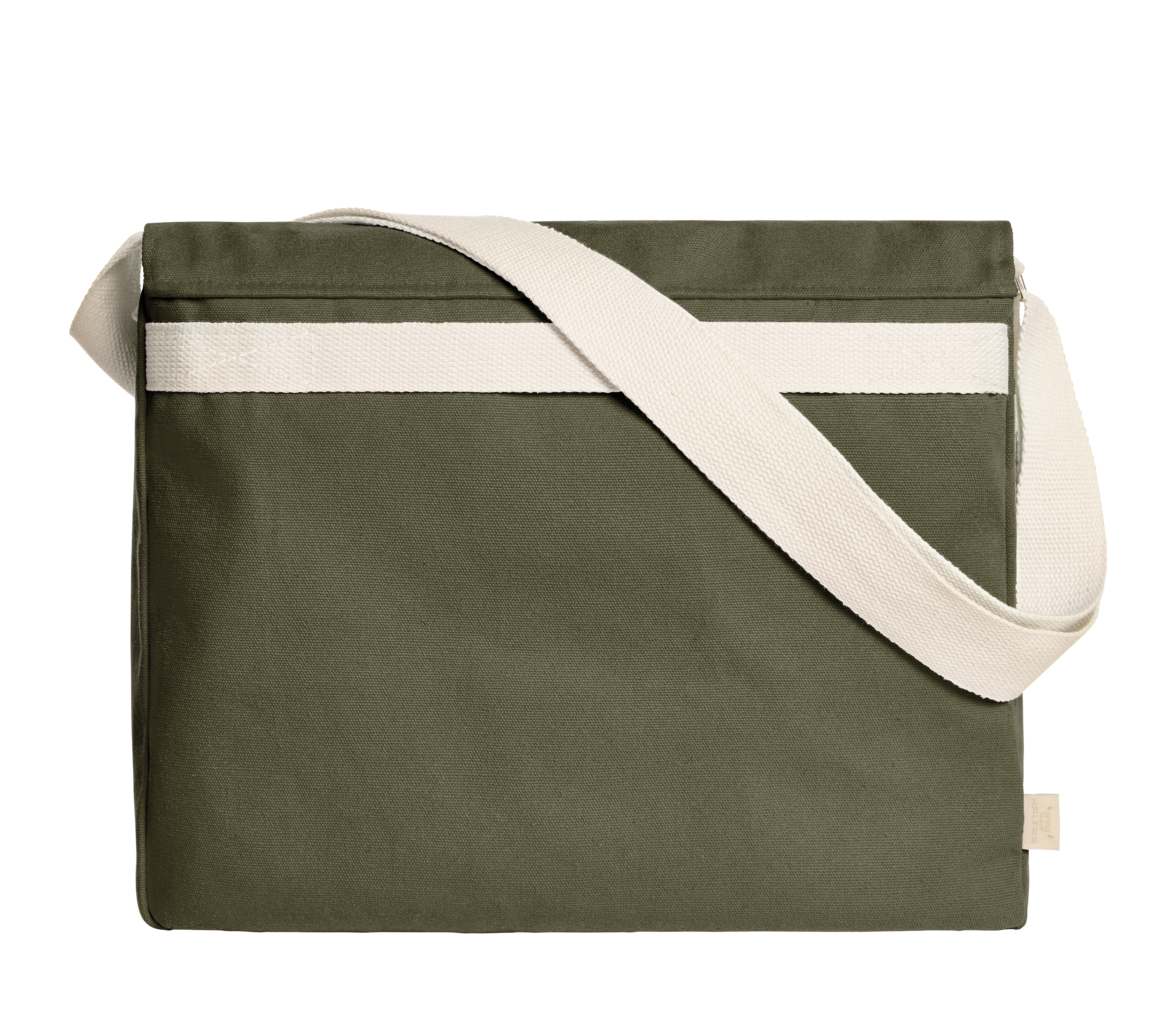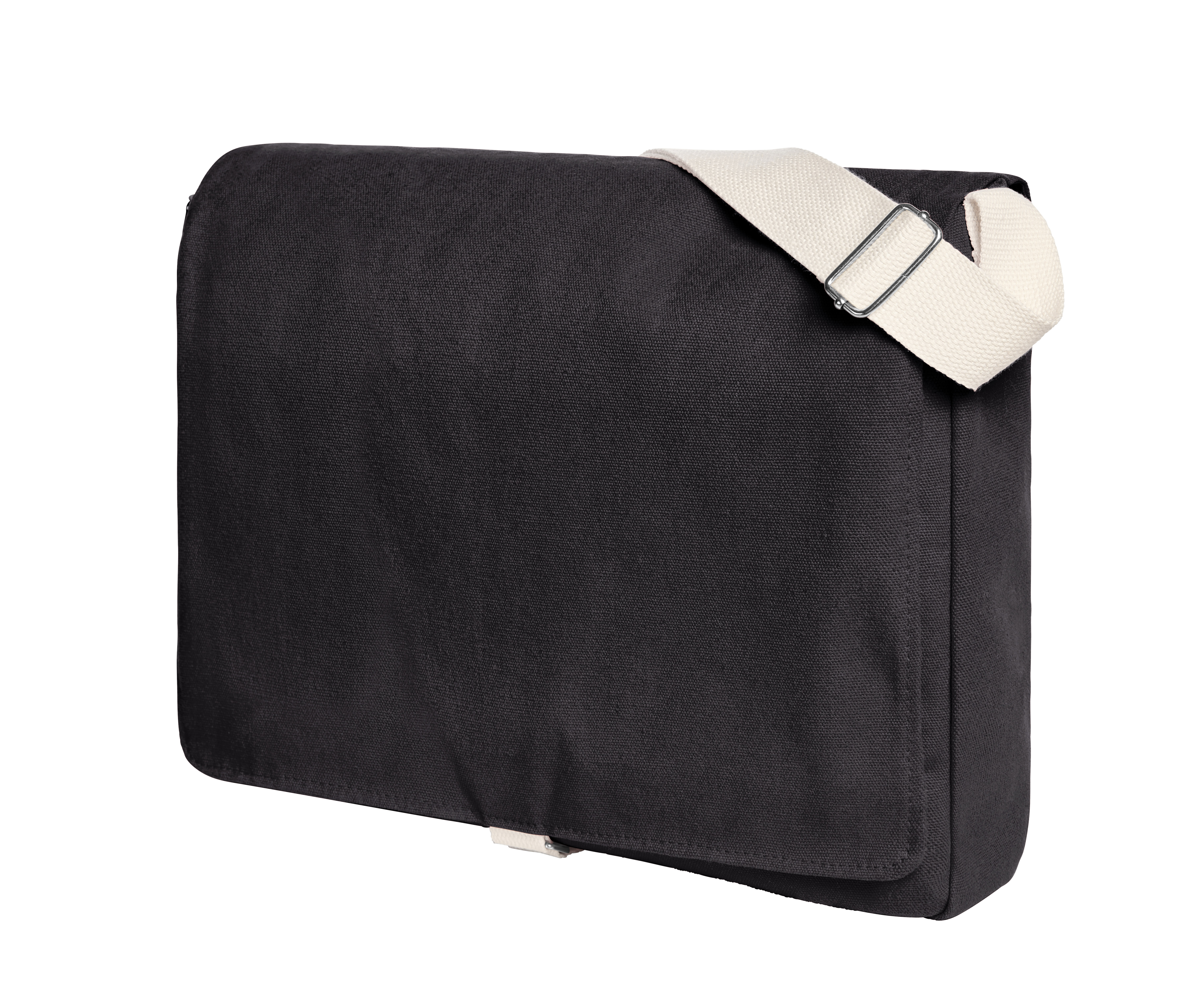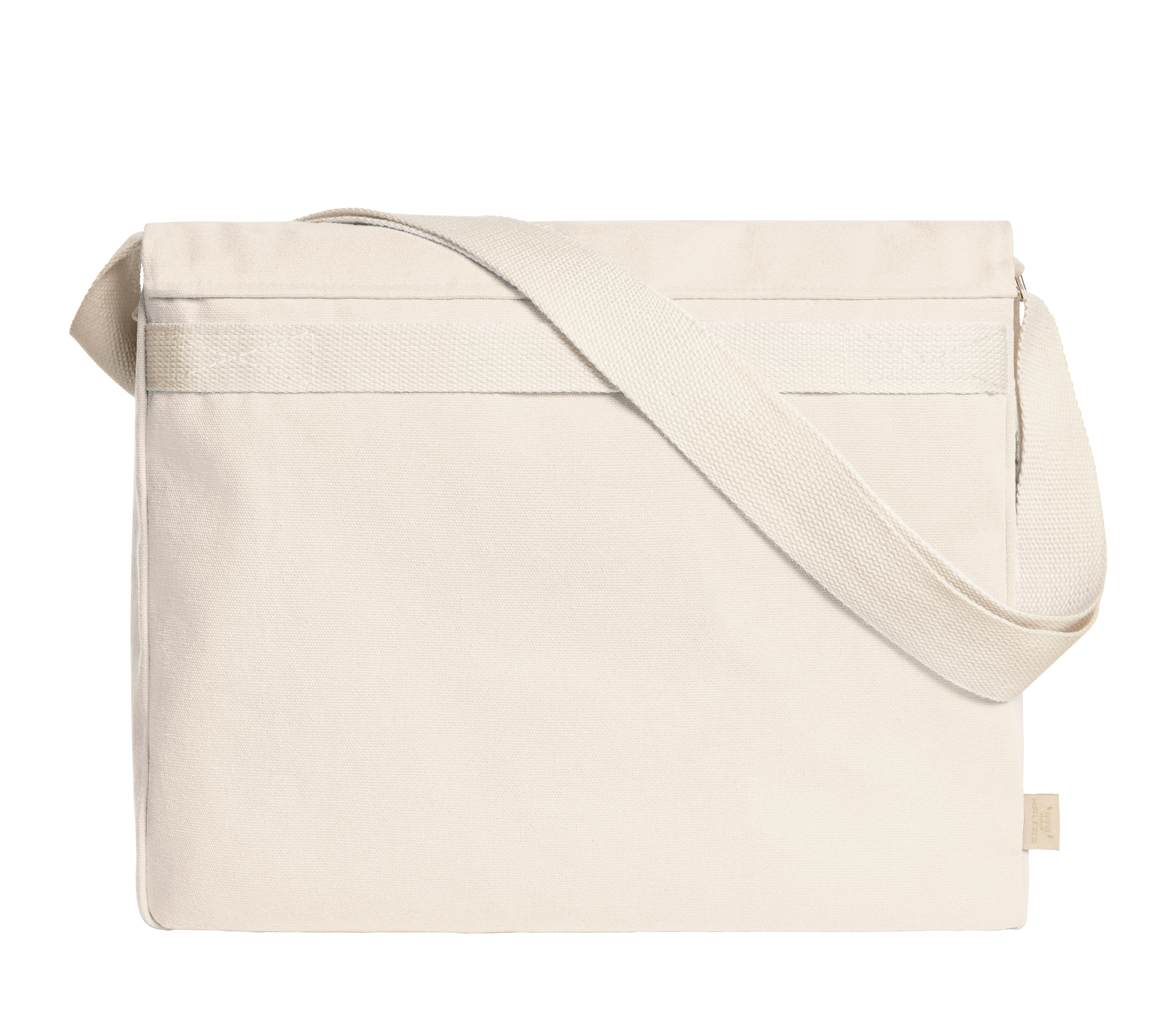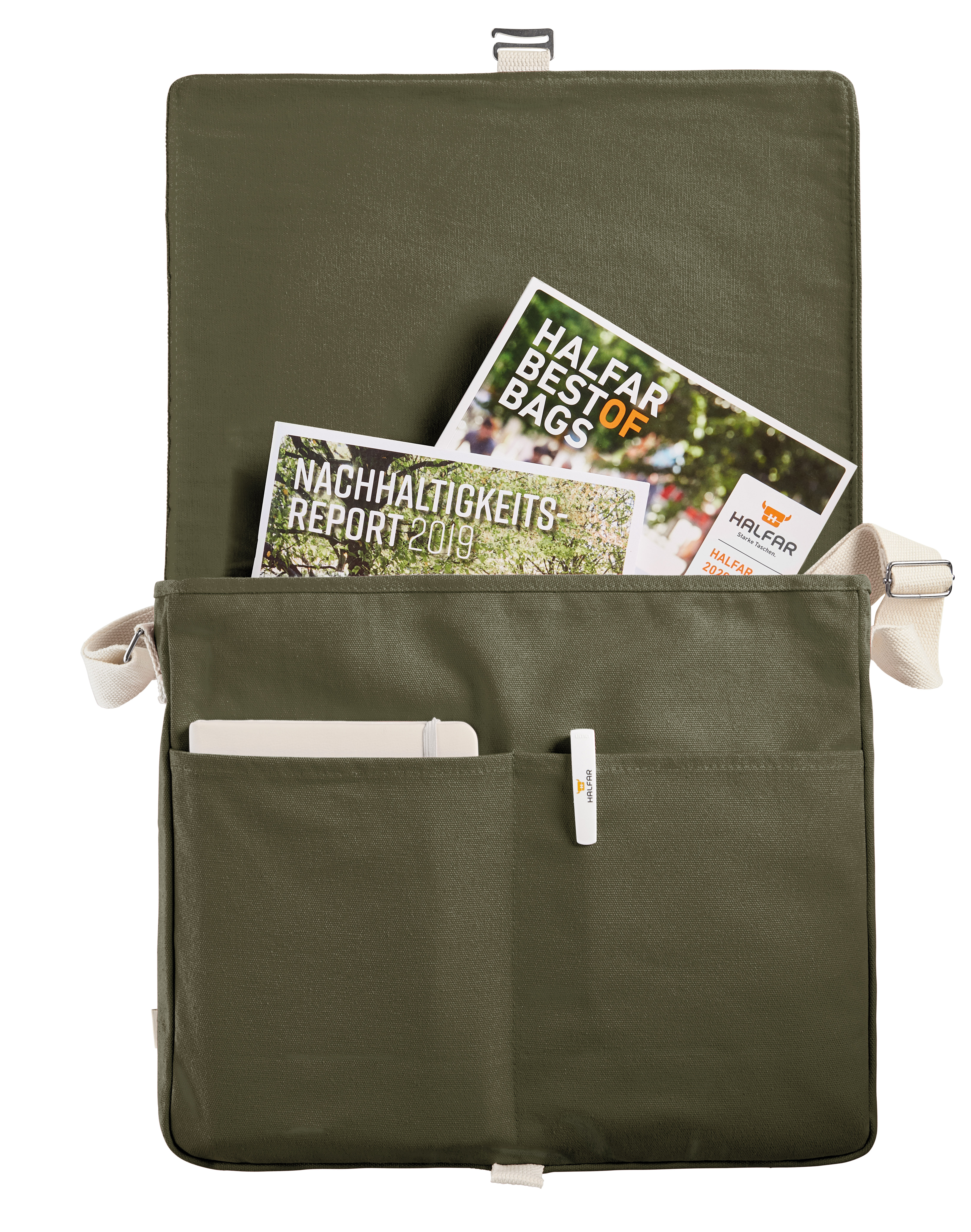 Überschlagtasche mit wertigen Metall-Accessoires; Bügelverschluss; großes Hauptfach u. a. geeignet für A4 Unterlagen; zwei flache Einsteckfächer auf der Front; rückseitige Befestigungsschlaufe für Trolley-Gestänge - alternativ auch als Handgriff nutzbar; breiter, längenverstellbarer Baumwoll-Schultergurt