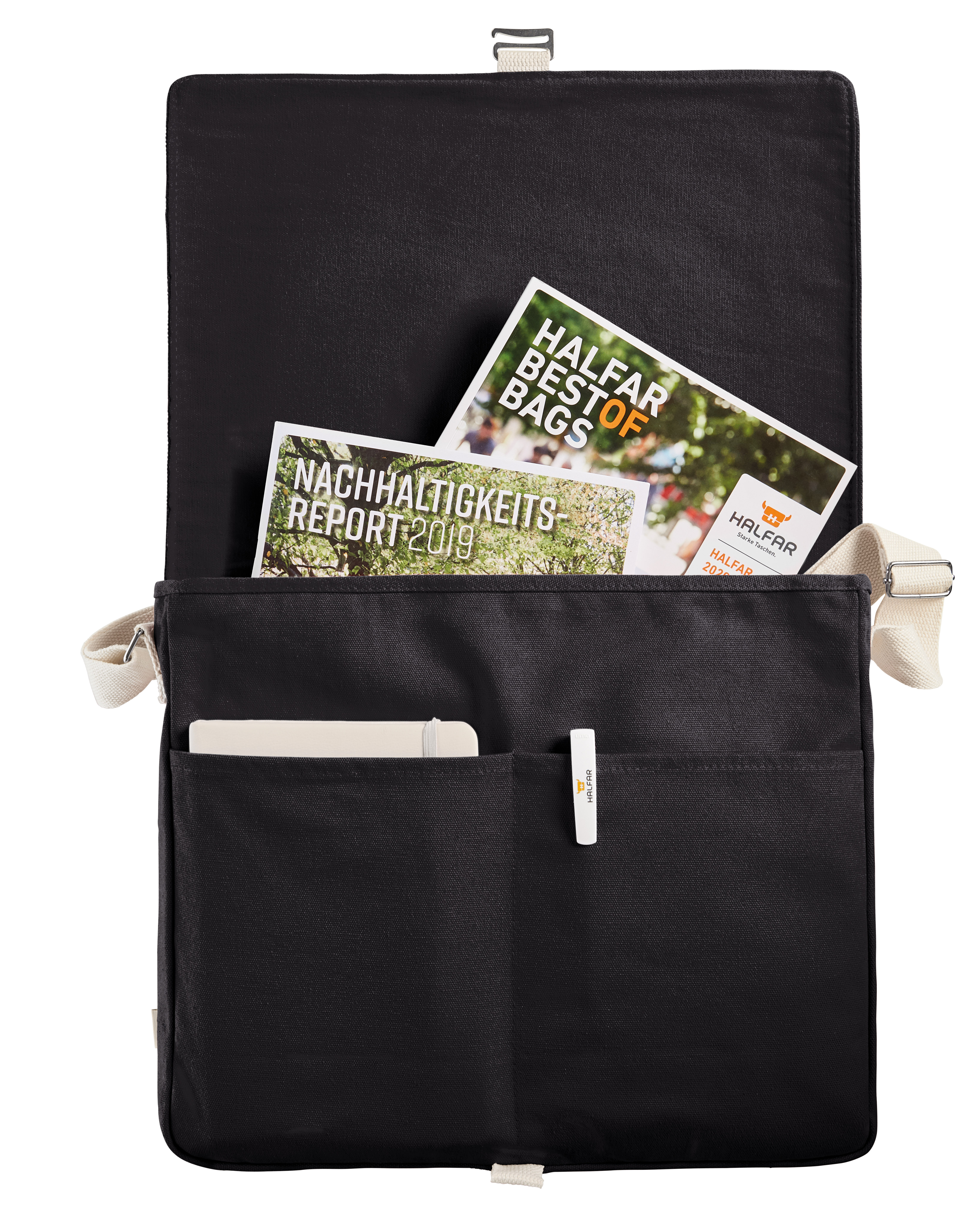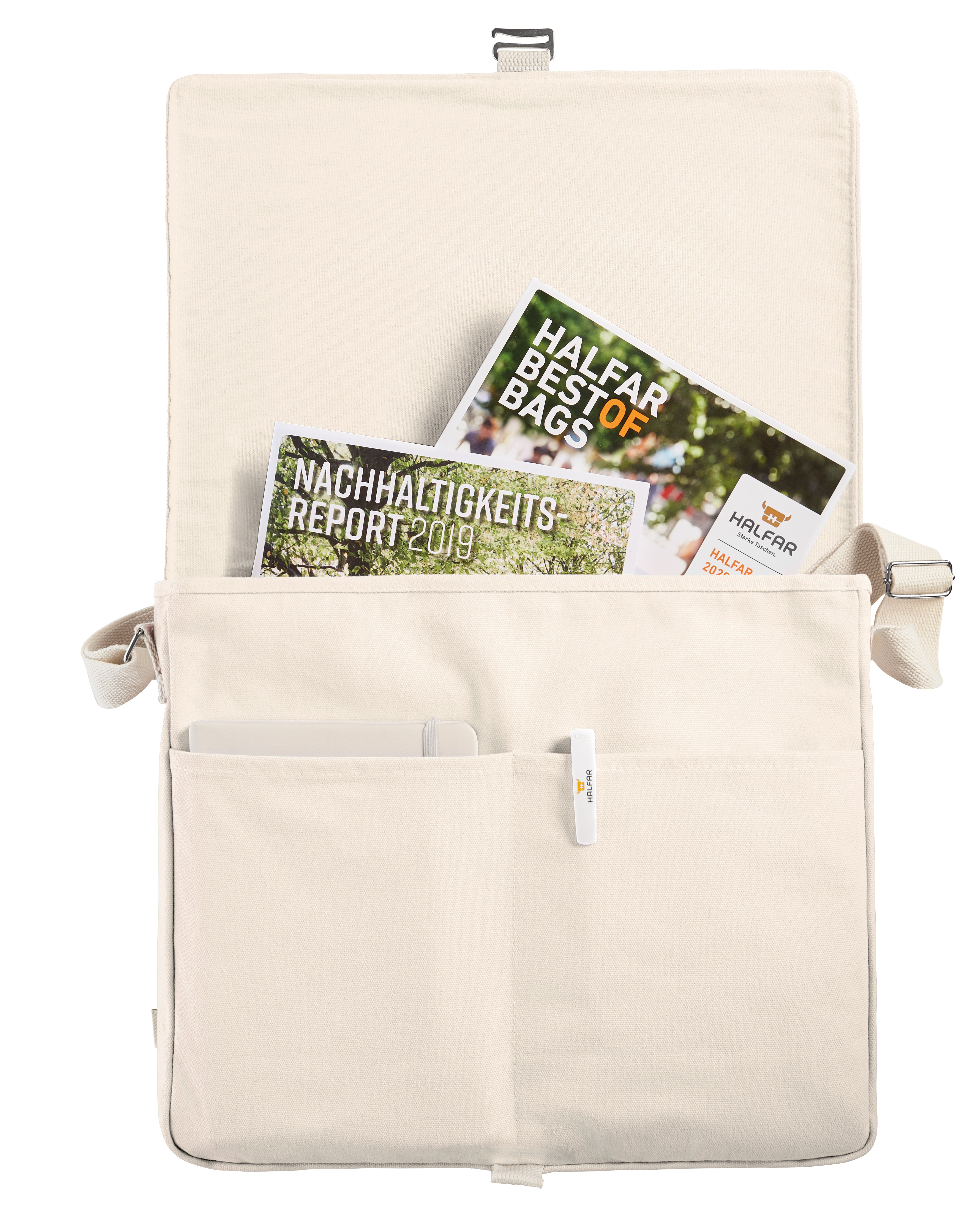 Überschlagtasche mit wertigen Metall-Accessoires; Bügelverschluss; großes Hauptfach u. a. geeignet für A4 Unterlagen; zwei flache Einsteckfächer auf der Front; rückseitige Befestigungsschlaufe für Trolley-Gestänge - alternativ auch als Handgriff nutzbar; breiter, längenverstellbarer Baumwoll-Schultergurt