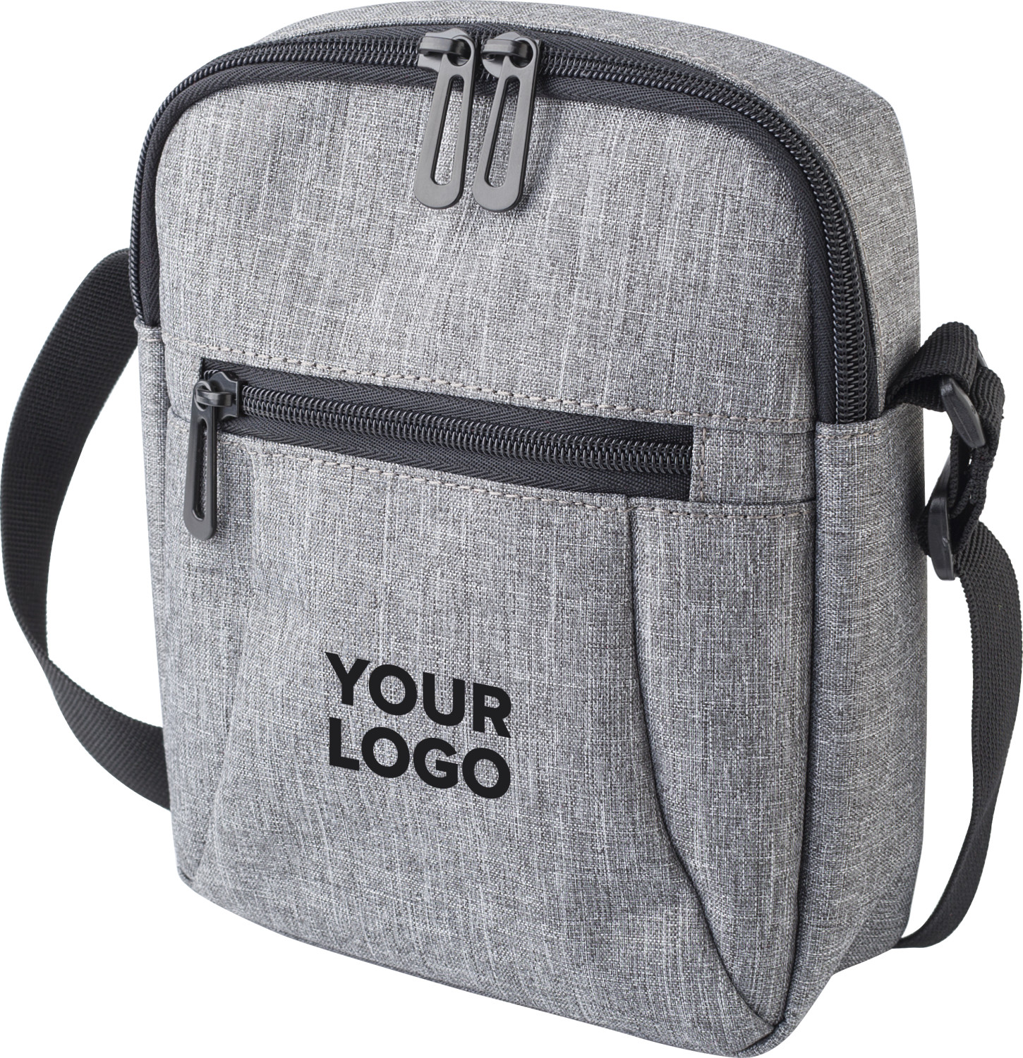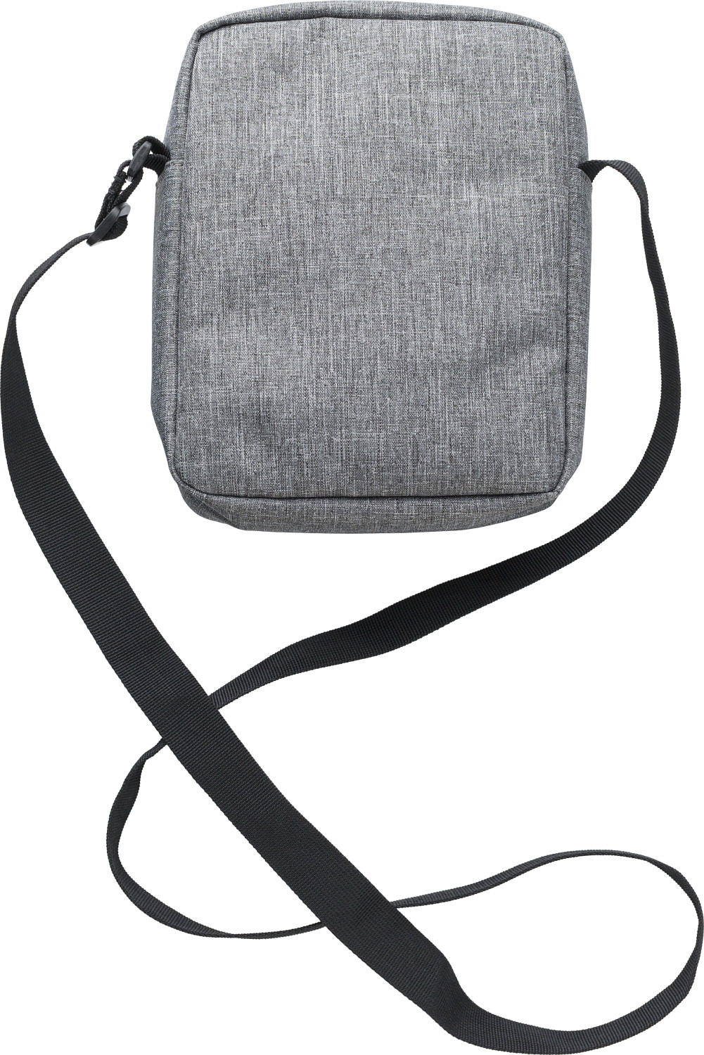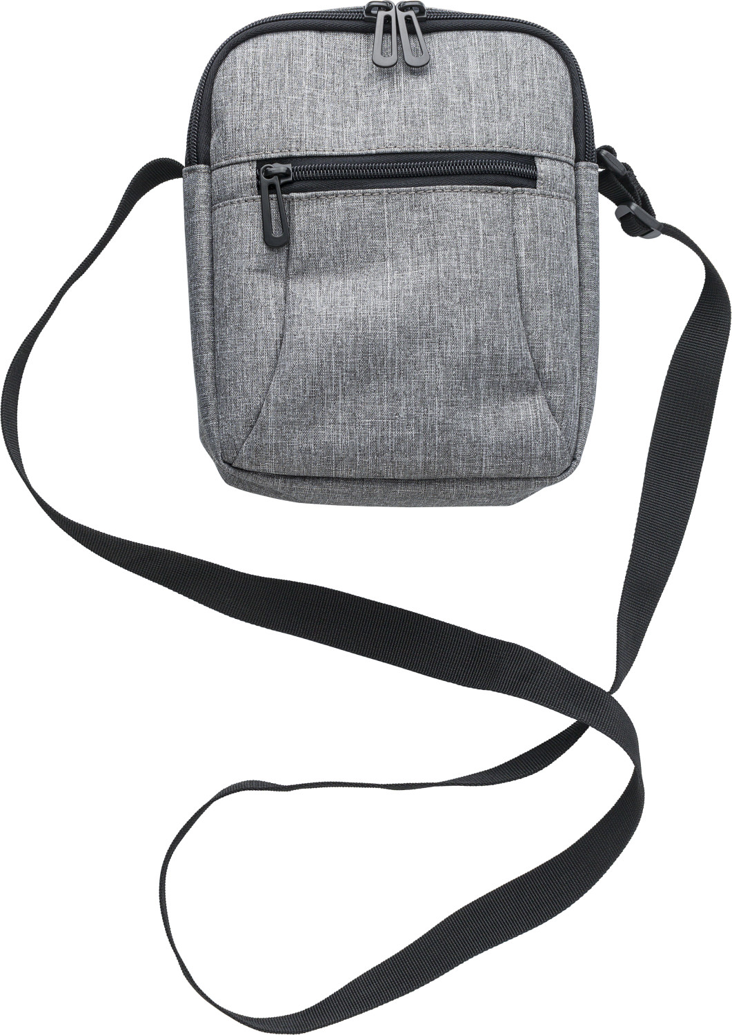 Umhängetasche aus Polyester, klein. Hauptfach und Fronttasche mit Reißverschluss und einer Innentasche. Verstellbarer Schultergurt.