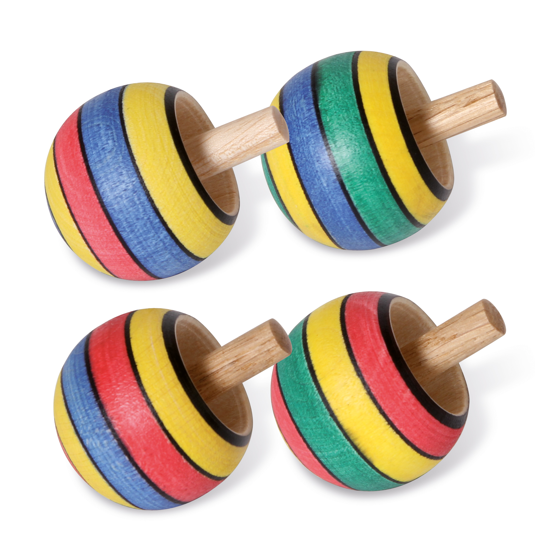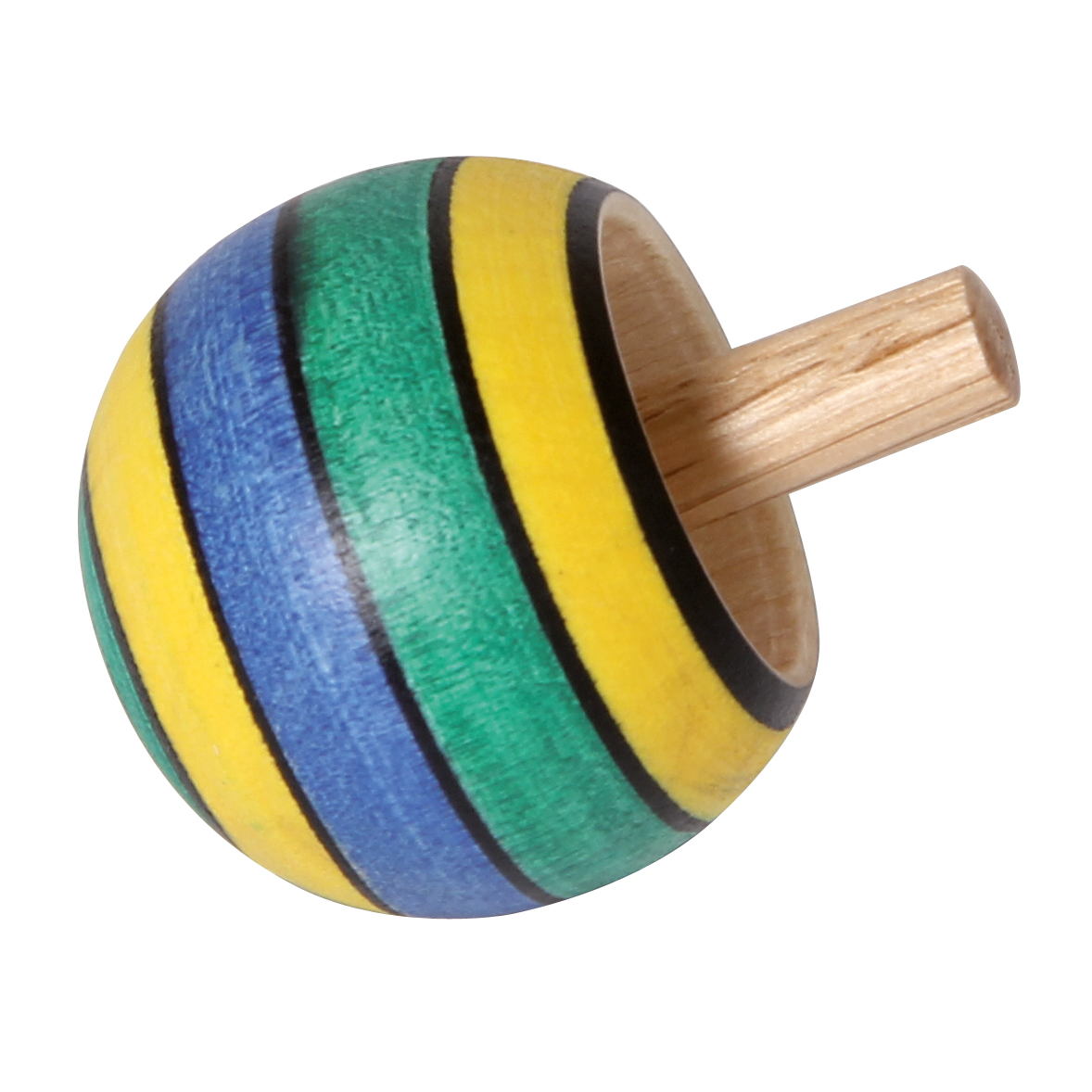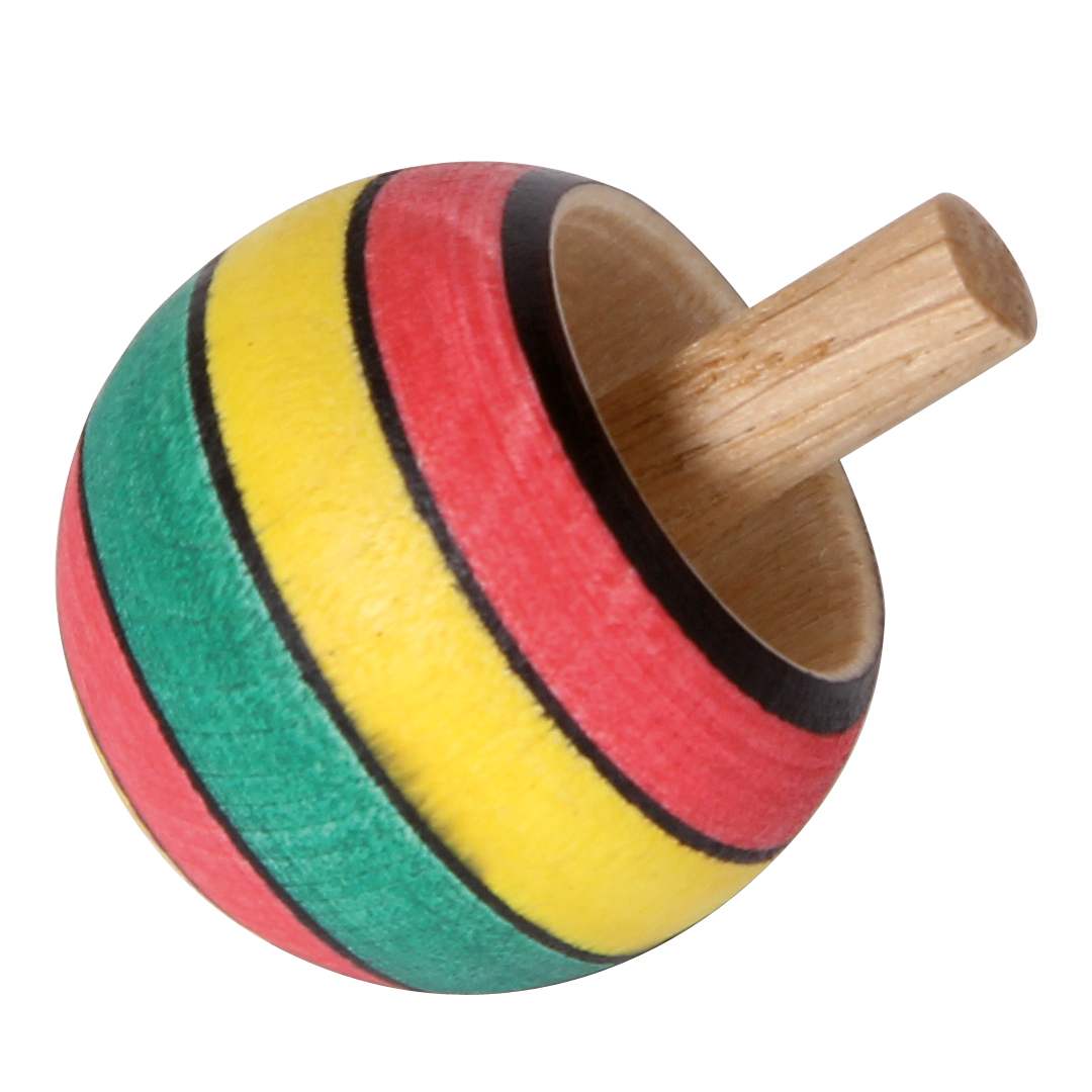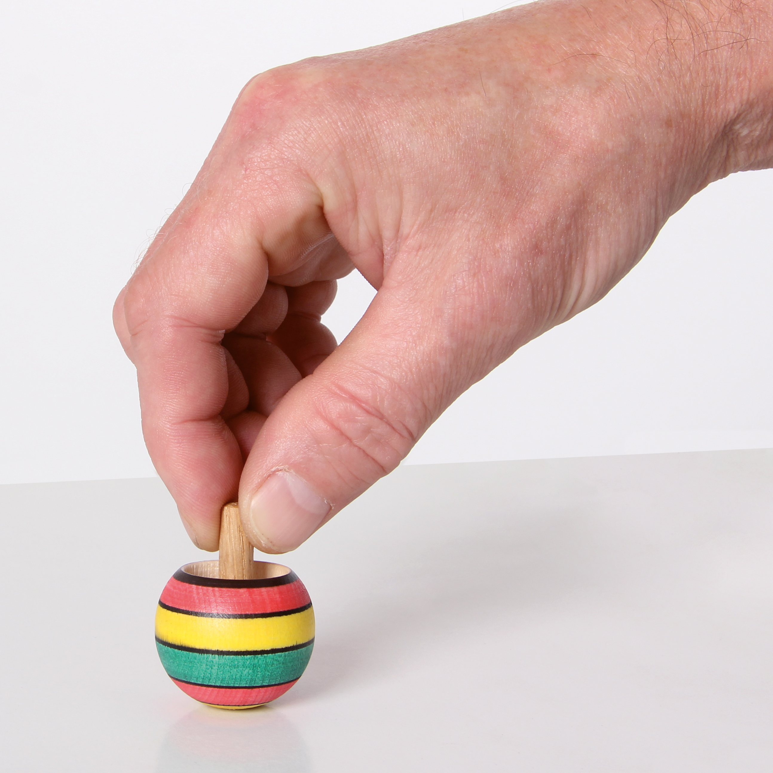 Steh-auf-Kreisel aus Ahorn / Esche. Dreht man den Kreisel schnell genug, dreht er sich um und kreiselt auf dem Stiel weiter! 4 Farbdesigns sortiert.