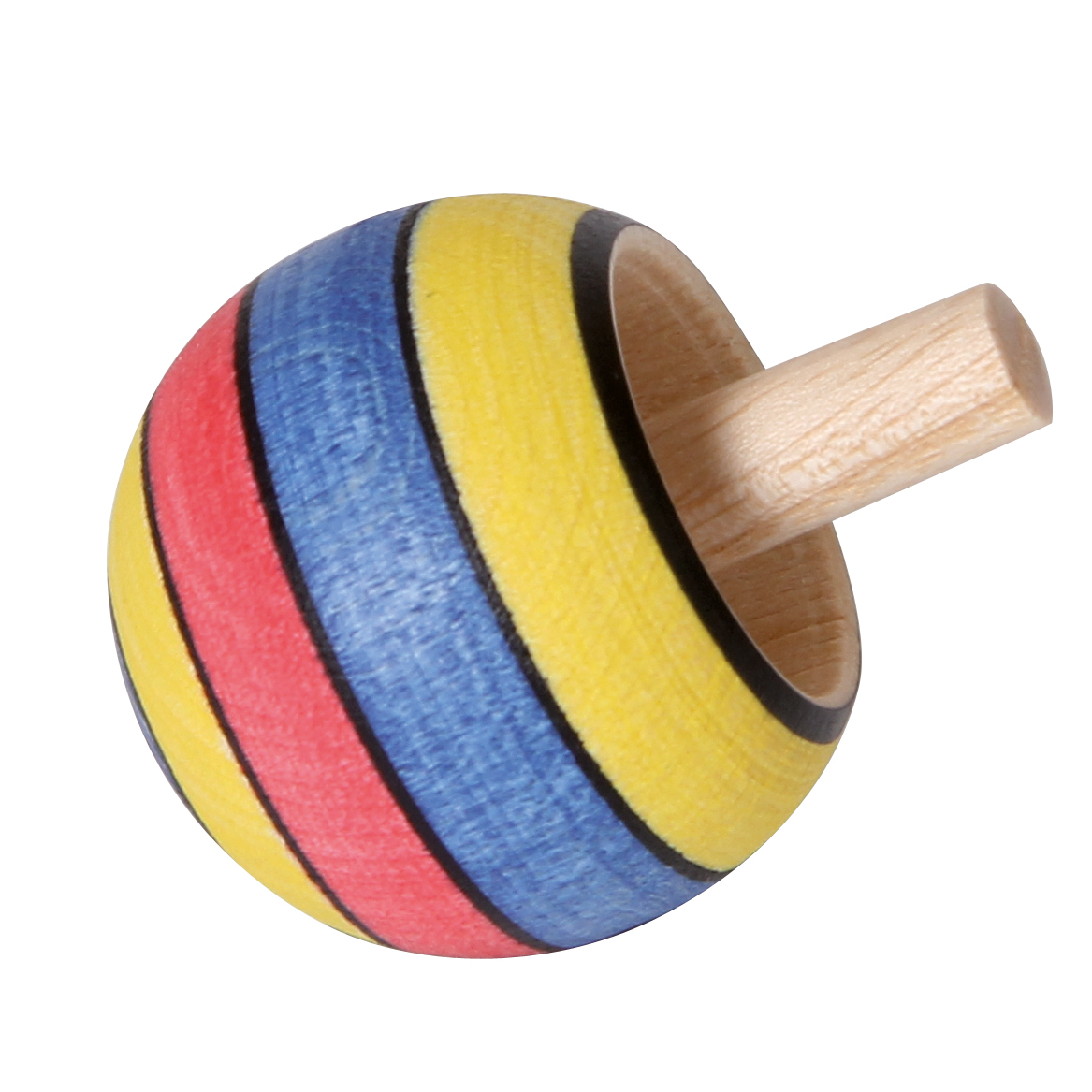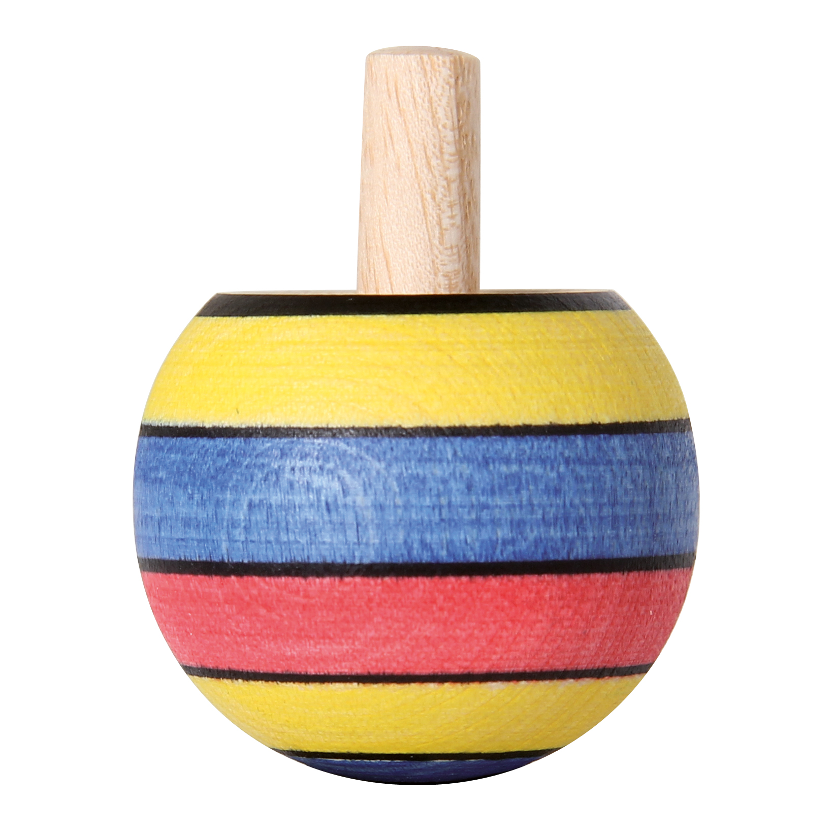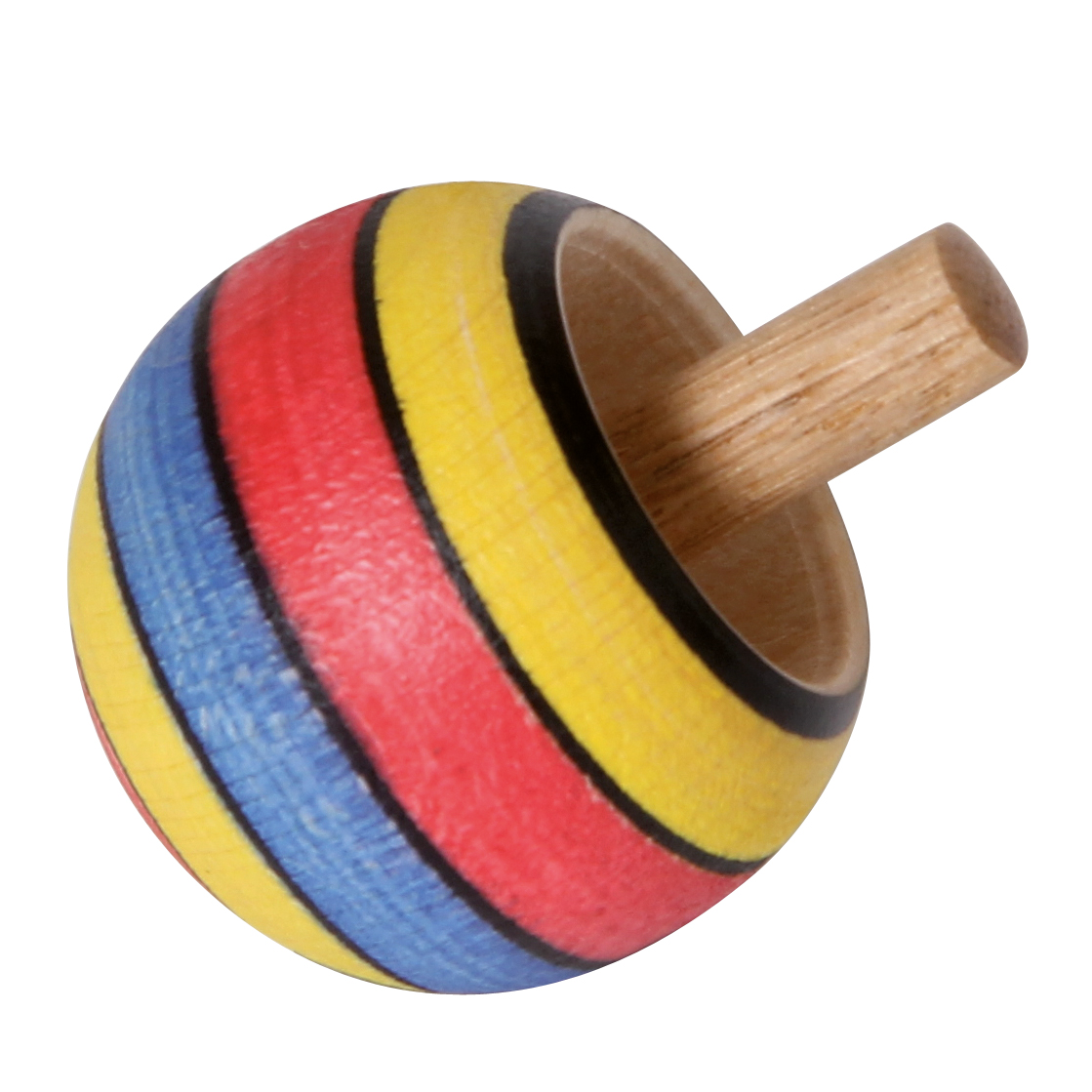 Steh-auf-Kreisel aus Ahorn / Esche. Dreht man den Kreisel schnell genug, dreht er sich um und kreiselt auf dem Stiel weiter! 4 Farbdesigns sortiert.