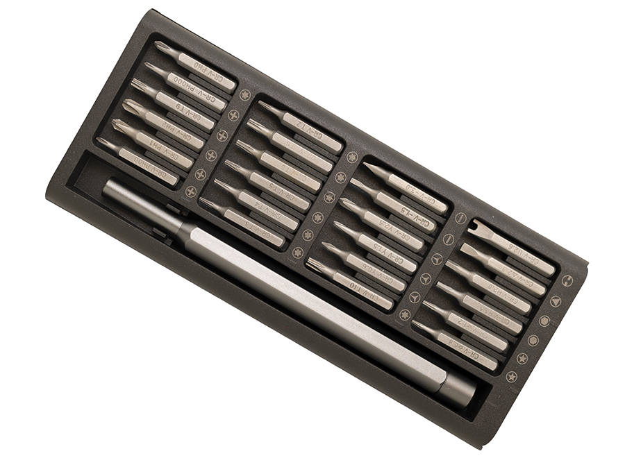 Set mit einem Schraubendreher aus Aluminiumlegierung und 24 verschiedenen C45-Bits: 5 x Kreuzschlitz, 8 x Torx, 3 x Tri-Wing, 2 x Flach, 2 Stern, 2 x Sechskant, 1 x Dreieck und 1 x Schraubenschlüssel (auch 'Schlangenauge' genannt). 12,5 cm Gesamtlänge mit magnetischem Ende und Griffdrehsystem. Die Bits werden durch ein Magnetsystem in der Box gehalten. Öffnen der Box durch Aufschieben. Die Vorteile in Kürze: - 24 verschiedene Bits in einer ultrakleinen und geschützten Box zur Lagerung / Transport. - Magnetisches Ende des Schraubendrehers und Magnetsystem in der Box, damit Sie die Bits nicht verlierern. - Drehbares Griffsystem für einfacheres Schrauben. - C45-Bits für mehr Festigkeit und Haltbarkeit.