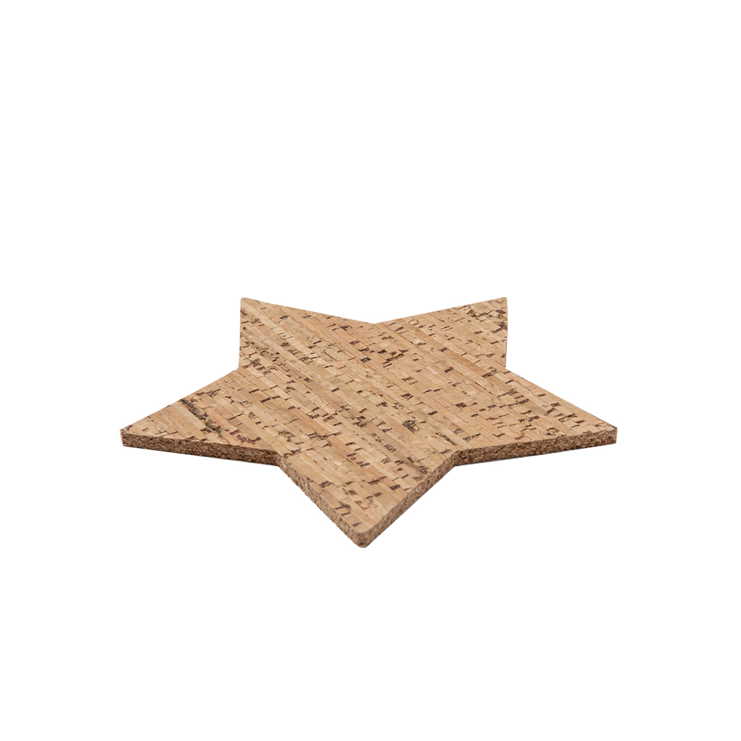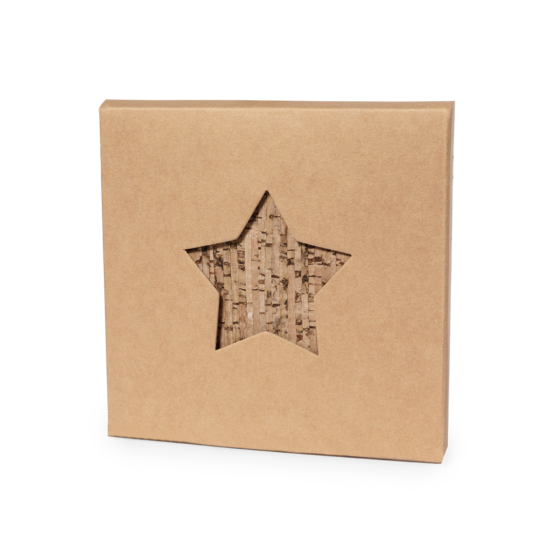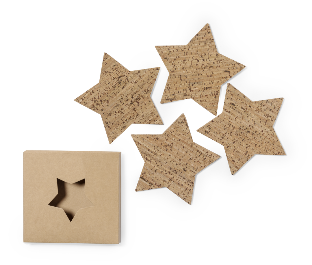 Satz von 4 sternförmigen Untersetzern aus Naturkork. Das Set wird in einer Designbox aus Kraftkarton mit gestanztem Sternmotiv präsentiert. Hergestellt aus pflanzlichen Bestandteilen, um die Verwendung natürlicher Rohstoffe zu fördern und Schadstoffemissionen zu reduzieren.