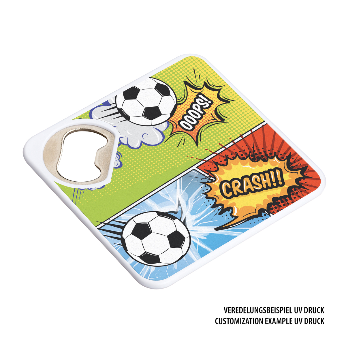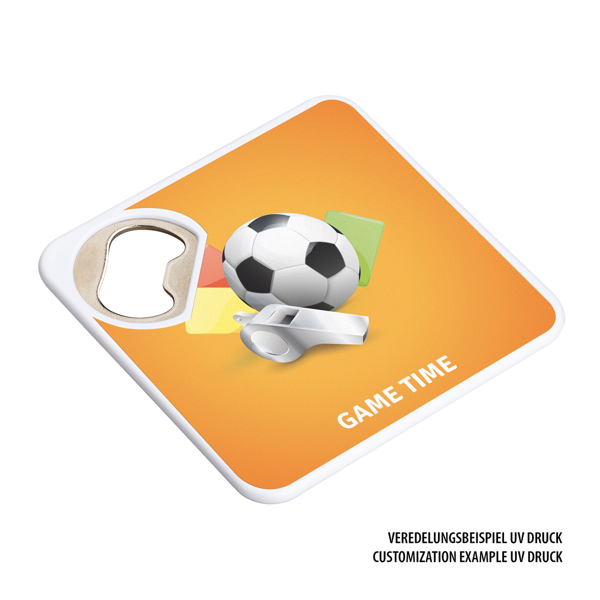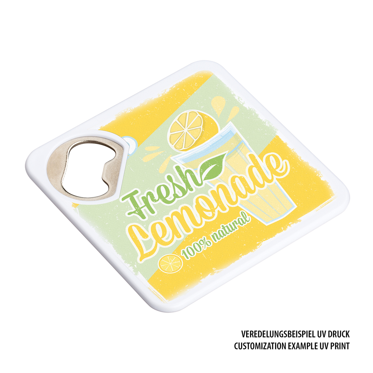 Aus eins mach zwei - Der Untersetzer mit Flaschenöffner hat eine rutschfeste Unterseite und bietet zudem jede Menge Platz für Ihre Werbung!