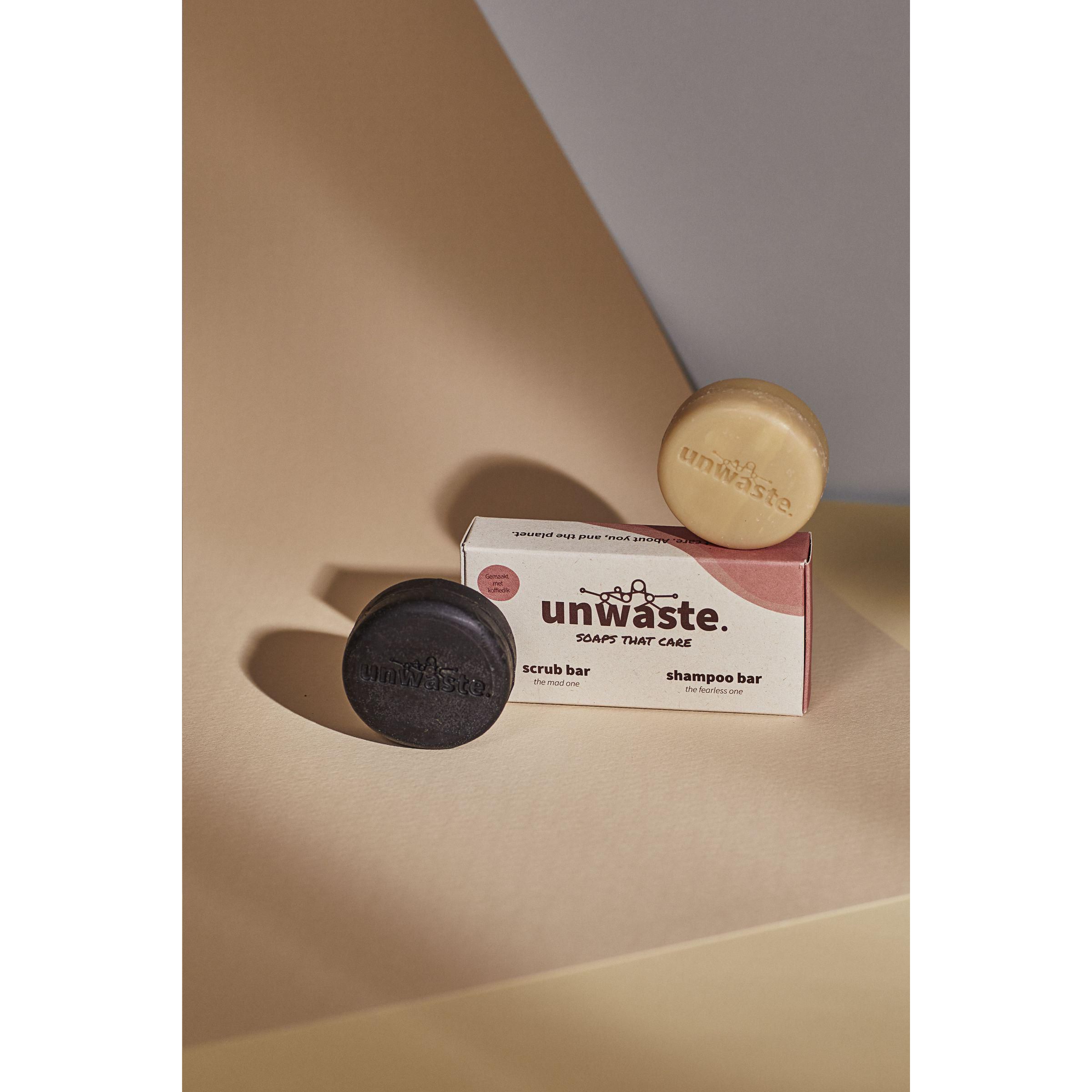 Ein Set bestehend aus einem Peeling-Riegel und einem Shampoo-Riegel in einer Verpackung. Hergestellt von der Marke Unwaste. Der Peeling-Riegel besteht aus Kaffeesatz und Kiefernöl, das Shampoo-Stück aus Kaffeeöl. Eigenschaften: ein angenehmer natürlicher Duft, die Reinigungskraft und die Farbe von Kaffee. Die Inhaltsstoffe sind natürlichen Ursprungs. Die Produkte sind vegan, tierversuchsfrei und zu 100% (mikro-)plastikfrei. Made in Holland. Verpackt pro Set in einem Karton aus 100% landwirtschaftlichen Abfällen.