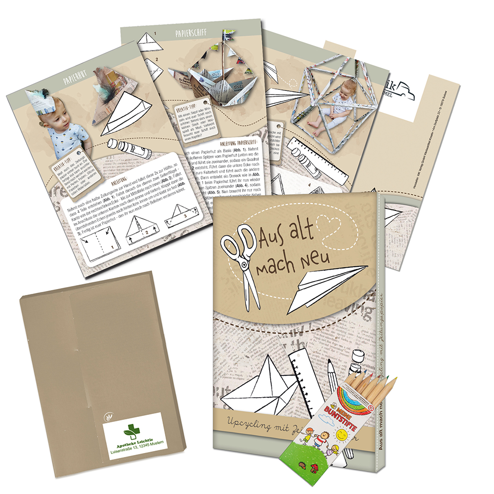 Mit unseren Upcycling-Sets lernen Groß und Klein, wie aus alten Dingen neue, kreative Schätze entstehen. Das 20-seitige Heft bietet liebevoll gestaltete Illustrationen und einfache Bastelanleitungen, die den Gedanken der Wiederverwendung fördern und zur Kreativität anregen. Die Sets enthalten zusätzlich eine praktische 6er-Buntstiftbox in einer ansprechend gestalteten Kartonverpackung. Geliefert wird das Set in einer hochwertigen, buchförmigen Mappe. Die Varianten: • Standardausführung: Ab Lager lieferbar, optional mit zusätzlichem Logoeindruck. • Individuelle Gestaltung: Ab 500 Stück mit personalisierten Außenseiten für ein einzigartiges Design