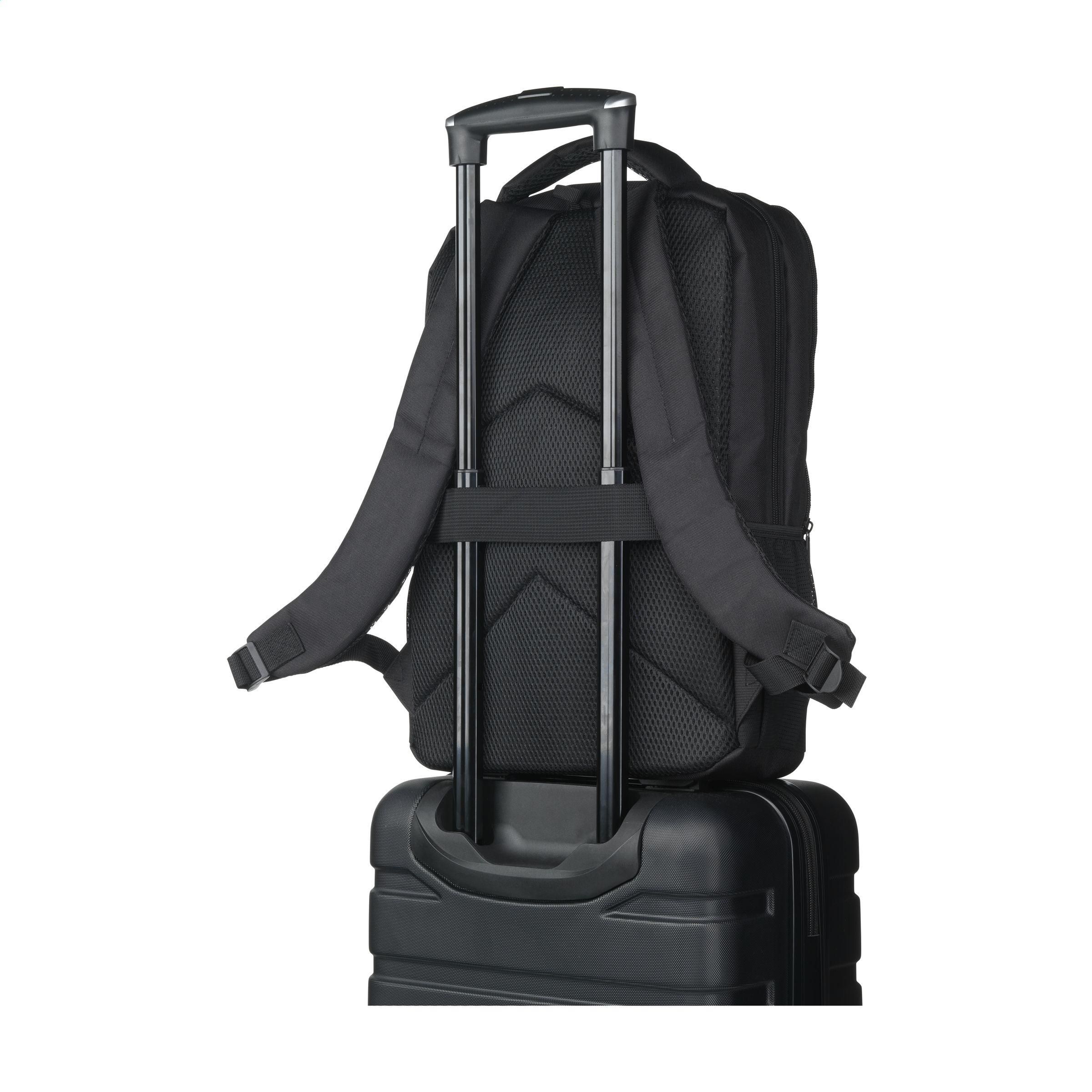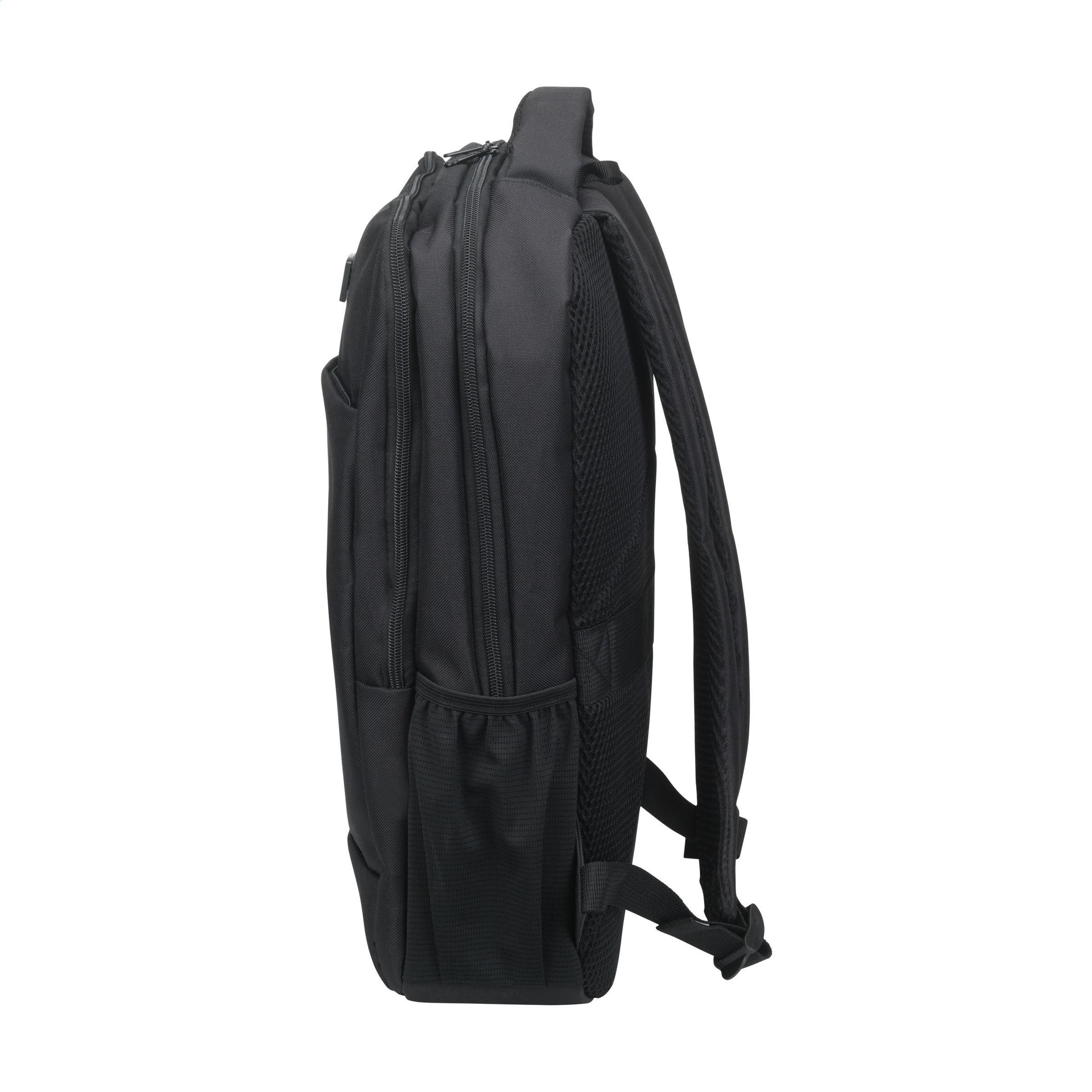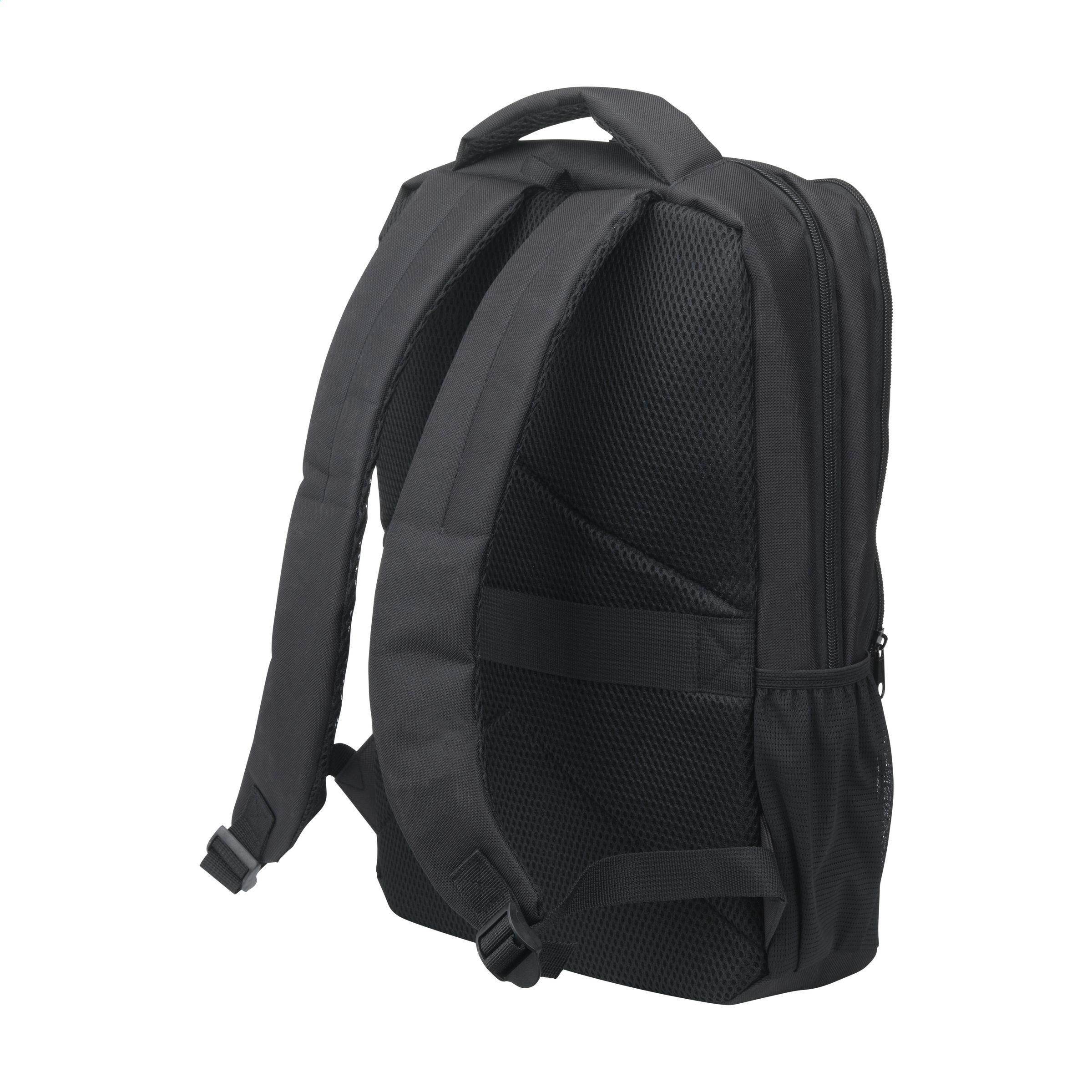 Solider Rucksack aus robustem RPET-Polyester. Mit 2 großzügigen Fächern. Das erste Fach bietet viel Platz und mehrere Taschen zur übersichtlichen Organisation von Zubehör. Das zweite Fach hat ein Schaumstoff-Schutzfach für den sicheren Transport eines Laptops bis 15,6 Zoll. Mit einer zusätzlichen Reißverschlusstasche auf der Vorderseite und einer Netztasche auf beiden Seiten. Die verstellbaren Schultergurte, das Rückenteil und der Tragegriff sind mit Netzstoff gepolstert und mit Schaumstoff für zusätzlichen Tragekomfort ausgestattet. Mit zusätzlicher Schlaufe zum Befestigen des Rucksacks an einem Trolley, robusten Reißverschlüssen, vollständig gefüttert und sauber verarbeitet. Ein Luxus-Rucksack mit vielen Extras. GRS-zertifiziert. Gesamtes recyceltes Material: 90%. Fassungsvermögen ca. 12 Liter.