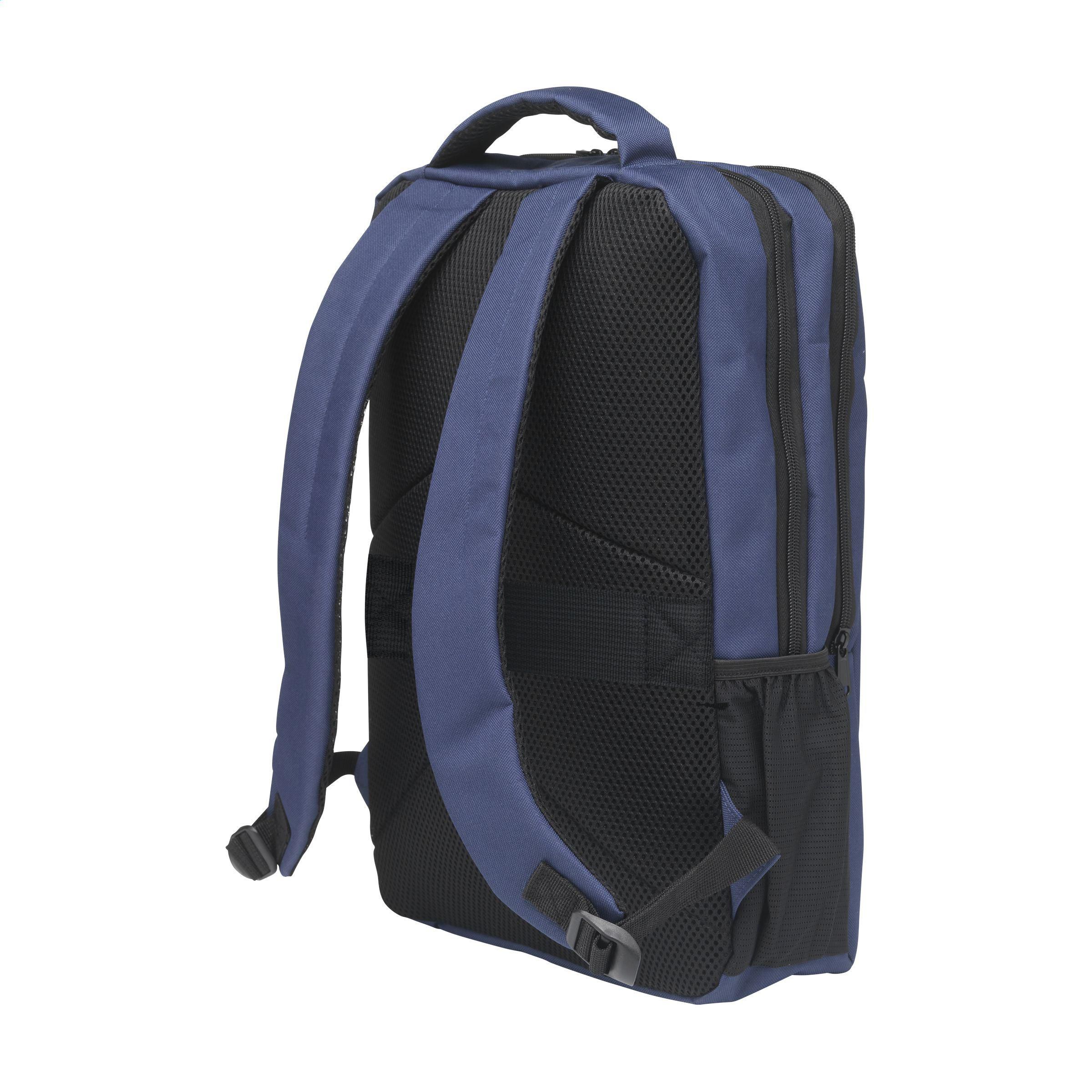 Solider Rucksack aus robustem RPET-Polyester. Mit 2 großzügigen Fächern. Das erste Fach bietet viel Platz und mehrere Taschen zur übersichtlichen Organisation von Zubehör. Das zweite Fach hat ein Schaumstoff-Schutzfach für den sicheren Transport eines Laptops bis 15,6 Zoll. Mit einer zusätzlichen Reißverschlusstasche auf der Vorderseite und einer Netztasche auf beiden Seiten. Die verstellbaren Schultergurte, das Rückenteil und der Tragegriff sind mit Netzstoff gepolstert und mit Schaumstoff für zusätzlichen Tragekomfort ausgestattet. Mit zusätzlicher Schlaufe zum Befestigen des Rucksacks an einem Trolley, robusten Reißverschlüssen, vollständig gefüttert und sauber verarbeitet. Ein Luxus-Rucksack mit vielen Extras. GRS-zertifiziert. Gesamtes recyceltes Material: 90%. Fassungsvermögen ca. 12 Liter.