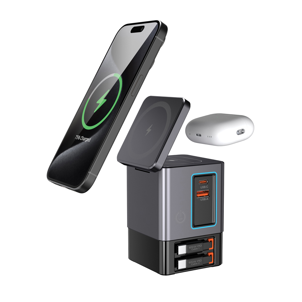 Die All-in-One-Power-Solution. Sacramento ist eine 105W-GaN-Ladestation, die maximale Leistung mit integriertem Komfort verbindet. Mit zwei integrierten, einziehbare 65W-USB-C-Kabel, sodass Sie immer schnell aufladen können – ganz ohne zusätzliche Kabel. Sacramento verfügt zudem über einen USB-A- und einen USB-C-Anschluss, sodass Sie insgesamt vier Output-Optionen zum gleichzeitigen Laden von Laptops, Tablets, Smartphones und mehr haben. Für Ihre kabellosen Geräte ist Sacramento mit einem leistungsstarken 15W-Magnet-Wireless-Charger ausgestattet, der Ihr Smartphone sicher an seinem Platz hält, sowie einem separaten Wireless-Pad, das speziell für kleinere Geräte wie Ohrhörer oder AirPods (max. 5W) entwickelt wurde. Sacramento wird aus RCS-zertifiziertem (Recycled Claim Standard) recyceltem, feuerfestem PC hergestellt. Gesamtanteil an recycelten Materialien: 26 % bezogen auf das Gesamtgewicht des Artikels.
