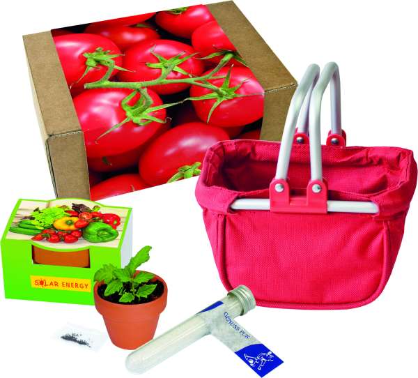 Unser Utensilo Korb bietet ein komplettes Anzucht-Set für gesunde Naschtomaten. Mit dem Meersalz gibt es die Würze gleich dazu. Ein leckeres Rezept für die Tomaten befindet sich auf der Banderole. Einen Eindruck in das Standardmotiv oder eine eigene Gestaltung ist jeweils ab 250 Stück möglich.