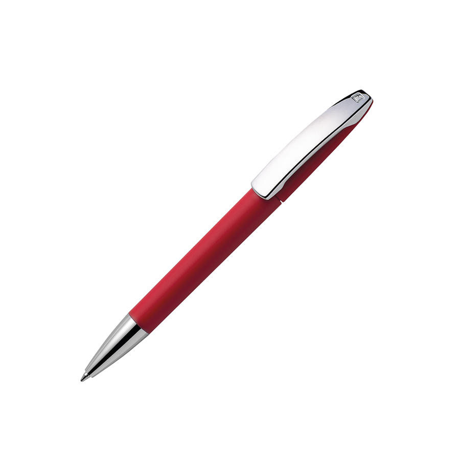 VIEW V1 GOM C CR Kugelschreiber Maxema, Ästhetik und Kraft in VIEW vereint -Die gummierte Oberfläche des schlanken, fast zierlich anmutenden Gehäuses gewinnt noch an Ausstrahlung durch den auffallend kräftigen Clip, wie die Spitze gefertigt aus glänzendem, silberfarbenem Metall. Die Ober- und Unterseite des Gehäuses sind lieferbar in 18 verschiedenen Farben, die bereits ab 2.000 Stück miteinander kombinierbar sind. Er ist ausgestattet mit einer blauschreibenden Großraummine. Dieser Kugelschreiber ist ausschließlich auf dem Clip zu bedrucken oder zu gravieren !