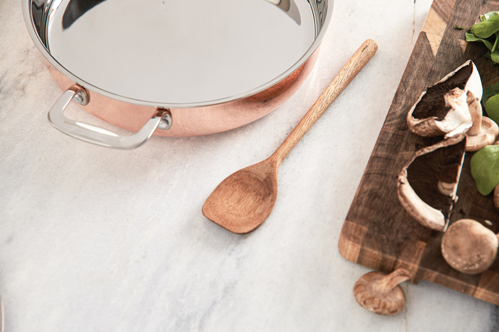Exklusive dreilagige Kupfer-Sautierpfanne mit Deckel. Die erste Schicht ist die Außenseite aus Kupfer, die Innenseite besteht aus einer Aluminiumschicht und einer Schicht aus rostfreiem Stahl, wodurch sie leicht zu reinigen ist. Die Kupfer- und Aluminiumschichten leiten die Wärme extrem gut, so dass sich die Pfanne schnell und gleichmäßig erhitzt. Der Boden wurde mit einer dickeren Edelstahlplatte verstärkt, die die Verwendung auf einem Induktionskochfeld ermöglicht. Die Pfanne hat einen Griff aus Edelstahl, der beim Kochen kühl bleibt. Geeignet für alle Herdarten. Spülmaschinenfest. Ein nachträglicher Druck wird einer Spülmaschine jedoch nicht standhalten.
