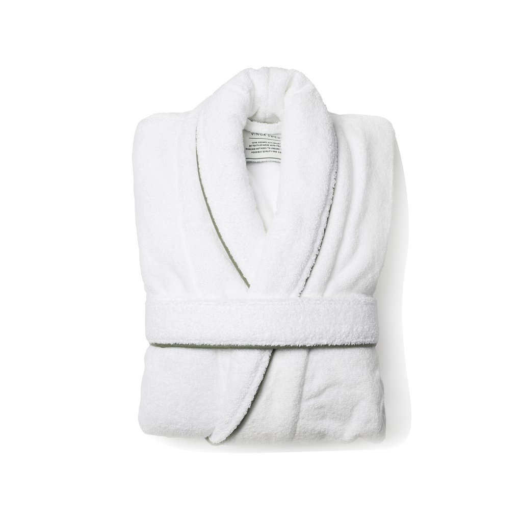 Luxuriöser Bademantel aus 100 % Baumwolle. Der Bademantel ist ein klassisches Modell mit extra breitem Kragen und Gürtel an der Taille. Er verfügt zudem über einige schöne Details, wie geschlossene Nähte und kontrastierende Paspeln am Kragen. Hergestellt aus einer langen Baumwollfaser mit umgedrehten Fäden. Das Ergebnis ist ein unglaublich weicher Bademantel, den Sie nie wieder ausziehen möchten. OEKO-TEX® STANDARD 100. 09. HIN.68091. Hohenstein HTTI.