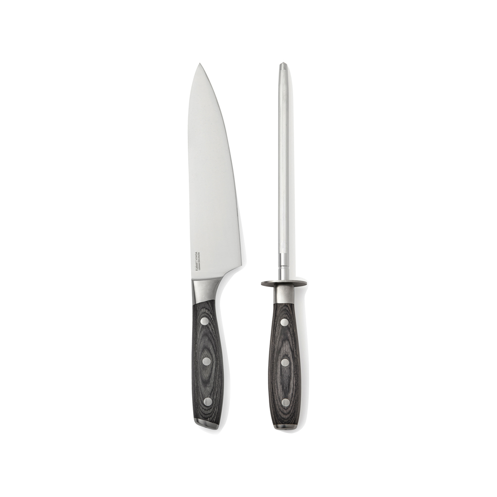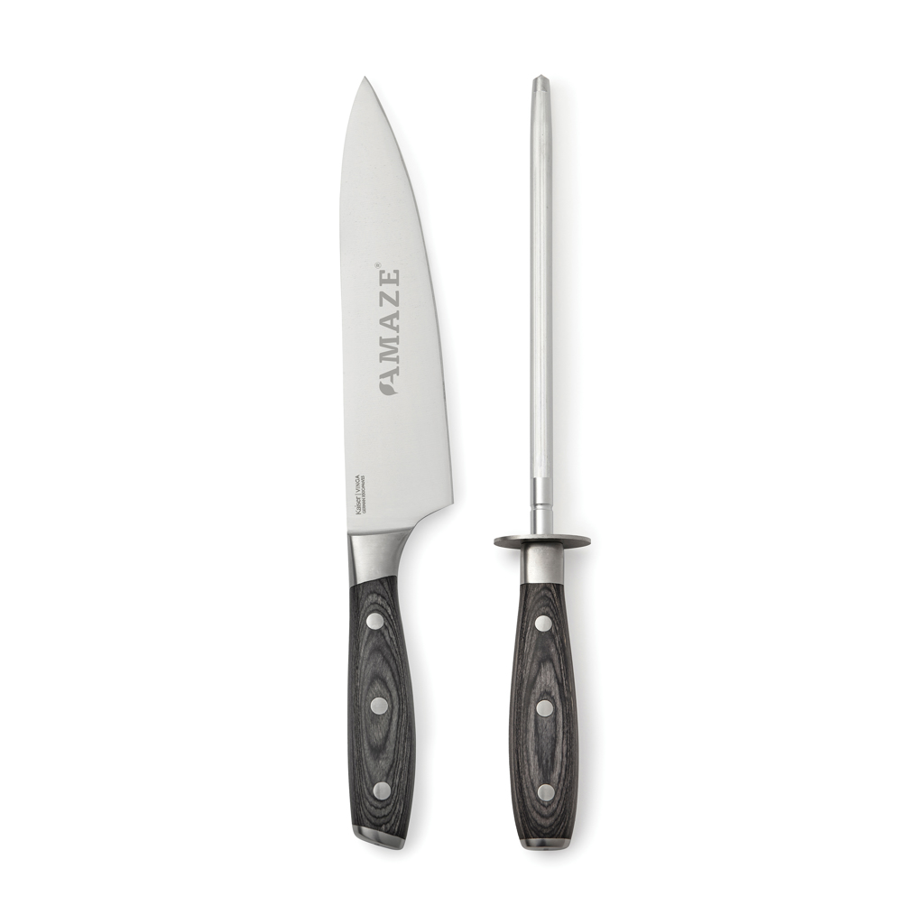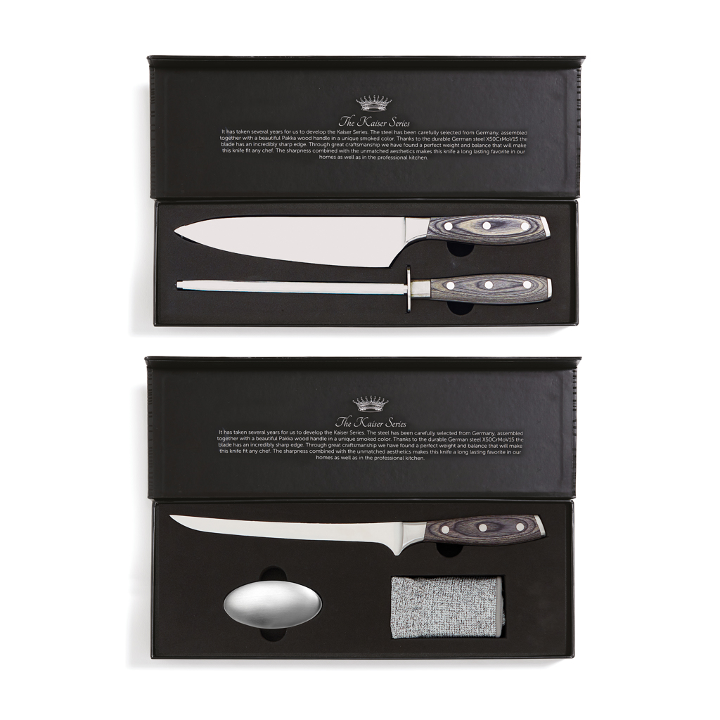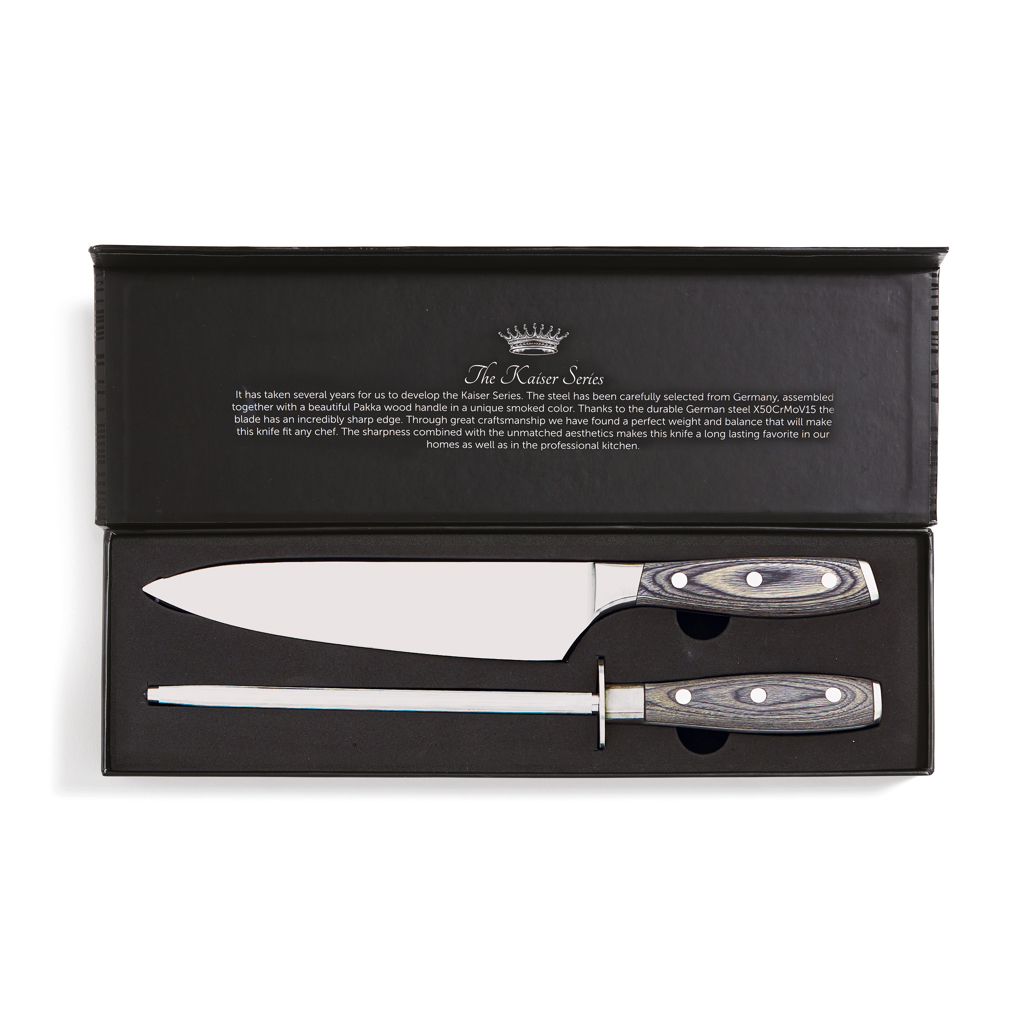 Kochmesser und Wetzstahl aus der Kaiser-Serie. Das Messer besteht aus deutschem X50CrMoV15 Stahl und der Griff ist aus Pakkaholz. Der Griff ist ergonomisch und macht das Messer durch die ausbalancierte Masse vom Griff zur Klinge bequemer und einfacher zu handhaben. Die ausgezeichneten Eigenschaften des deutschen Stahles machen das Messer einerseits fleckenabweisend und stellen andererseits keine höheren Ansprüche an die Pflege als gelegentliches Schärfen.