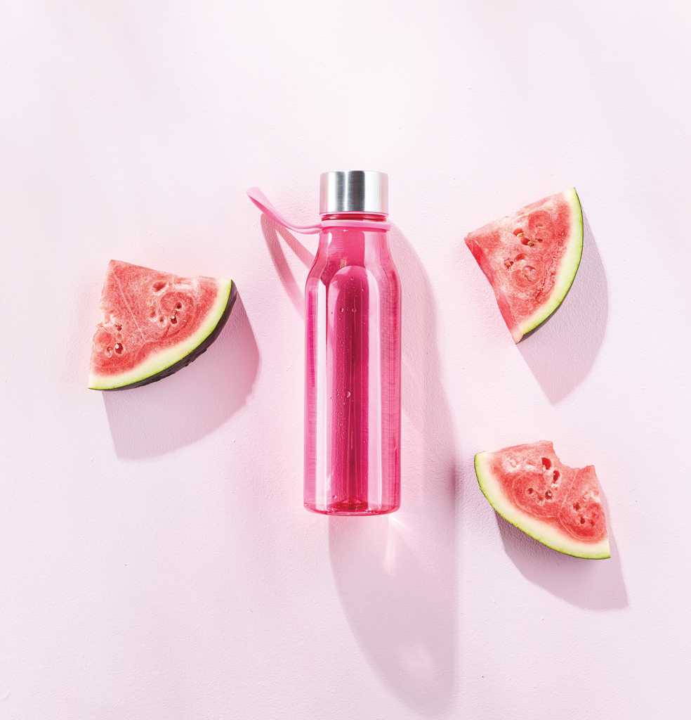 Wasserflasche aus BPA-freiem Triphenylmethan. Durch die Schlaufe am Verschluss lässt sich die Flasche leicht an Trainingsgeräte hängen, durch die schmale Form passt die Flasche in die meisten Becherhalter. Die Flasche lässt sich leicht reinigen und zudem leicht bedrucken. Nur Handwäsche. Inhalt: 600ml