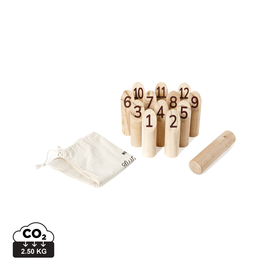 Ein lustiges und taktisches Outdoor-Spiel mit zwölf nummerierten Hütchen und einem Wurfstab. Ziel des Spiels ist es, als Erster genau 50 Punkte zu erreichen. Das Spiel ist in einer Baumwolltasche mit Netzrückseite verpackt, wodurch es leicht zu transportieren ist. Eine vollständige Bedienungsanleitung ist enthalten.