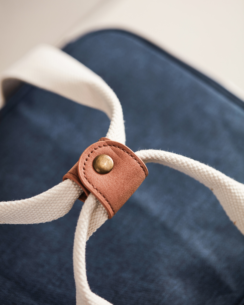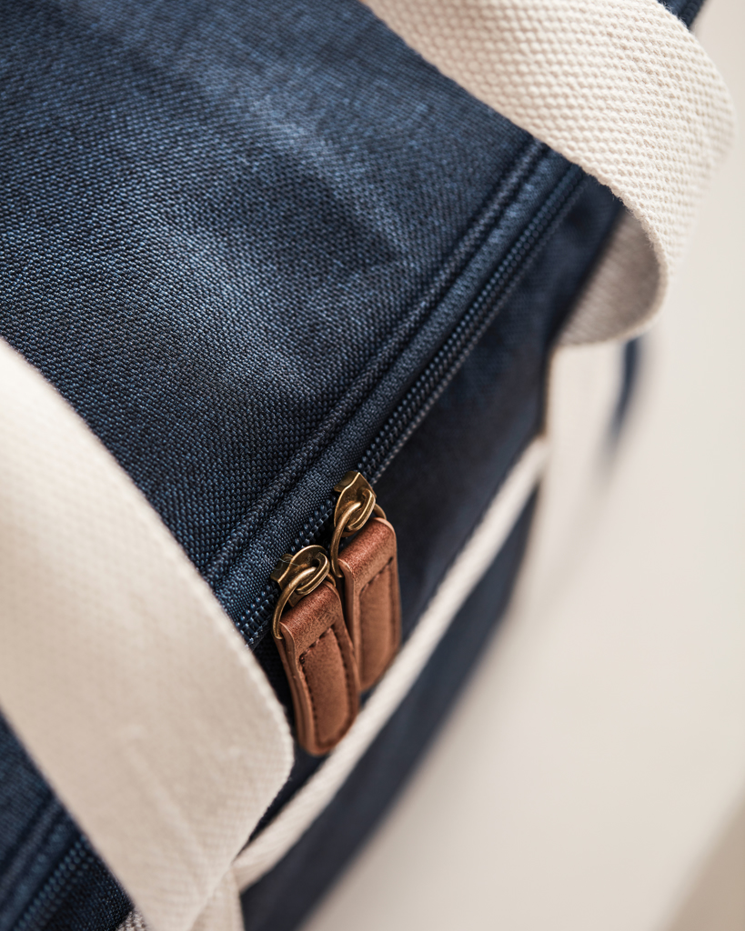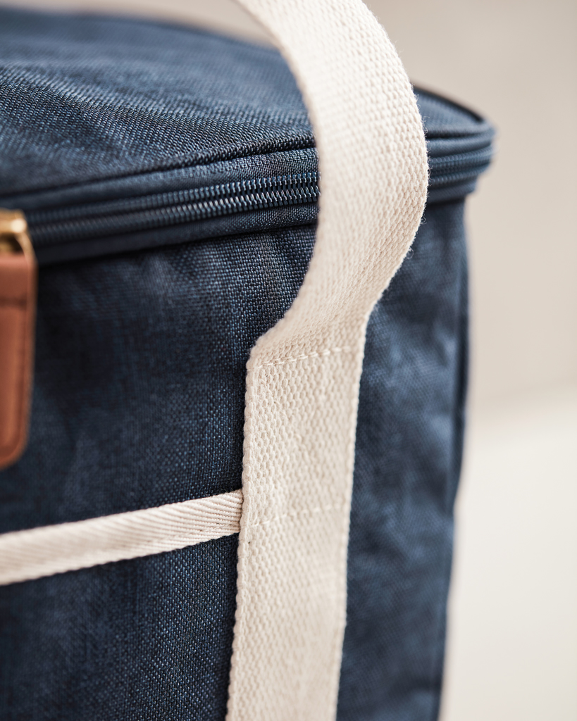 Der ultimative Kühlkorb, Ton in Ton meliert und mit Details aus Kunstleder und Baumwolle. An der Außenseite der Kühltasche befindet sich auch ein kleines Fach, sodass Sie ebenso Platz für andere Dinge haben. Die dicke PEVA-Polsterung bewirkt, dass die Kälte lange erhalten bleibt und die Tasche nach Gebrauch außerdem leicht zu reinigen und zu trocknen ist. Dank dem verstellbaren Schultergurt und dem doppelten Handgriff, haben Sie mehrere Möglichkeiten, den Kühlkorb zu tragen.