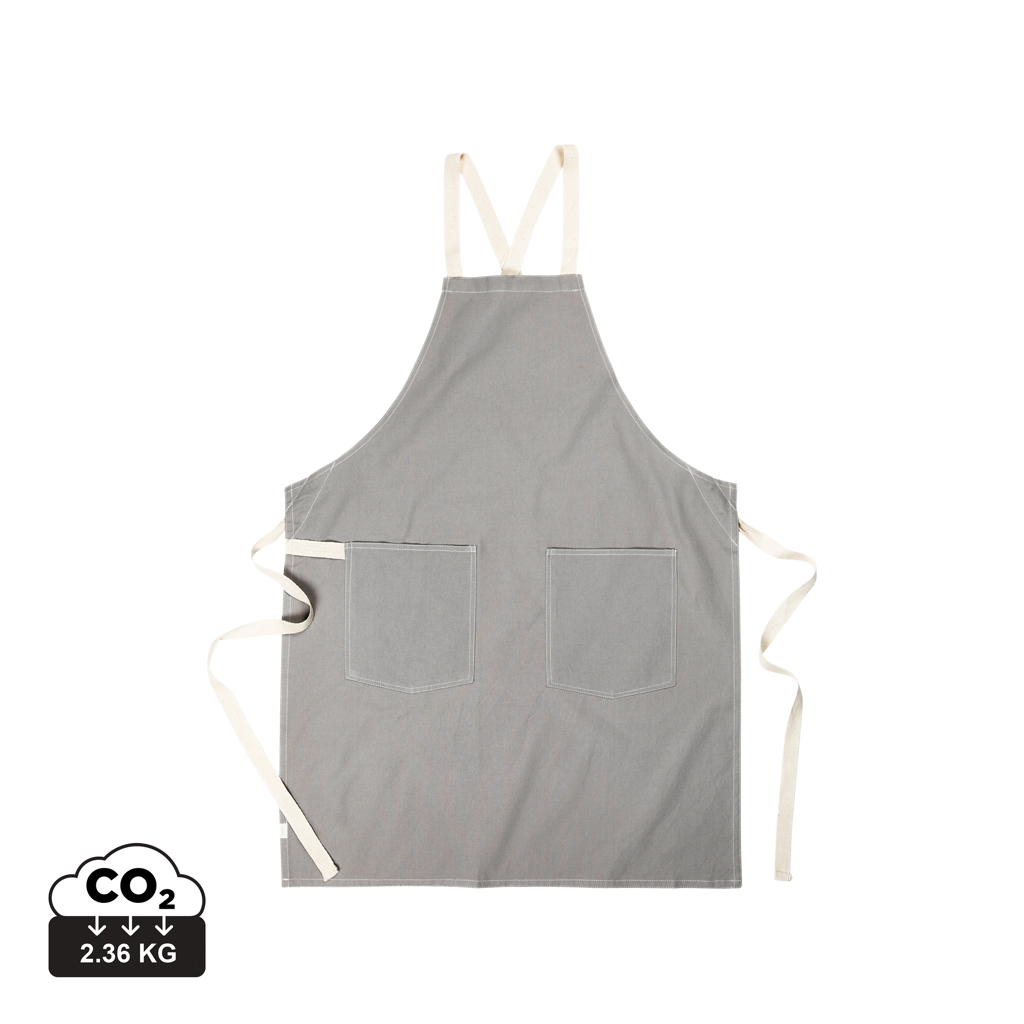 Schürze aus 70 % zertifizierter, recycelter Baumwolle aus Baumwollresten der Lieferanten. Fasern, die normalerweise als unbrauchbar gelten, haben mit dem entsprechenden Herstellungsverfahren die gewünschten Eigenschaften erreicht. Diese Schürze ist extra breit, um maximalen Schutz zu bieten. Zwei große Fronttaschen und eine Schlaufe zum Aufhängen von Utensilien oder einem Geschirrtuch.