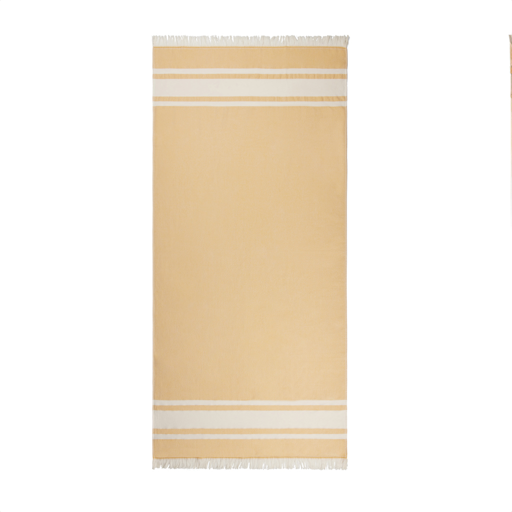 Hamam-Handtuch mit zwei verschiedenen Texturen, eine Seite aus Frottee und die andere Seite glatt gewebt. Das zweiseitige Design macht dieses Handtuch zum ultimativen Begleiter am Strand, am Pool oder bei einem Abenteuer im Freien. Es ist sehr saugfähig und trocknet schnell. Das Handtuch besteht aus 75% Baumwolle und 25% Polyester und hat eine Stärke von 360gr / m². Abmessungen: 180 x 80 cm, die 5cm Fransen ausgeschlossen. OEKO-TEX® STANDARD 100. 09. HIN.68091. Hohenstein HTTI.
