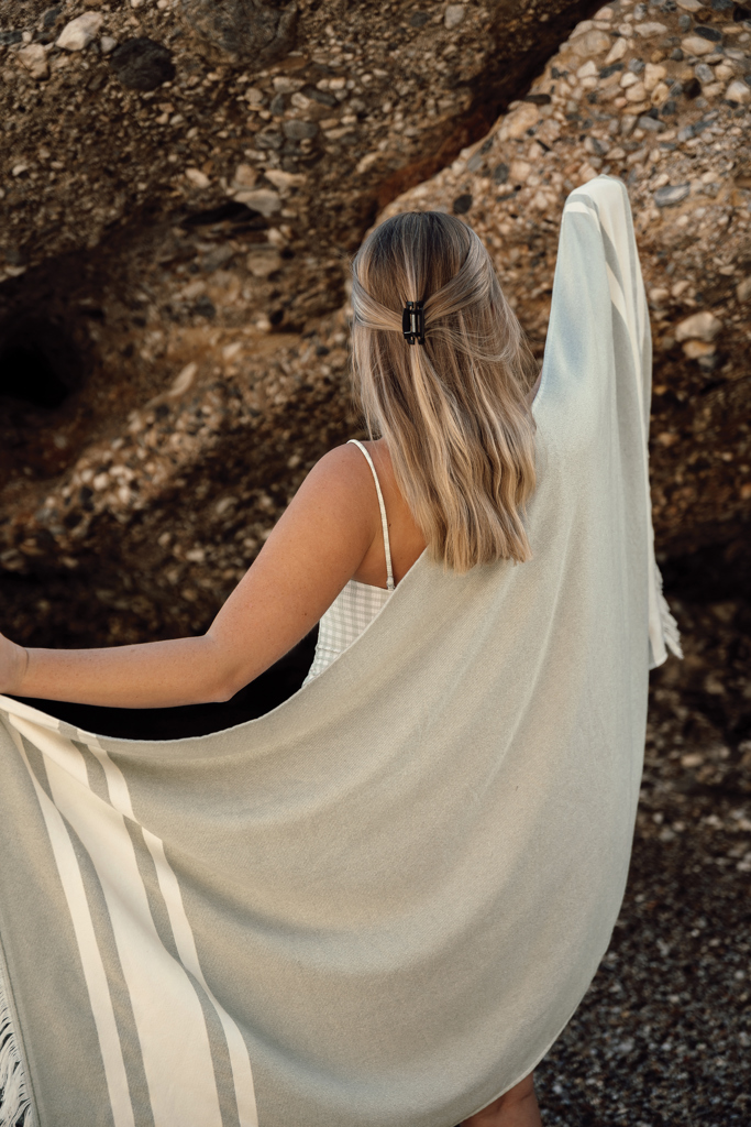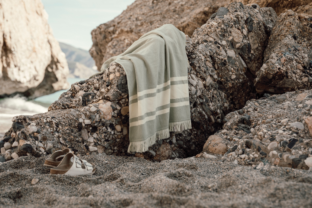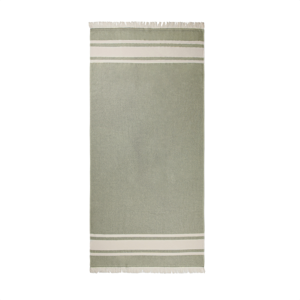 Hamam-Handtuch mit zwei verschiedenen Texturen, eine Seite aus Frottee und die andere Seite glatt gewebt. Das zweiseitige Design macht dieses Handtuch zum ultimativen Begleiter am Strand, am Pool oder bei einem Abenteuer im Freien. Es ist sehr saugfähig und trocknet schnell. Das Handtuch besteht aus 75% Baumwolle und 25% Polyester und hat eine Stärke von 360gr / m². Abmessungen: 180 x 80 cm, die 5cm Fransen ausgeschlossen. OEKO-TEX® STANDARD 100. 09. HIN.68091. Hohenstein HTTI.