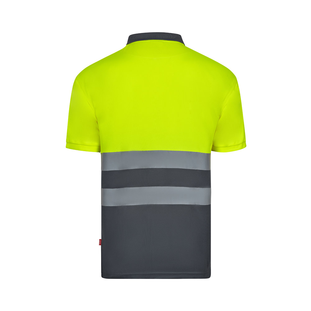 Poloshirt (140g / m²) im Bird-Eye-Design mit kurzen Ärmeln, aus Polyester (100%). Kontrastfarbene Knöpfe und gerippter Kragen. Reflektierende Streifen auf der Brust und eine Brusttasche. Produkt gemäß EU-Verordnung 2016/425, zertifiziert nach EN20471 und Klasse Nº 1. Größe: S, M, L, XL, 2XL, 3XL