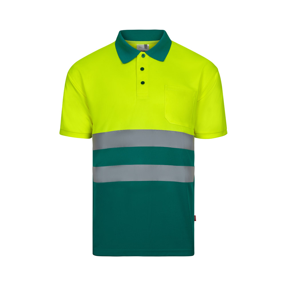 Poloshirt (140g / m²) im Bird-Eye-Design mit kurzen Ärmeln, aus Polyester (100%). Kontrastfarbene Knöpfe und gerippter Kragen. Reflektierende Streifen auf der Brust und eine Brusttasche. Produkt gemäß EU-Verordnung 2016/425, zertifiziert nach EN20471 und Klasse Nº 1. Größe: S, M, L, XL, 2XL, 3XL