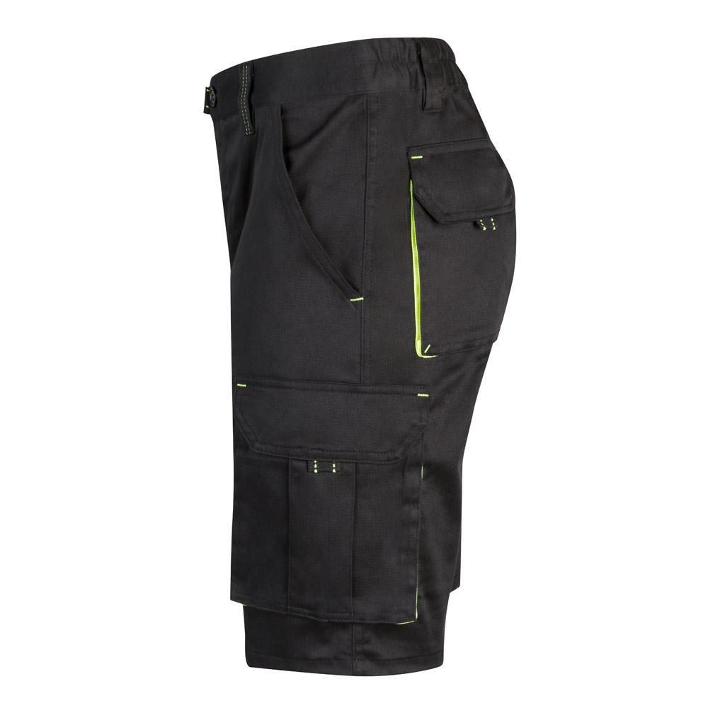 Zweifarbige Stretch-Bermudashorts mit mehreren Taschen (240 g / m²), aus Baumwolle (46 %), EME (38 %) und Polyester (16 %). Mit elastischem Bund, farblich abgesetzten Zwickeln, Zuglasche und Nähten sowie Stoffverstärkung auf der Rückseite. Enthält sechs Taschen (2 französische Taschen, 2 seitliche Zwickeltaschen und 2 Gesäßzwickeltaschen). Größe: 34, 36, 38, 40, 42, 44, 46, 48, 50, 52, 54, 56, 58, 60