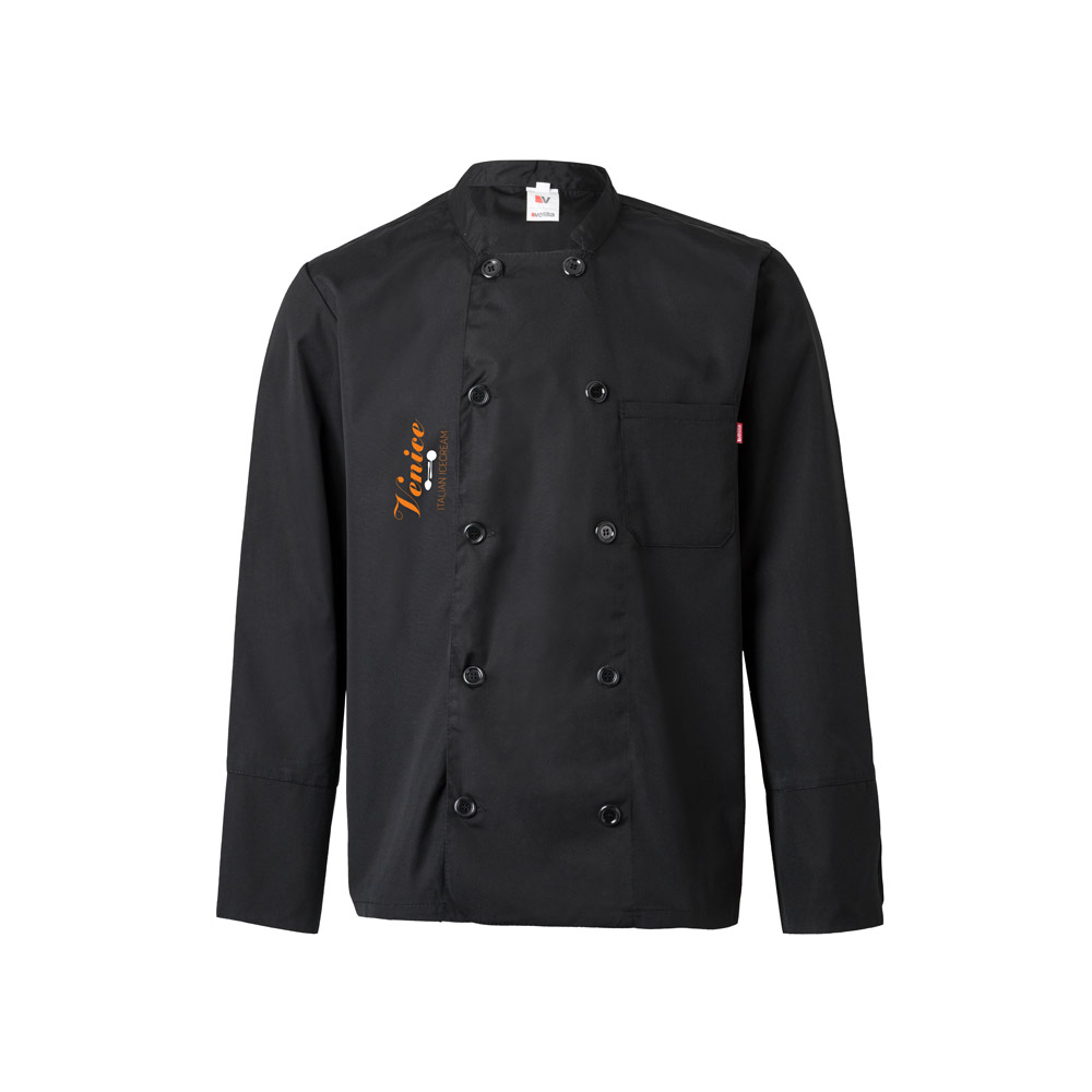Langärmelige Kochjacke (175 g / m²), aus Baumwolle (35 %) und Polyester (65 %). Mit doppeltem Knopfverschluss, Öffnung an den Manschetten und 1 Brusttasche. Größe: 44, 46, 48, 50, 52, 54, 56, 58, 60, 62, 64