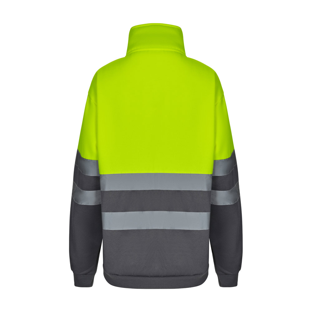 Zweifarbiges Sweatshirt (300g / m²) aus Polyester-Fleece (100%). Mit hohem Kragen und halbem Reißverschluss. Gerippte Bündchen und Saum. Reflektierende Streifen auf dem Rumpf und den Ärmeln. Produkt gemäß EU-Verordnung 2016/425, zertifiziert nach EN20471 und Klasse Nº 1. Größe: S, M, L, XL, 2XL, 3XL