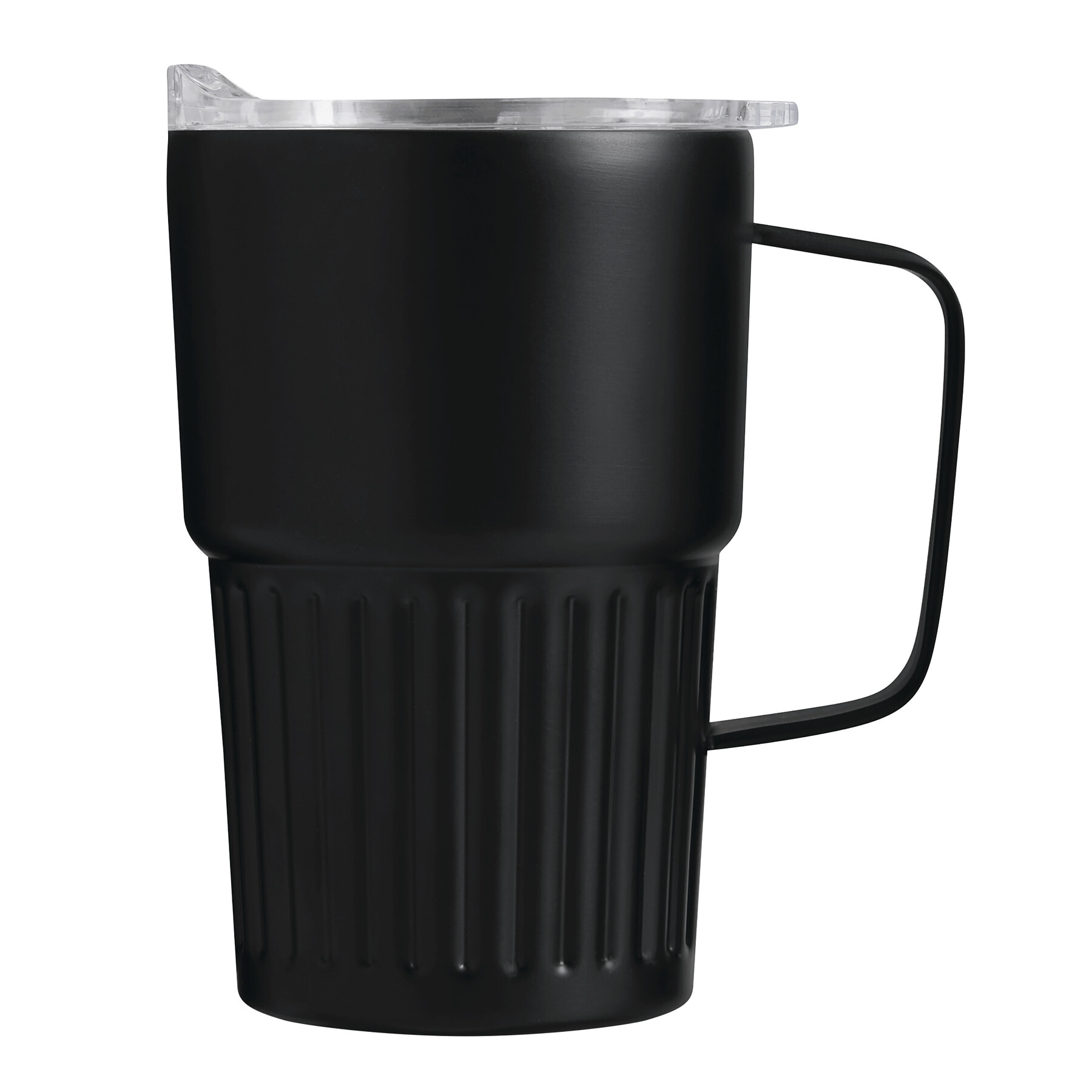 Vakuum-Isolierbecher WAVE HOLD, doppelwandig: innen aus recyceltem Edelstahl und außen aus Edelstahl, mit praktischem Griff, transparenter Kunststoff-Deckel mit Silikon-Dichtring und integrierter Trinköffnung zum Aufschieben, Füllmenge ca. 450 ml, hält ca. 4 Stunden warm und bis zu 8 Stunden kalt, in Box
