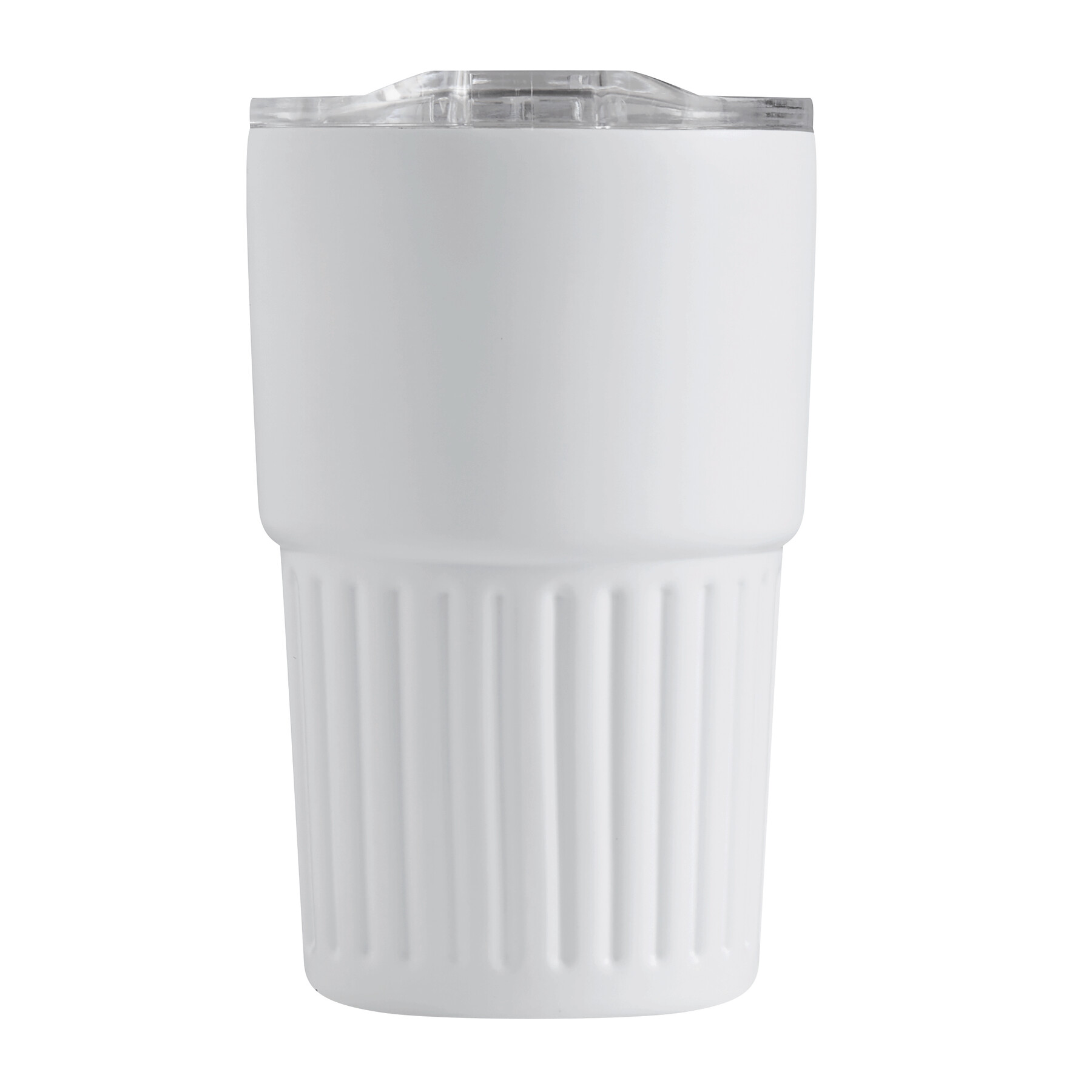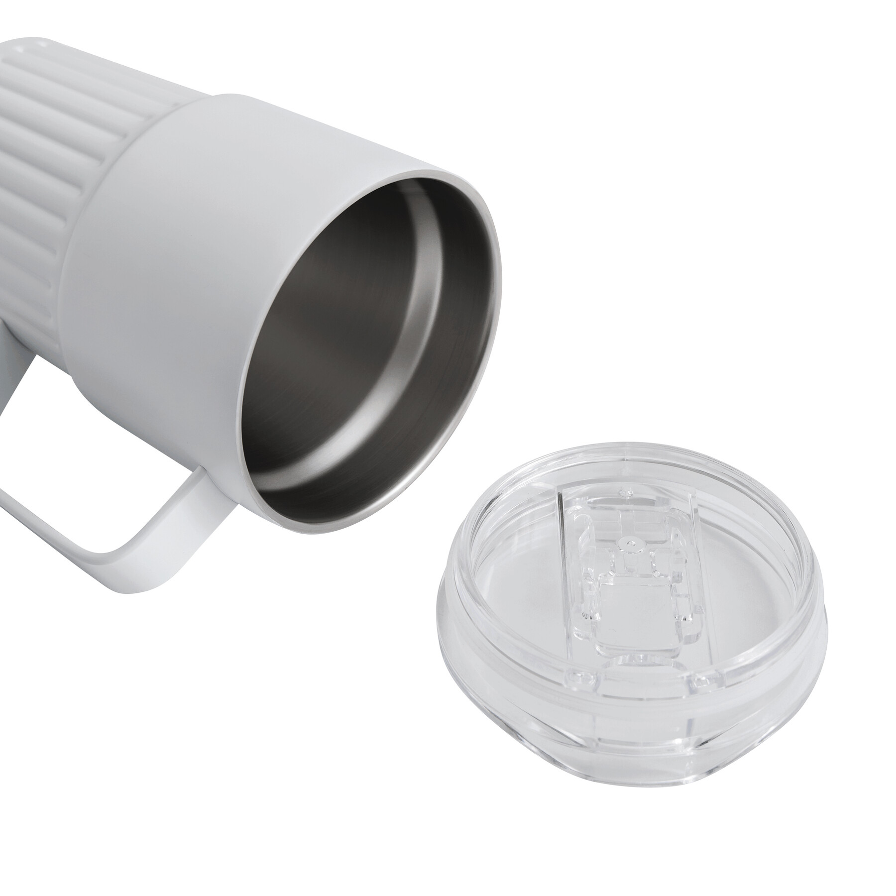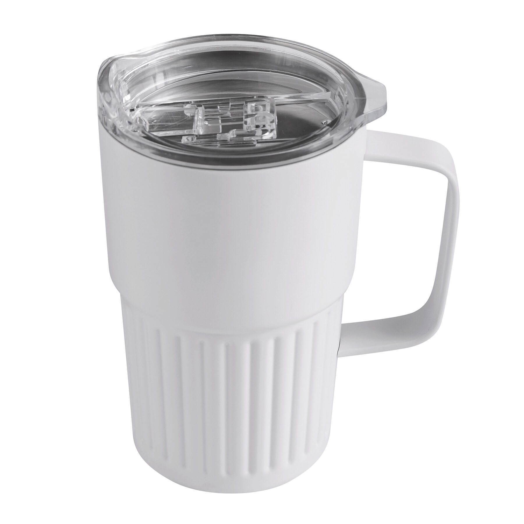 Vakuum-Isolierbecher WAVE HOLD, doppelwandig: innen aus recyceltem Edelstahl und außen aus Edelstahl, mit praktischem Griff, transparenter Kunststoff-Deckel mit Silikon-Dichtring und integrierter Trinköffnung zum Aufschieben, Füllmenge ca. 450 ml, hält ca. 4 Stunden warm und bis zu 8 Stunden kalt, in Box