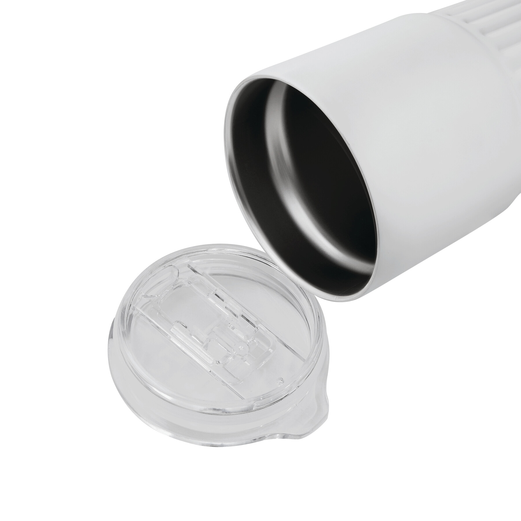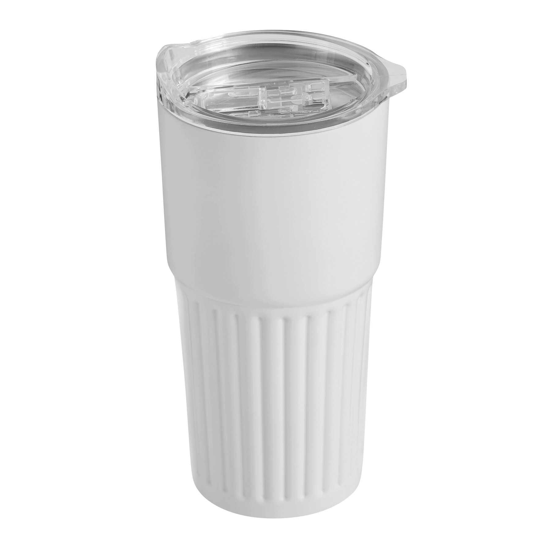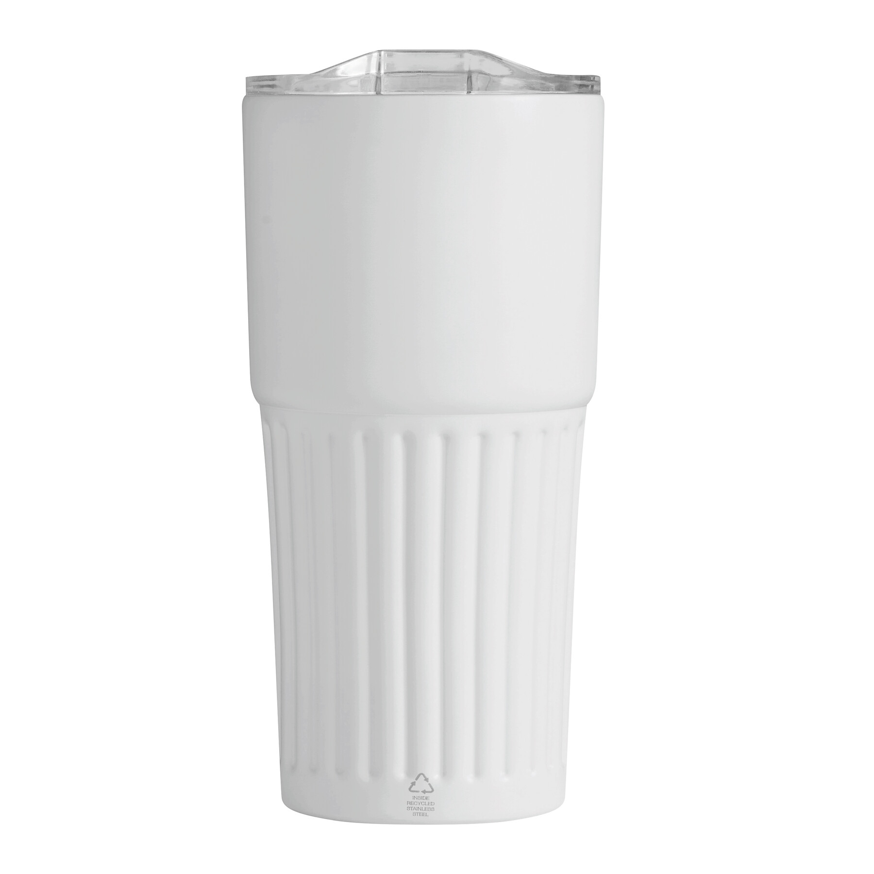 Vakuum-Isolierbecher WAVE LINE, doppelwandig: innen aus recyceltem Edelstahl und außen aus Edelstahl, transparenter Kunststoff-Deckel mit Silikon-Dichtring und integrierter Trinköffnung zum Aufschieben, beschichteter Boden für gute Oberflächenhaftung, Füllmenge ca. 600 ml, hält ca. 4 Stunden warm und bis zu 8 Stunden kalt, in Box