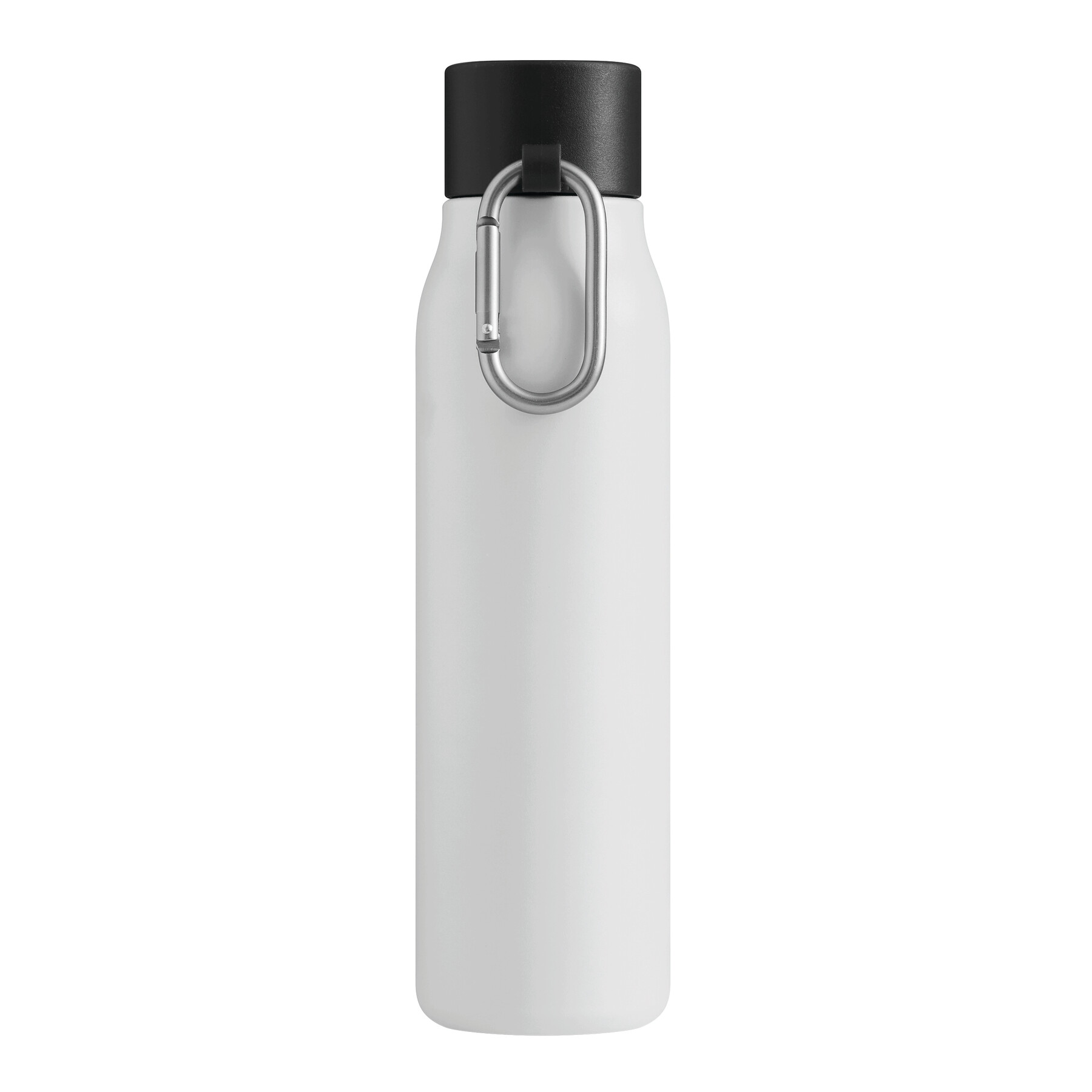 Vakuum-Isolierflasche ALPINE PEAK, doppelwandig: innen aus recyceltem Edelstahl und außen aus Edelstahl, schwarzer Kunststoff-Deckel mit sicherem Schraubverschluss, Silikon-Dichtring und Karabinerhaken (der Karabiner ist NICHT als Sicherung beim Klettern geeignet), Füllmenge ca. 550 ml, hält ca. 8 Stunden warm und bis zu 12 Stunden kalt, in Box