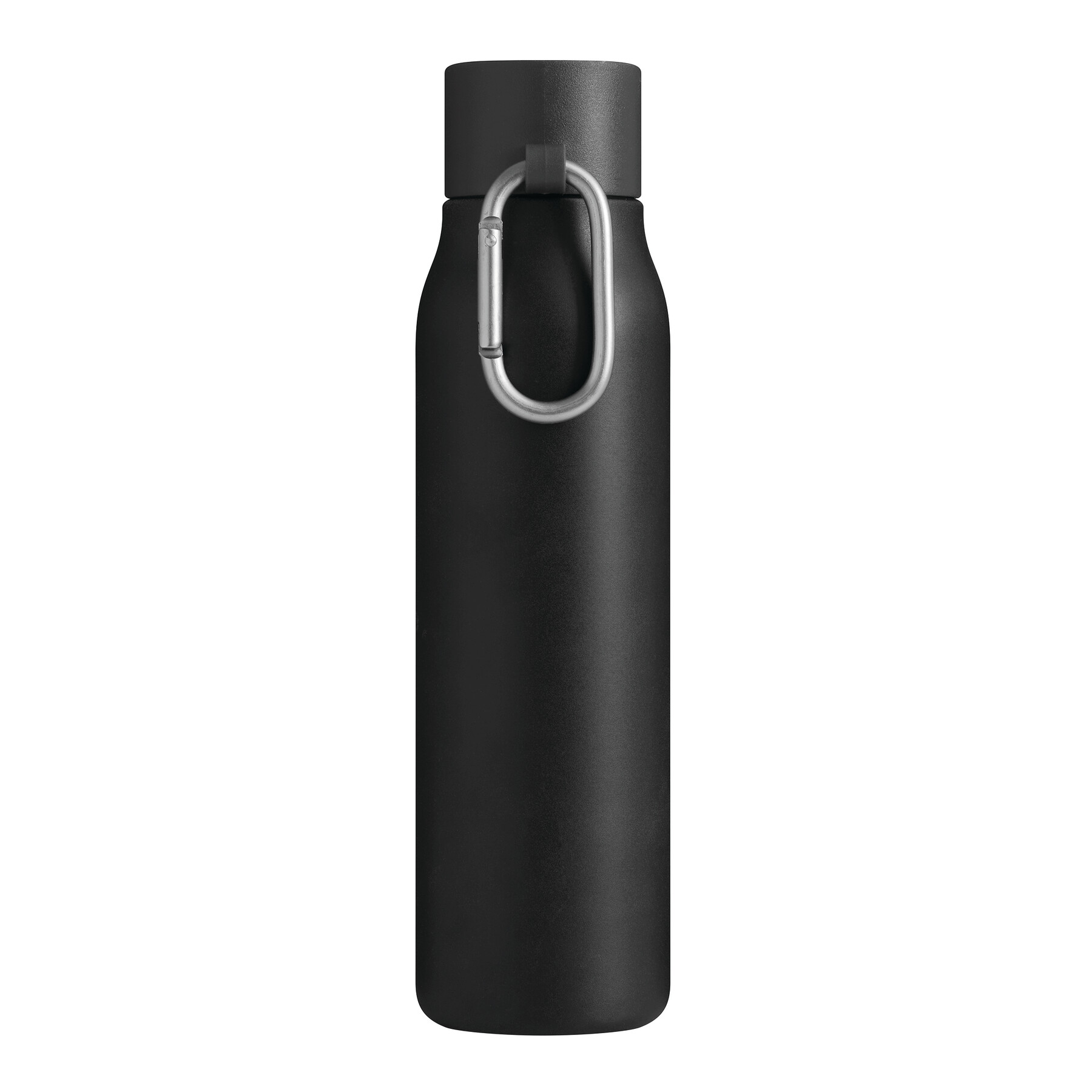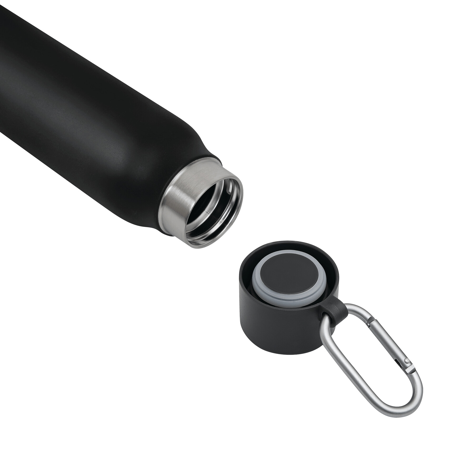 Vakuum-Isolierflasche ALPINE PEAK, doppelwandig: innen aus recyceltem Edelstahl und außen aus Edelstahl, schwarzer Kunststoff-Deckel mit sicherem Schraubverschluss, Silikon-Dichtring und Karabinerhaken (der Karabiner ist NICHT als Sicherung beim Klettern geeignet), Füllmenge ca. 550 ml, hält ca. 8 Stunden warm und bis zu 12 Stunden kalt, in Box