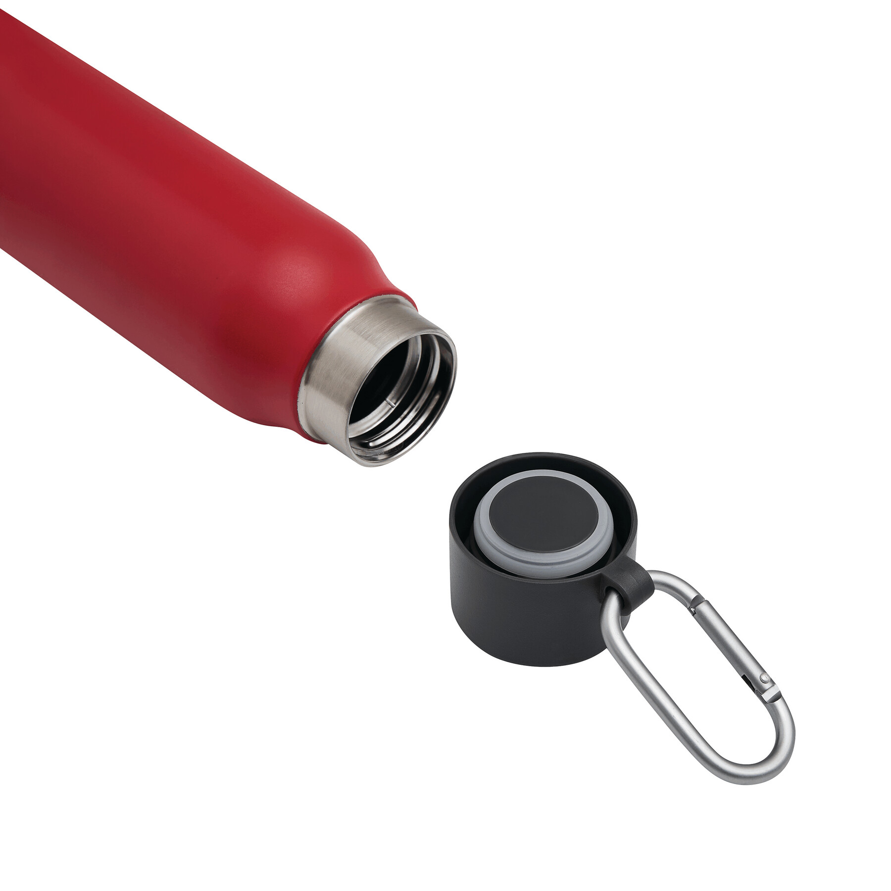 Vakuum-Isolierflasche ALPINE PEAK, doppelwandig: innen aus recyceltem Edelstahl und außen aus Edelstahl, schwarzer Kunststoff-Deckel mit sicherem Schraubverschluss, Silikon-Dichtring und Karabinerhaken (der Karabiner ist NICHT als Sicherung beim Klettern geeignet), Füllmenge ca. 550 ml, hält ca. 8 Stunden warm und bis zu 12 Stunden kalt, in Box