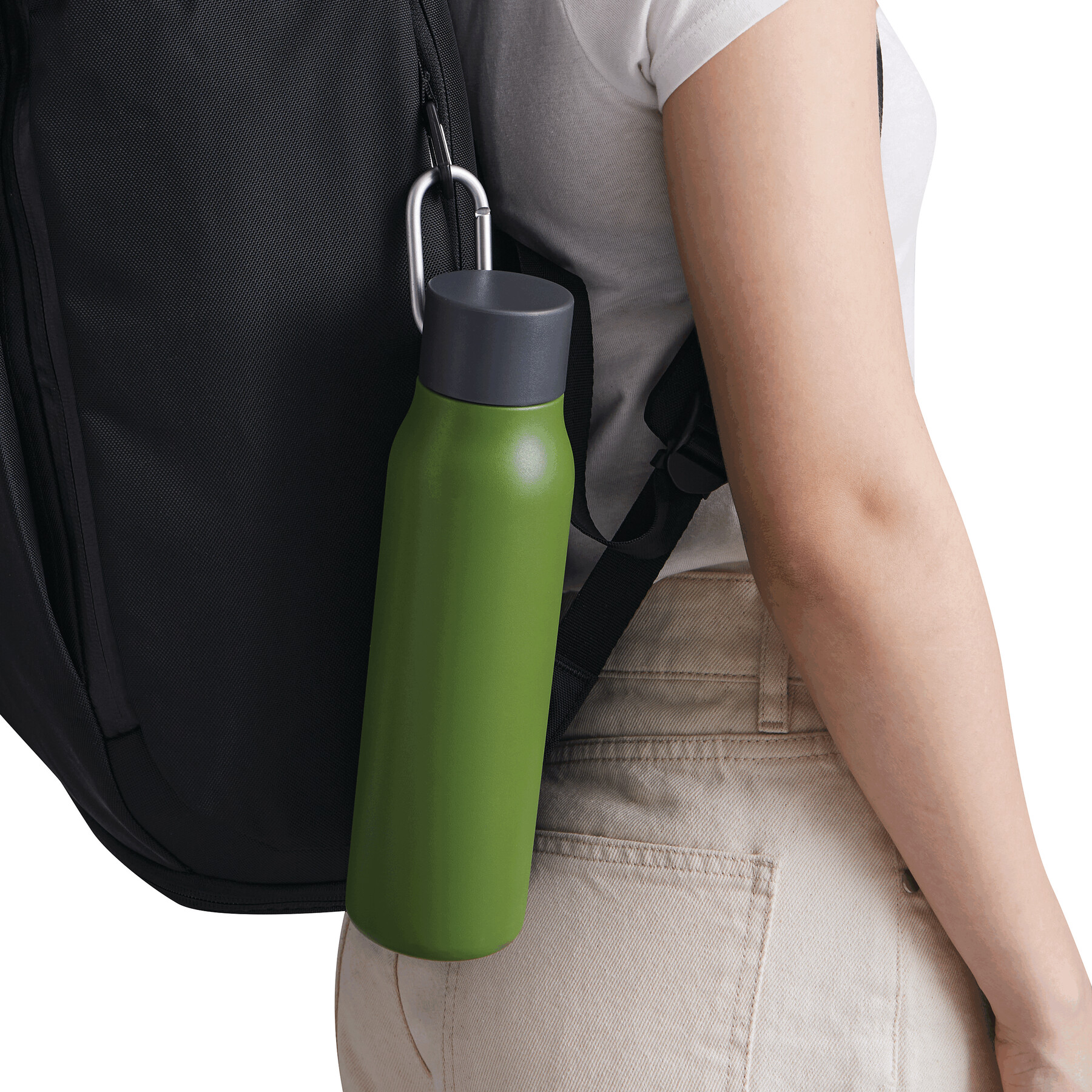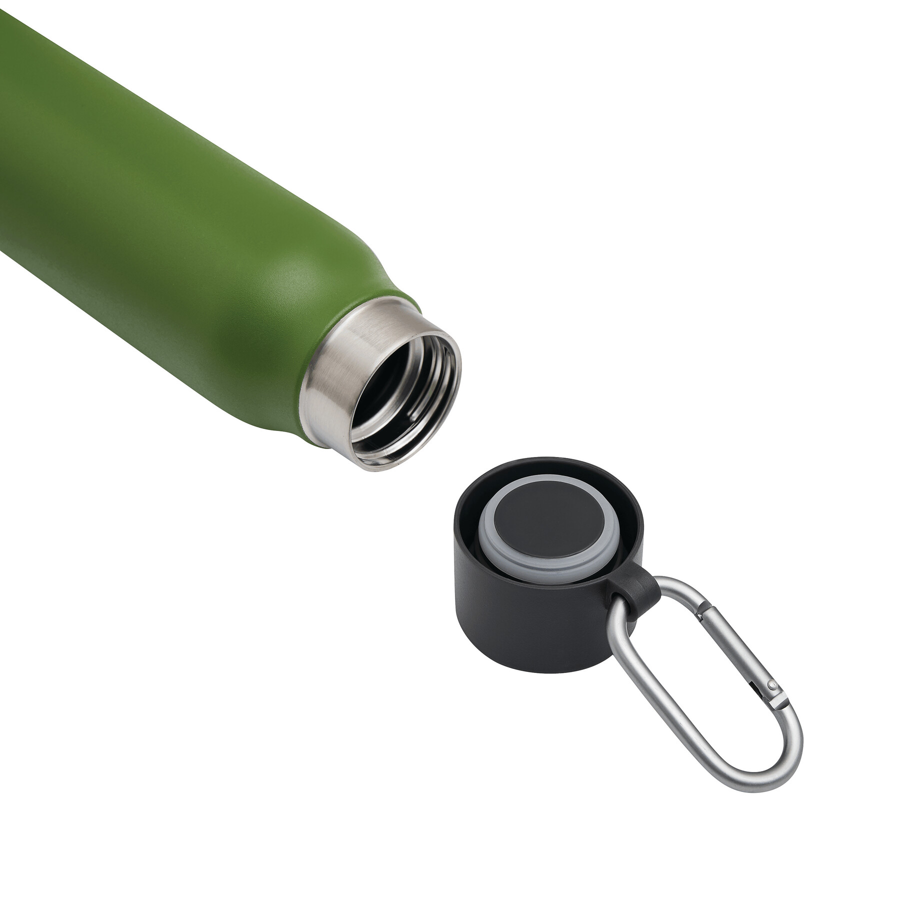 Vakuum-Isolierflasche ALPINE PEAK, doppelwandig: innen aus recyceltem Edelstahl und außen aus Edelstahl, schwarzer Kunststoff-Deckel mit sicherem Schraubverschluss, Silikon-Dichtring und Karabinerhaken (der Karabiner ist NICHT als Sicherung beim Klettern geeignet), Füllmenge ca. 550 ml, hält ca. 8 Stunden warm und bis zu 12 Stunden kalt, in Box