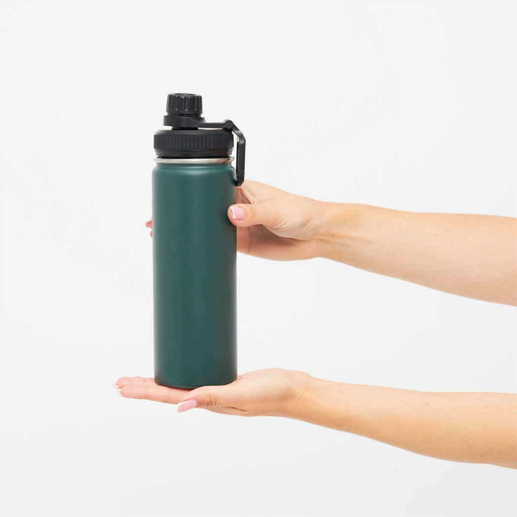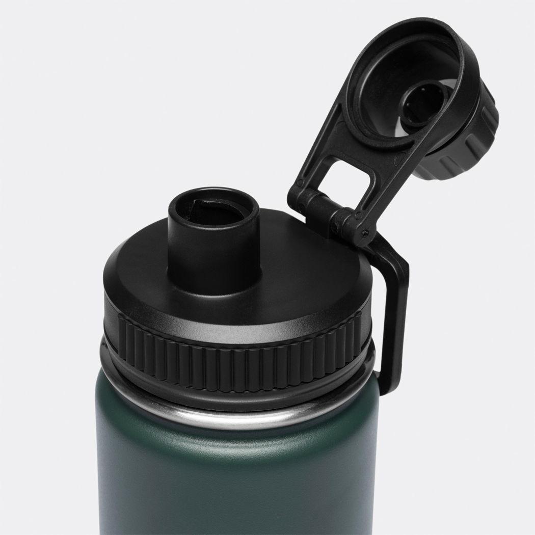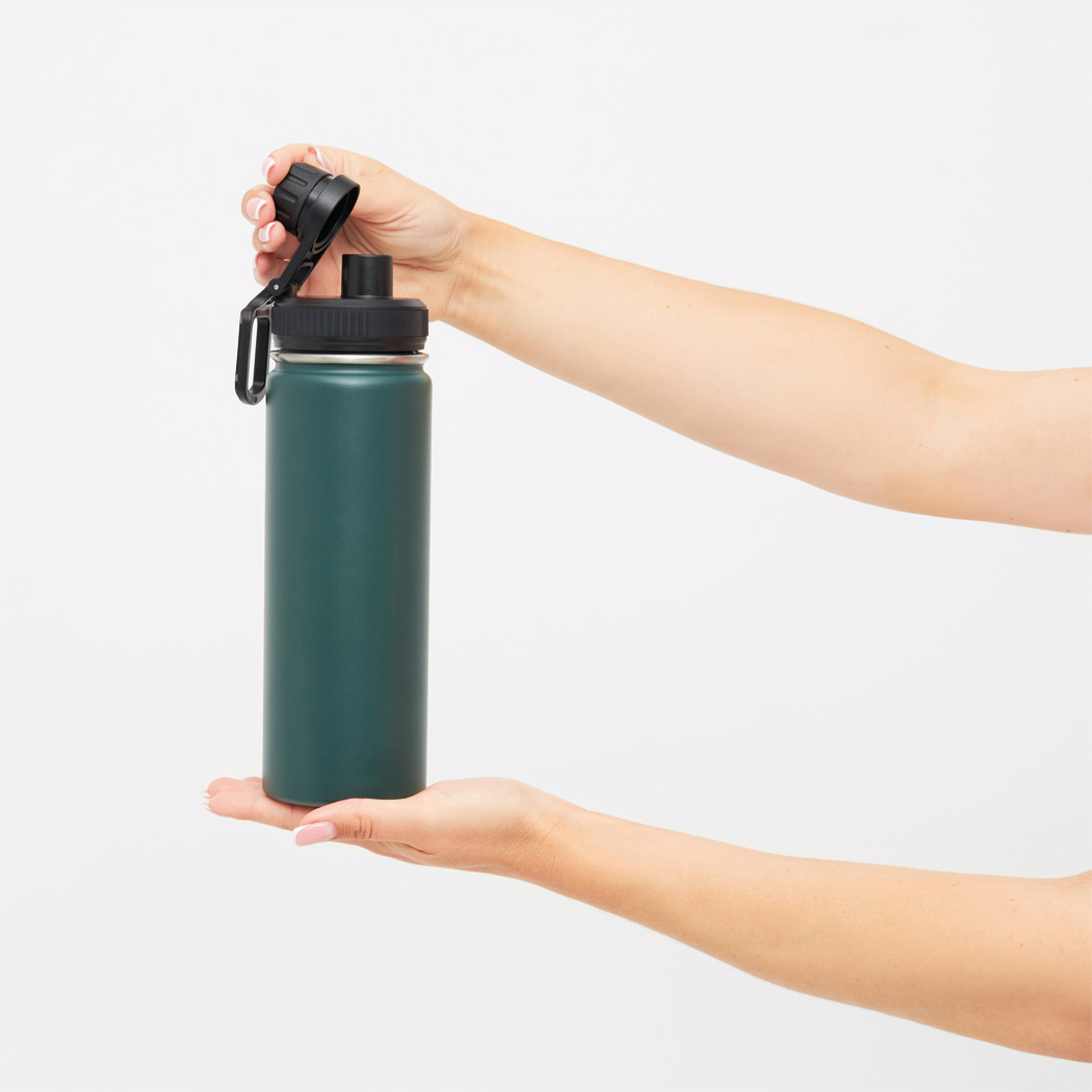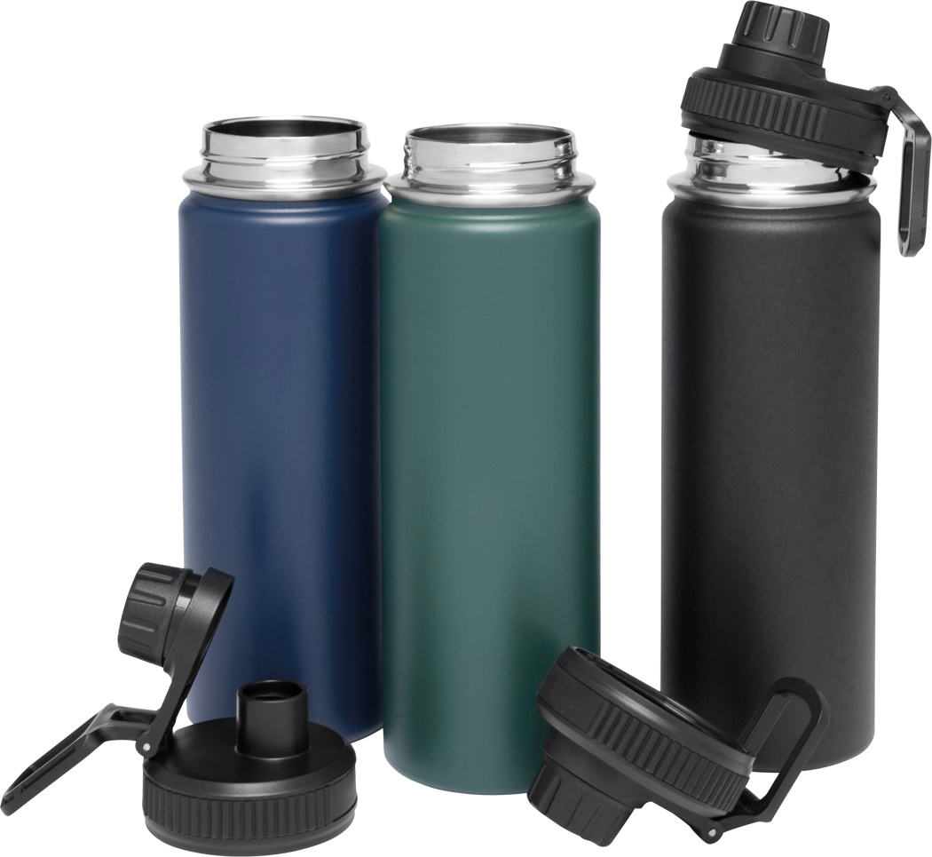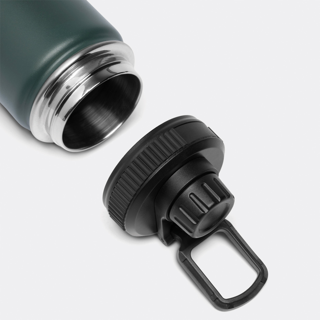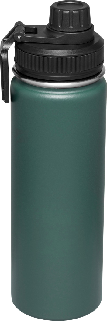 Vakuum-Isolierflasche ARMY STYLE, doppelwandig: außen und innen aus Edelstahl, Pulverlackierung, schwarzer Kunststoff-Deckel mit sicherem Schraubverschluss, Silikon-Dichtring und integrierter verschraubbarer Trinköffnung, Tragegriff, Füllmenge: ca. 600 ml, hält ca. 8 Stunden warm und bis zu 12 Stunden kalt
