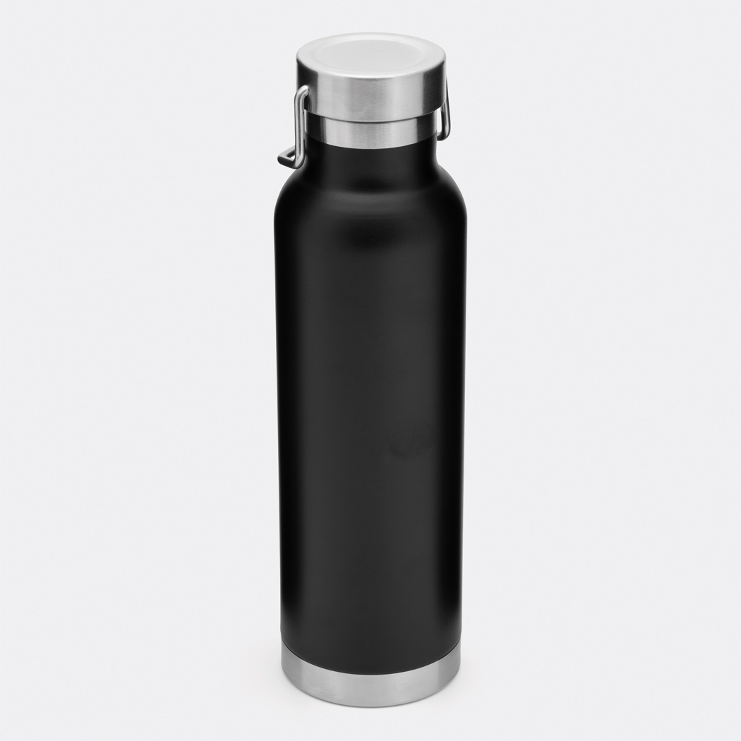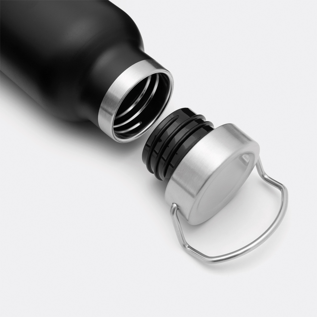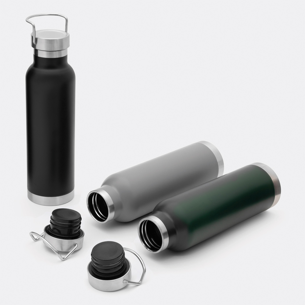 Edelstahl-Isolierflasche MILITARY, Vakuum-Kupfer isoliert: doppelwandig, innen und außen aus Edelstahl, silberner Deckel mit Schraubverschluss, Silikon-Dichtring und Tragegiff, Füllmenge ca. 650 ml, hält ca. 12 Stunden warm und bis zu 24 Stunden kalt, in Box