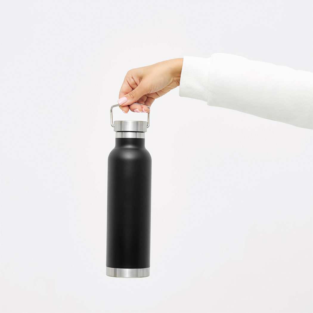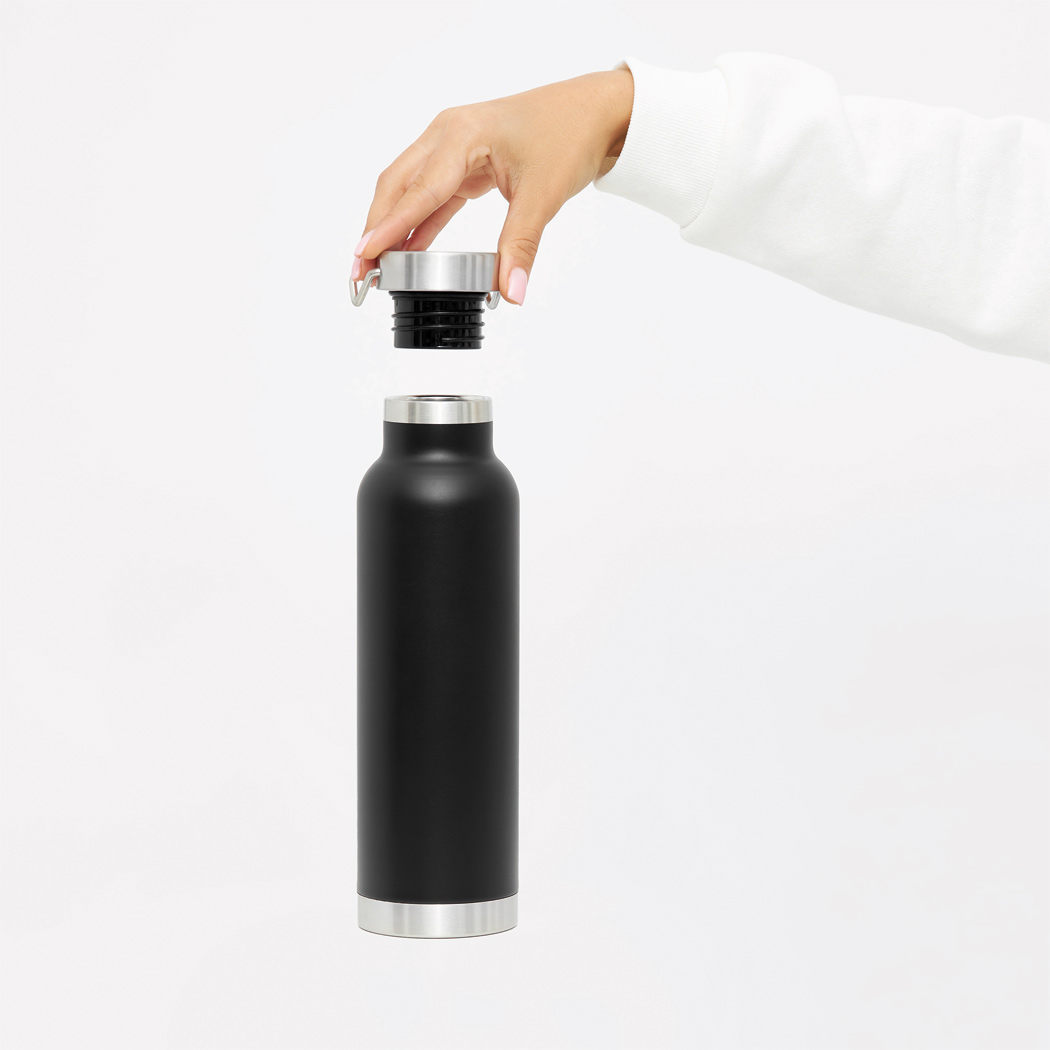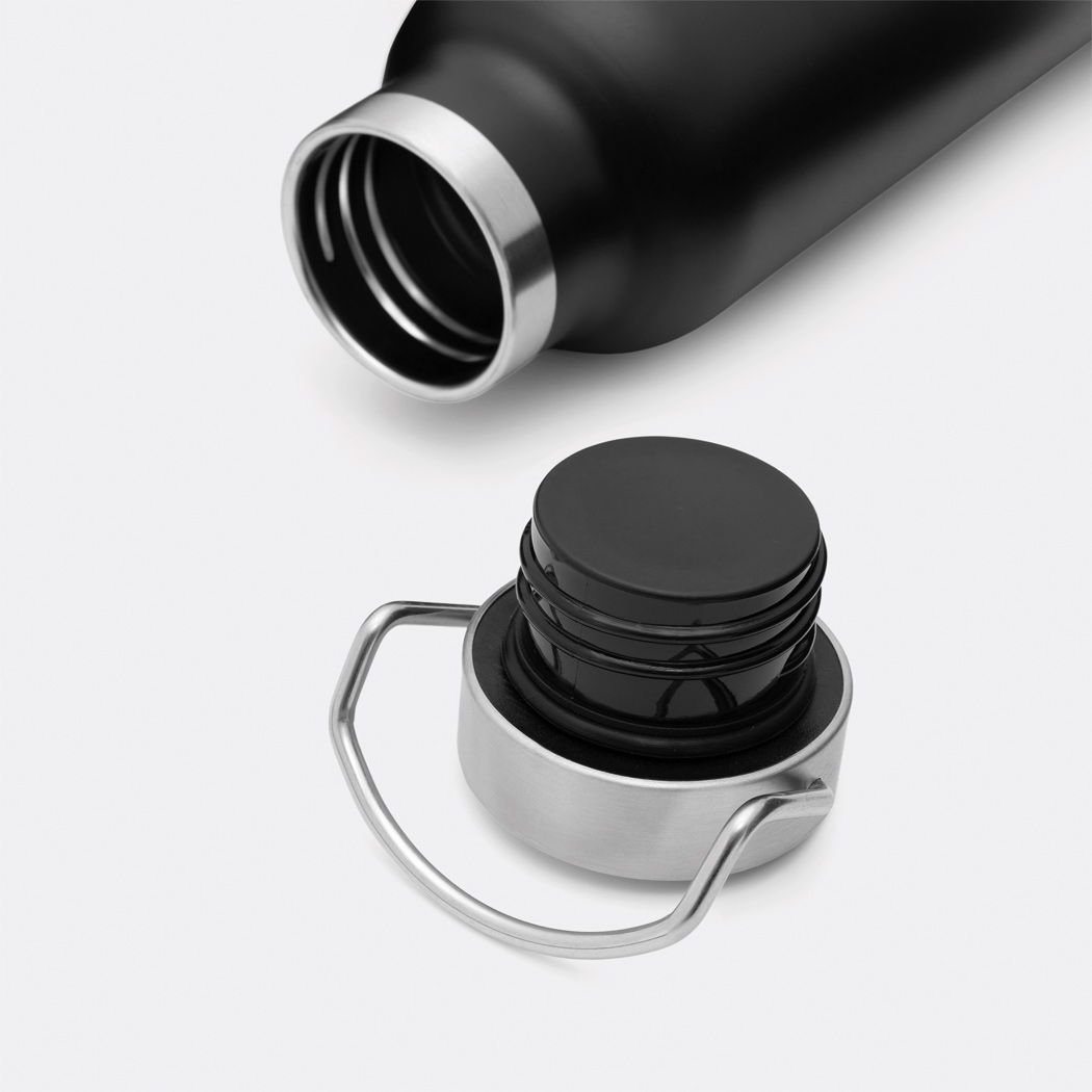 Edelstahl-Isolierflasche MILITARY, Vakuum-Kupfer isoliert: doppelwandig, innen und außen aus Edelstahl, silberner Deckel mit Schraubverschluss, Silikon-Dichtring und Tragegiff, Füllmenge ca. 650 ml, hält ca. 12 Stunden warm und bis zu 24 Stunden kalt, in Box