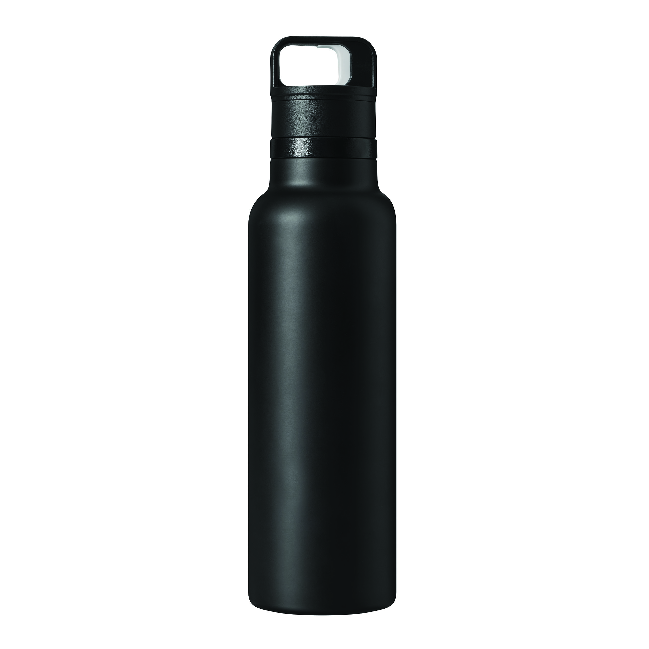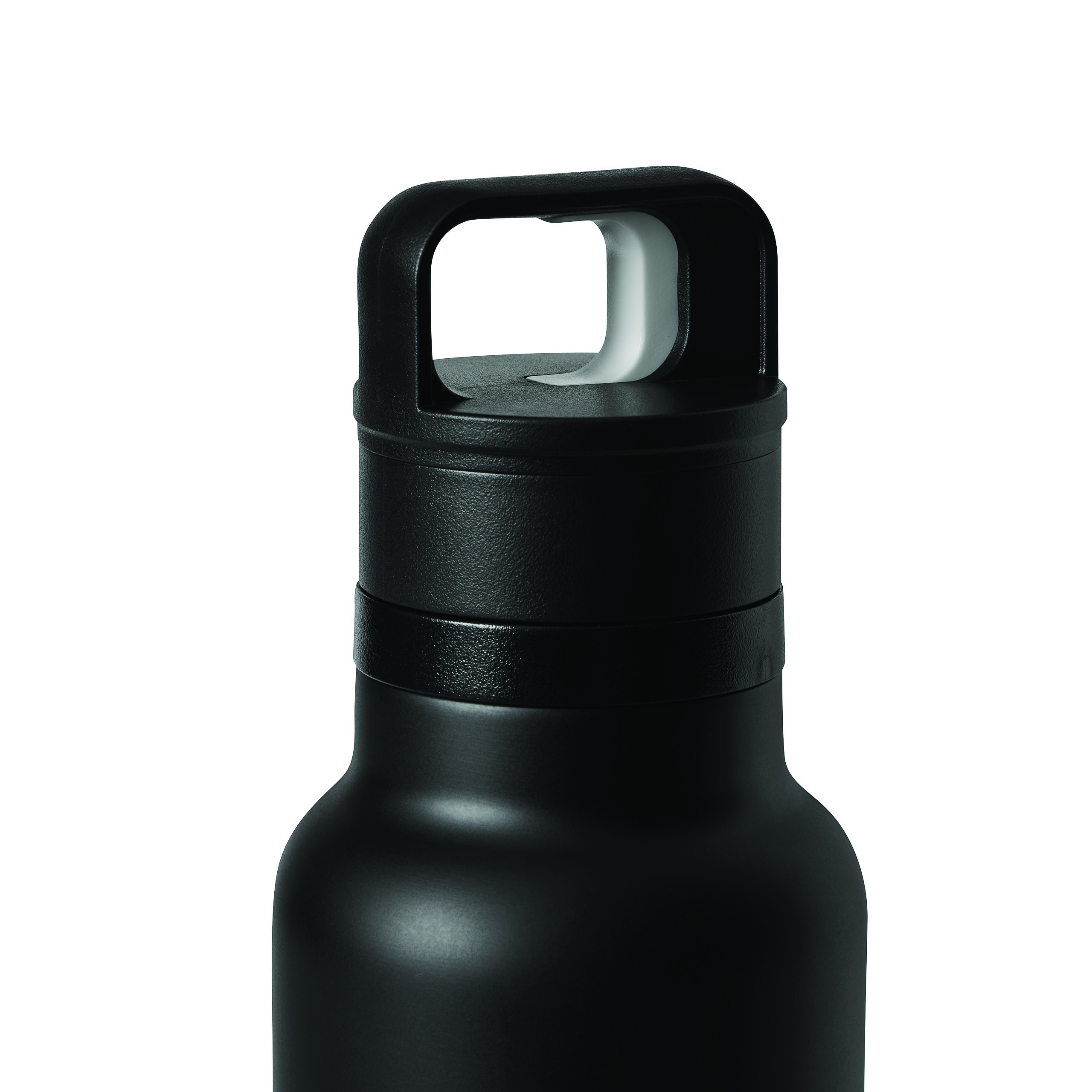 Vakuum-Isolierflasche TRAVELCLICK, doppelwandig: innen und außen aus Edelstahl, schwarzer Kunststoff-Deckel mit Einhand-Klickverschluss, Silikon-Dichtring und Tragegriff, Füllmenge ca. 750 ml, hält ca. 8 Stunden warm und bis zu 12 Stunden kalt, in Box