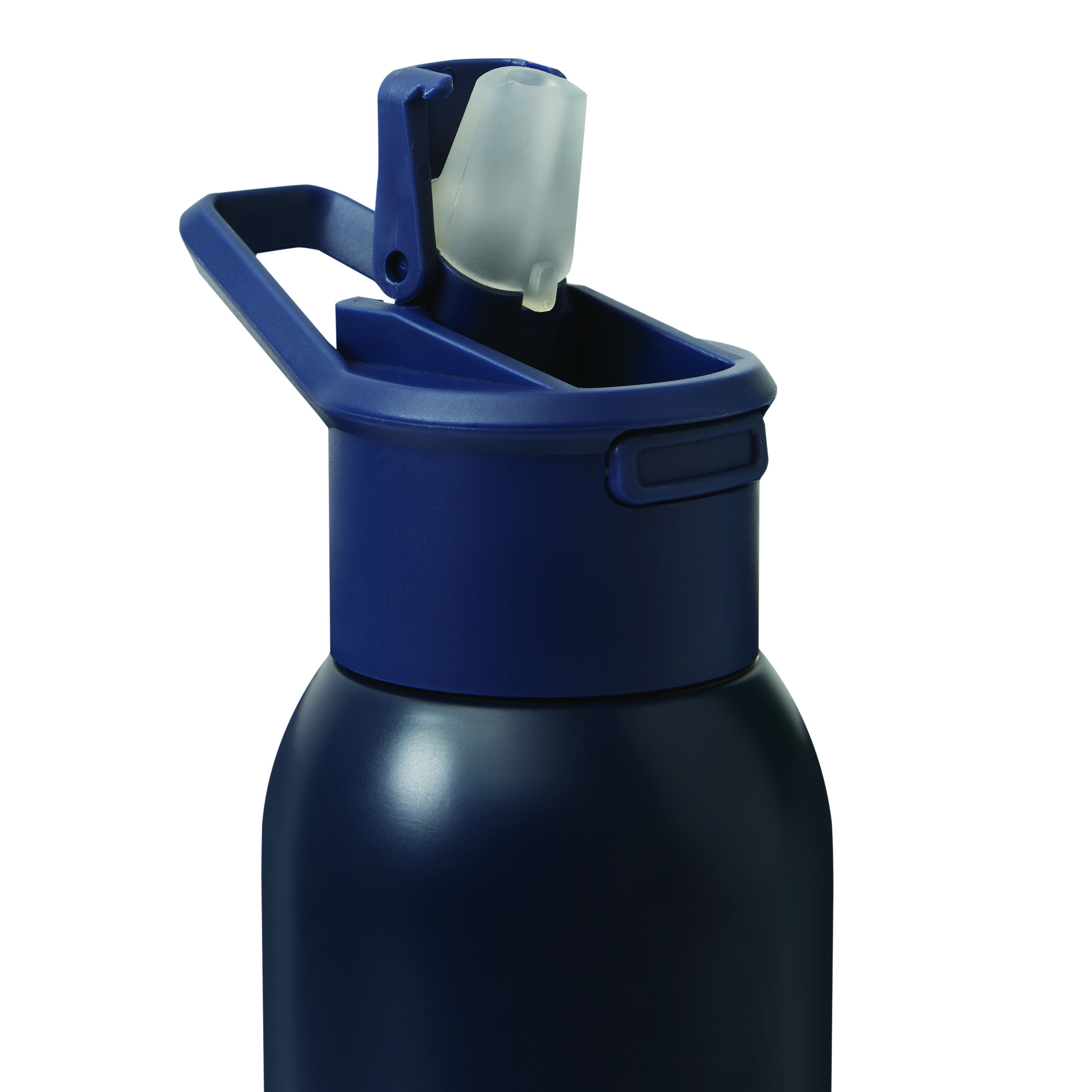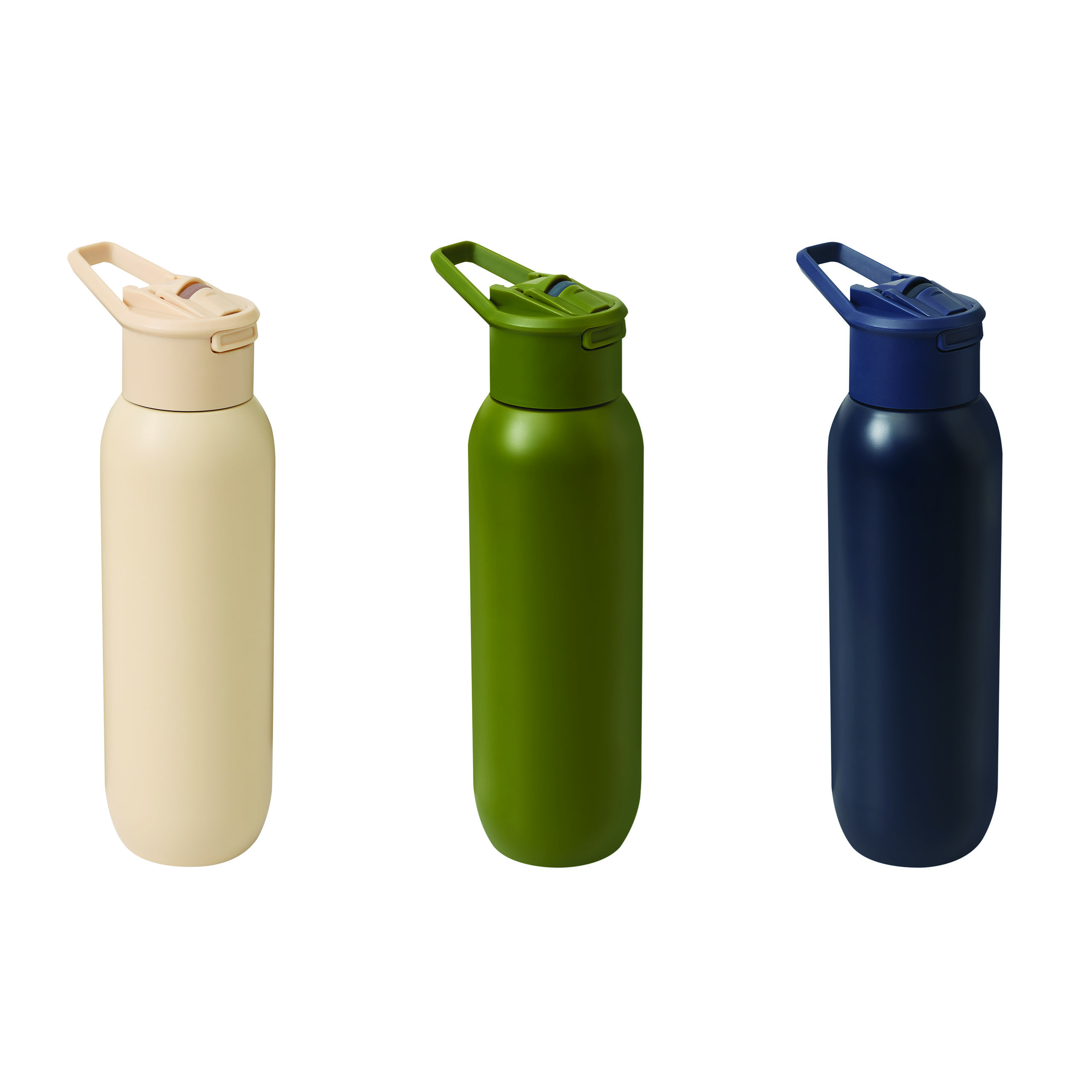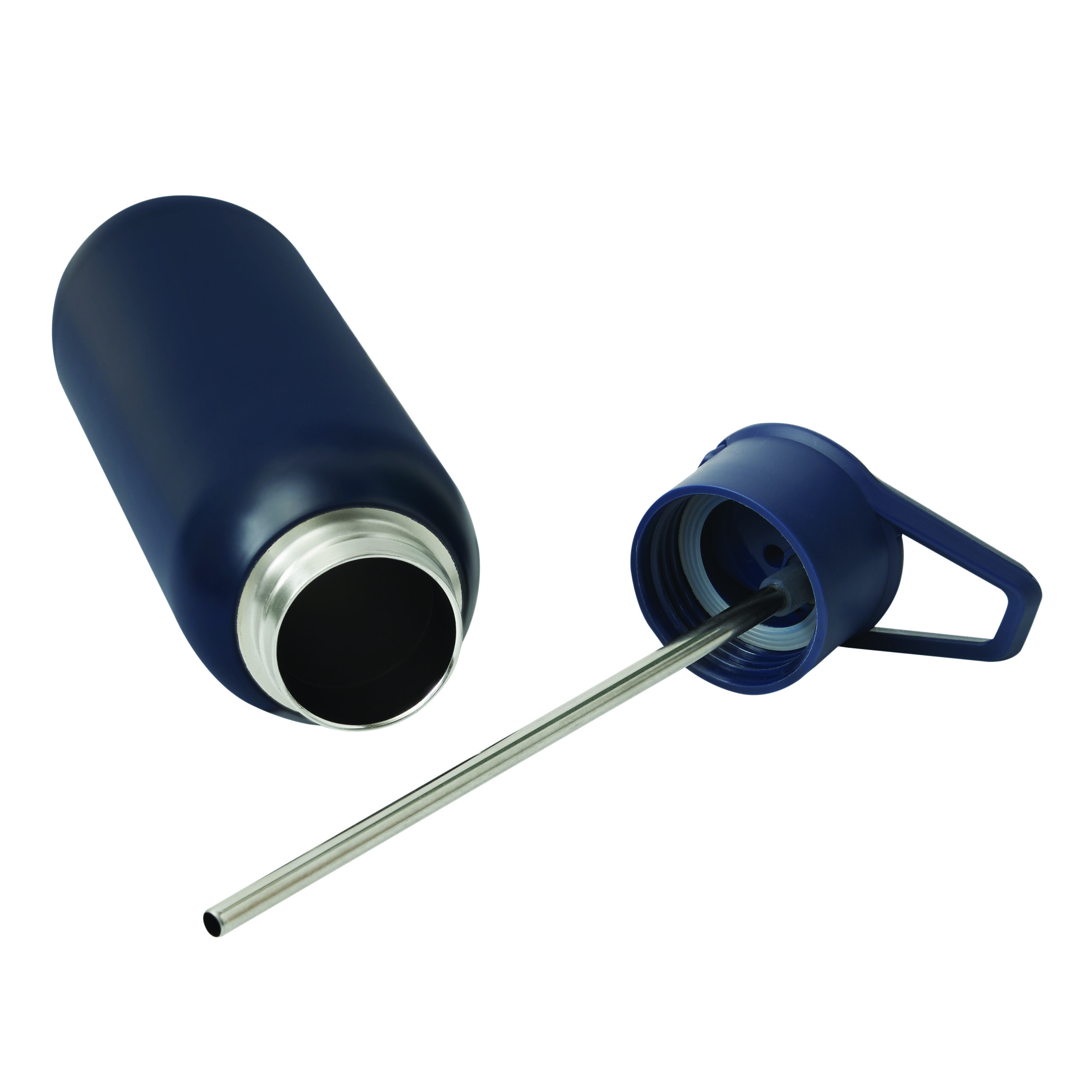 Vakuum-Isolierflasche TREKSTEEL, doppelwandig: innen und außen aus Edelstahl, farblich passender Kunststoff-Deckel mit sicherem Schraubverschluss, Silikon-Dichtring und Tragegriff, einhändig zu öffnender Flip-Top-Deckel, integrierter Edelstahl-Trinkhalm mit weichem Silikonmundstück, Füllmenge ca. 600 ml, hält ca. 8 Stunden warm und bis zu 12 Stunden kalt, in Box