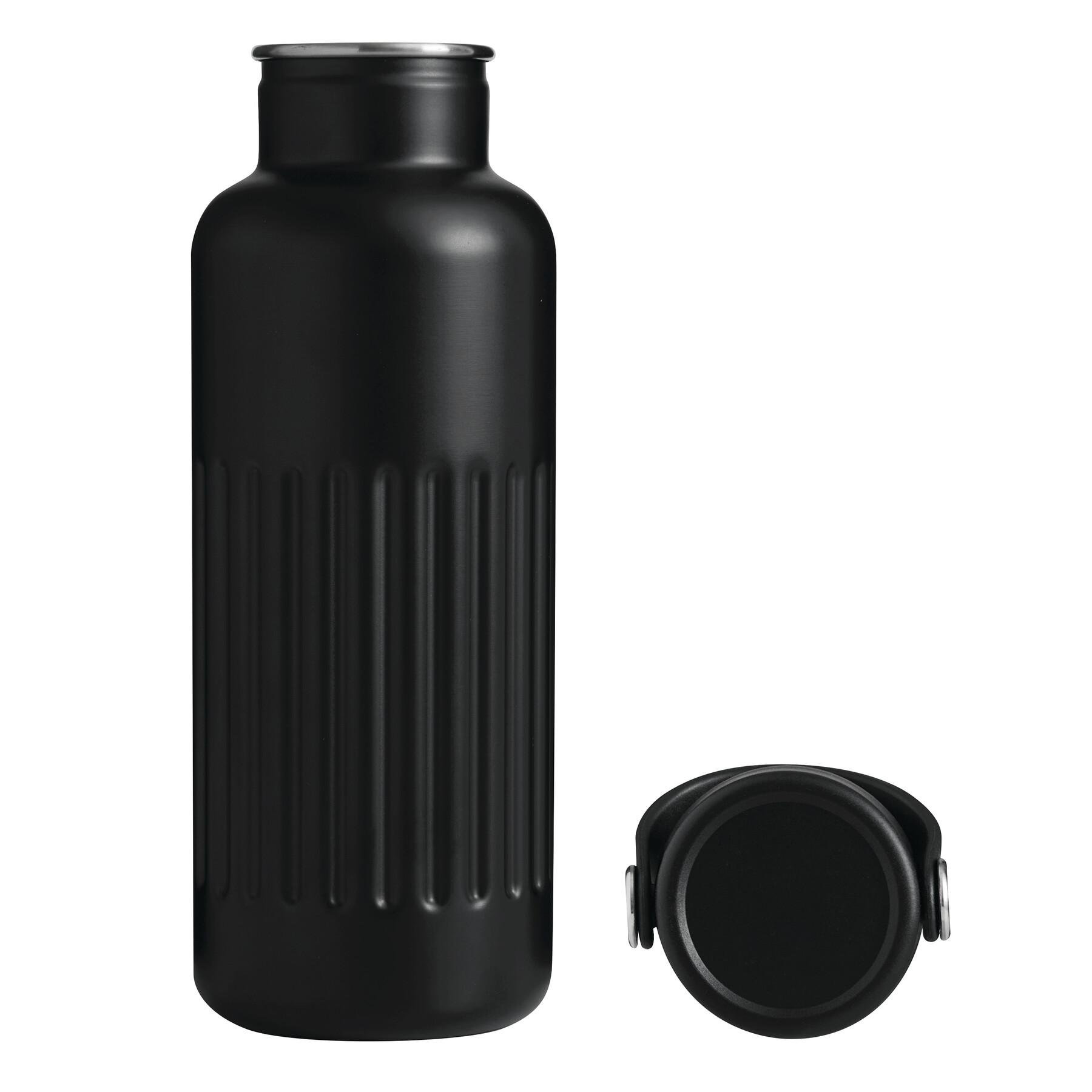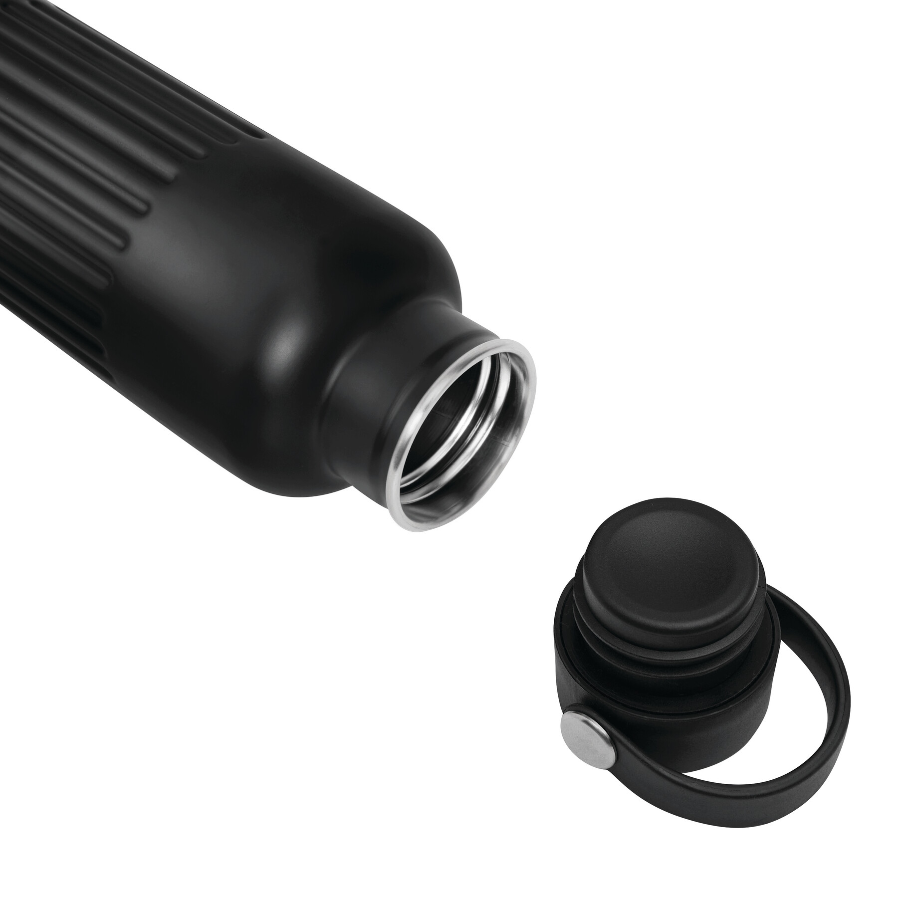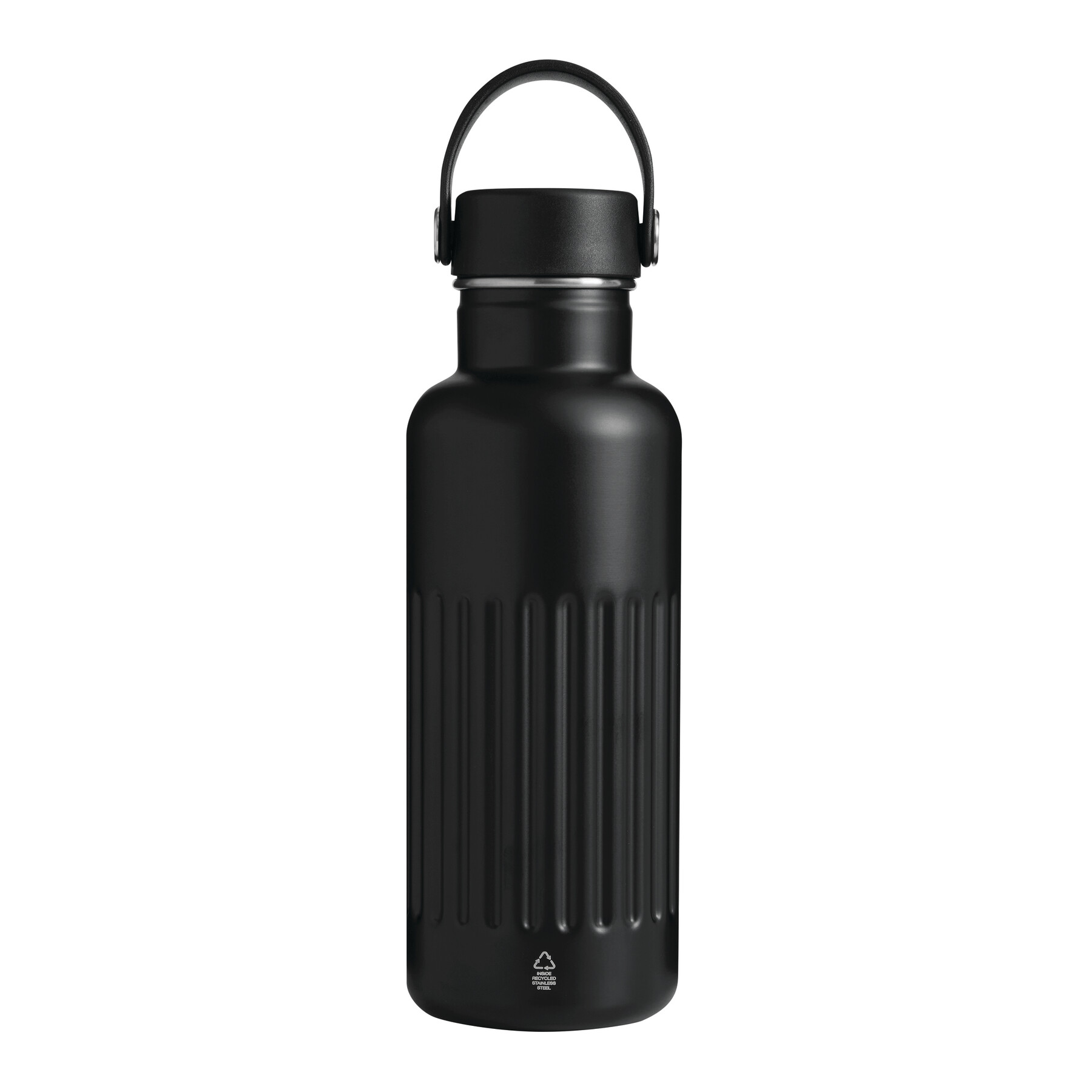 Vakuum-Isolierflasche WAVE TRAIL, doppelwandig: innen aus recyceltem Edelstahl und außen aus Edelstahl, schwarzer Kunststoff-Deckel mit sicherem Schraubverschluss, Silikon-Dichtring und Kunststoff-Trageschlaufe, Füllmenge ca. 500 ml, hält ca. 8 Stunden warm und bis zu 12 Stunden kalt, in Box
