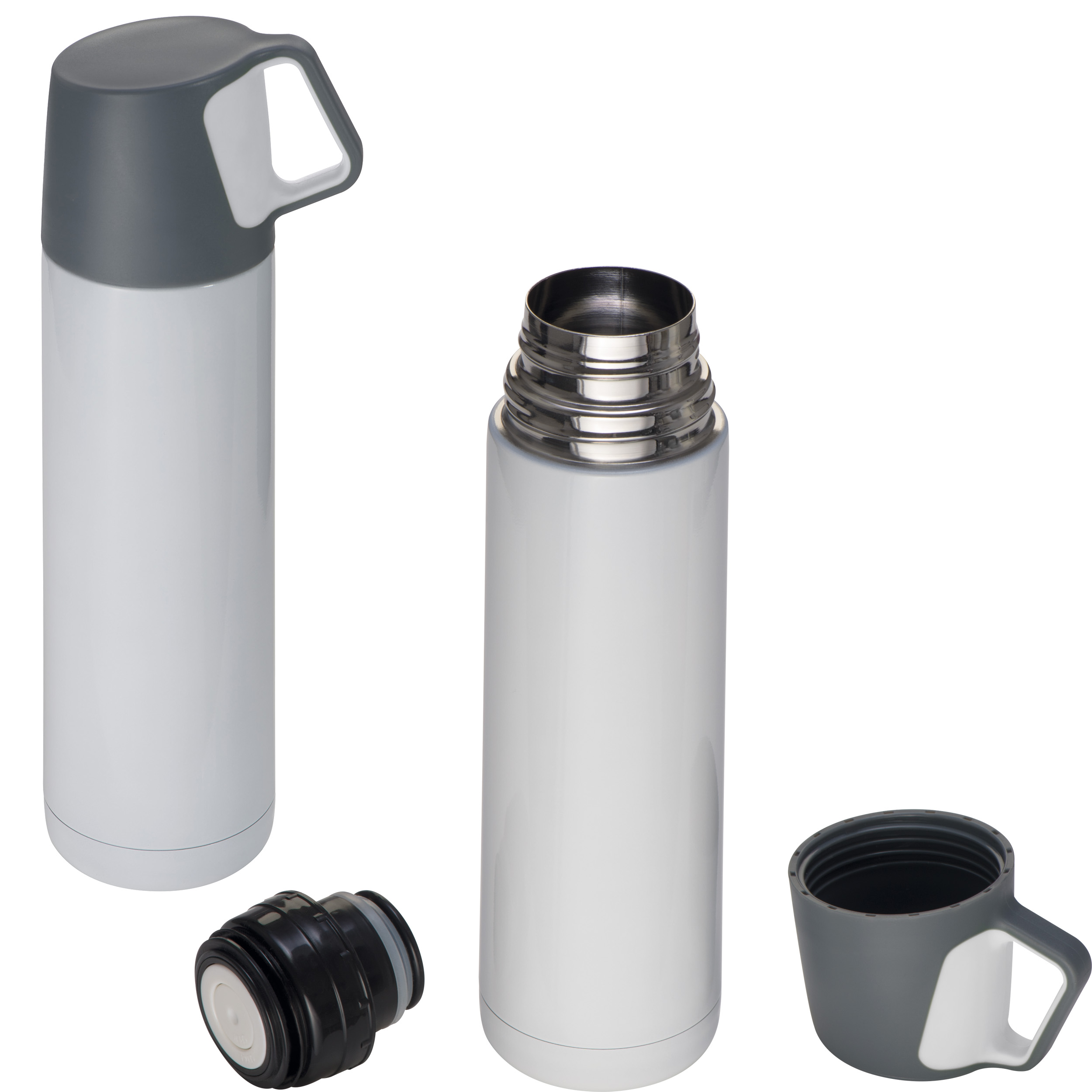 Edelstahl Vakuum Isolierkanne mit Trinkbecher und einem Fassungsvermögen von 500ml. Ihre Werbung wird direkt auf die Kanne gelasert.