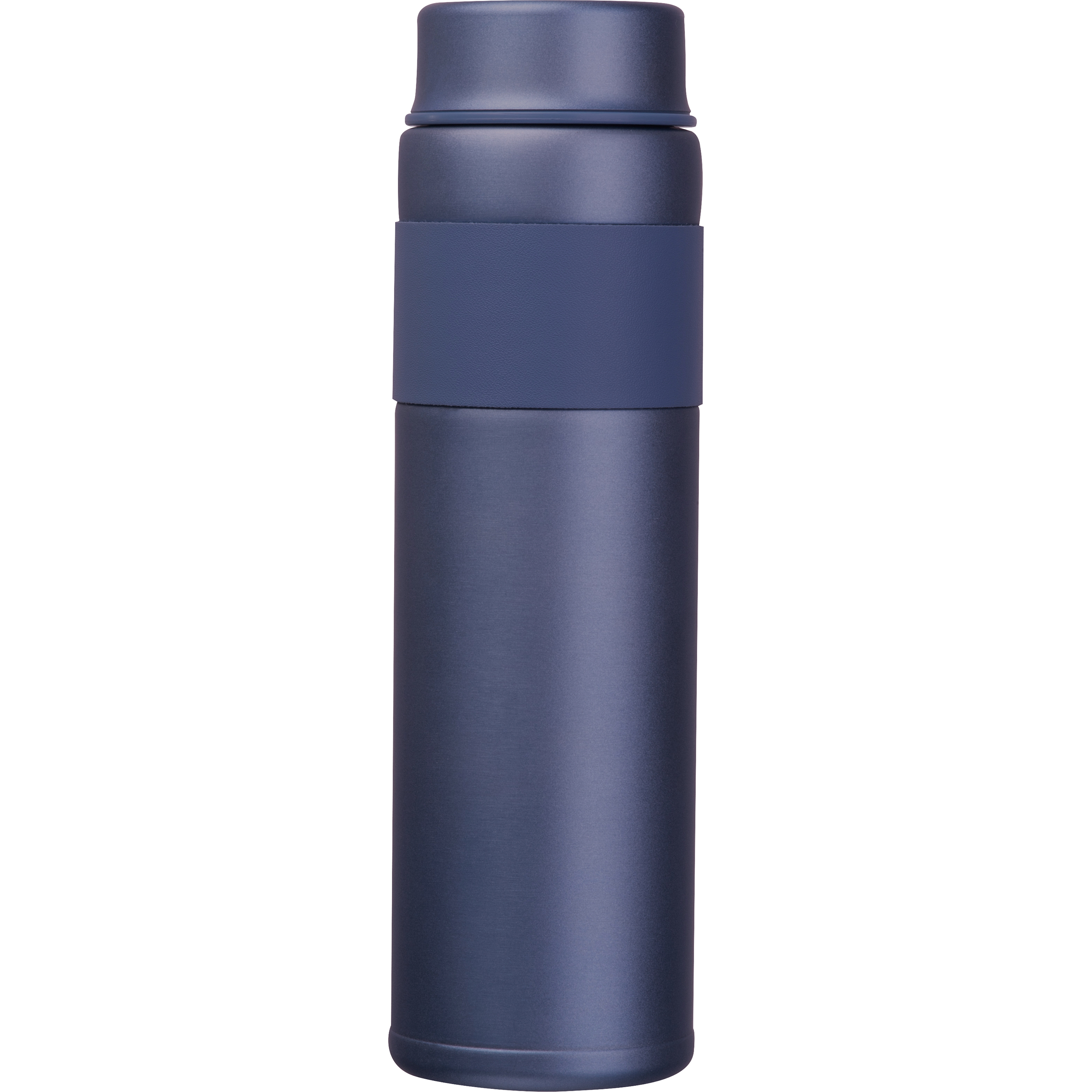 Doppelwandige Vakuum Trinkflasche aus Edelstahl mit 600ml Fassungsvermögen. Liegt durch die farblich abgestimmte Banderole aus PU gut in der Hand. Ihr Logo wird auf de Flasche graviert.