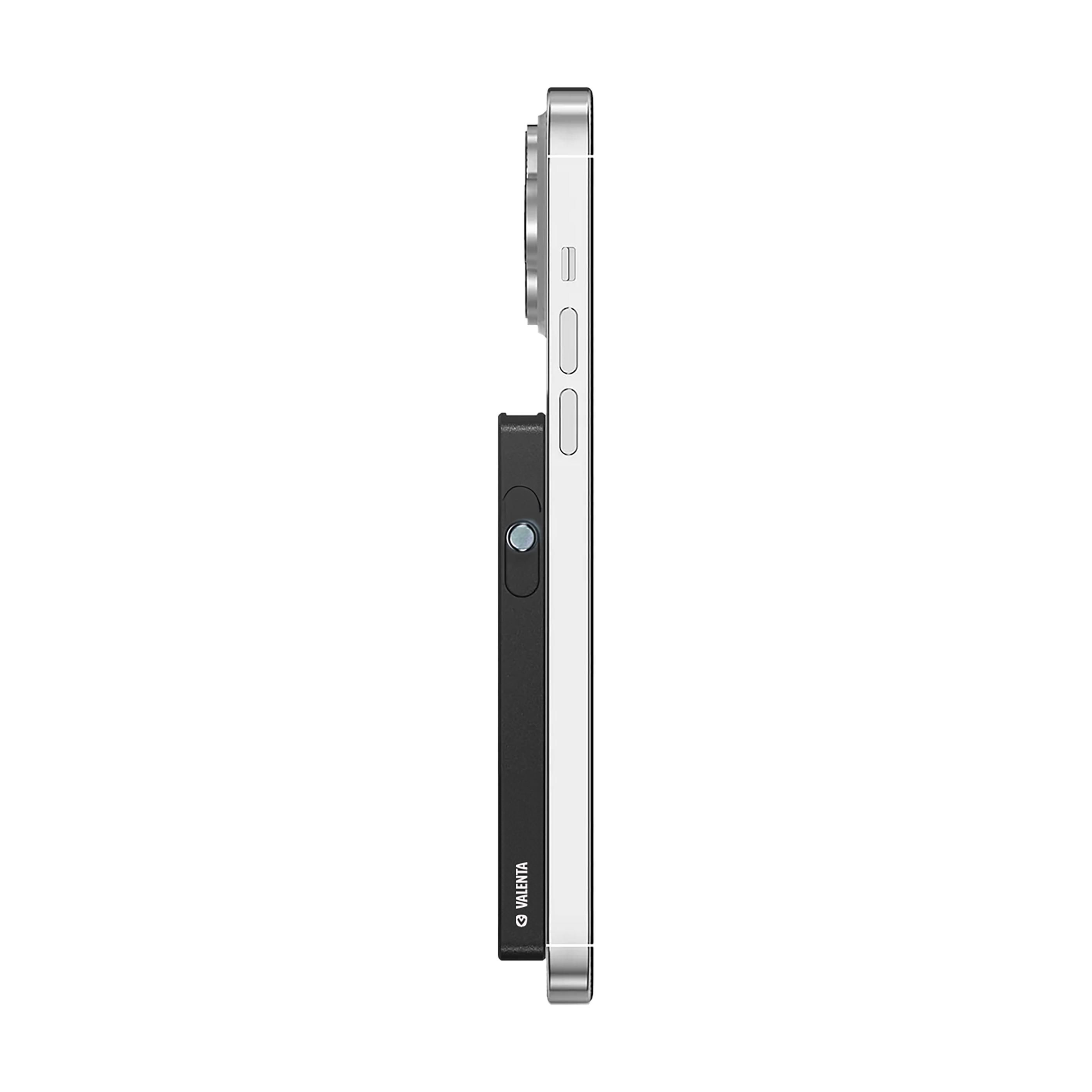 Kartenhalter MagSafe der Marke Valenta. Dieser hochwertige Kartenhalter aus Aluminium vereint Sicherheit, Komfort und Design. Dank der superstarken MagSafe-Magnete haftet der Kartenhalter fest an kompatiblen Smartphones. Der Halter bietet Platz für bis zu 7 (Bank-)Karten und ist mit einer zusätzlichen Verriegelung ausgestattet, um Kartenverlust zu verhindern. Ausgestattet mit einem Schiebemechanismus. Mit einer einzigen geschmeidigen Bewegung können Sie Ihre Karten einfach nach oben schieben. Die integrierte RFID-Sperre schützt persönliche und finanzielle Daten vor unerwünschtem Auslesen. Das ultradünne und kompakte Design macht den Kartenhalter komfortabel in der Anwendung und leicht in Ihrer Tasche, Ihrem Rucksack oder Ihrer Geldbörse zu transportieren. Die leistungsstarke MagSafe-Verbindung sorgt außerdem für eine stabile, freihändige Nutzung des Telefons und schnellen Zugriff auf die Karten. Eine stilvolle und funktionale Lösung für den täglichen Gebrauch.