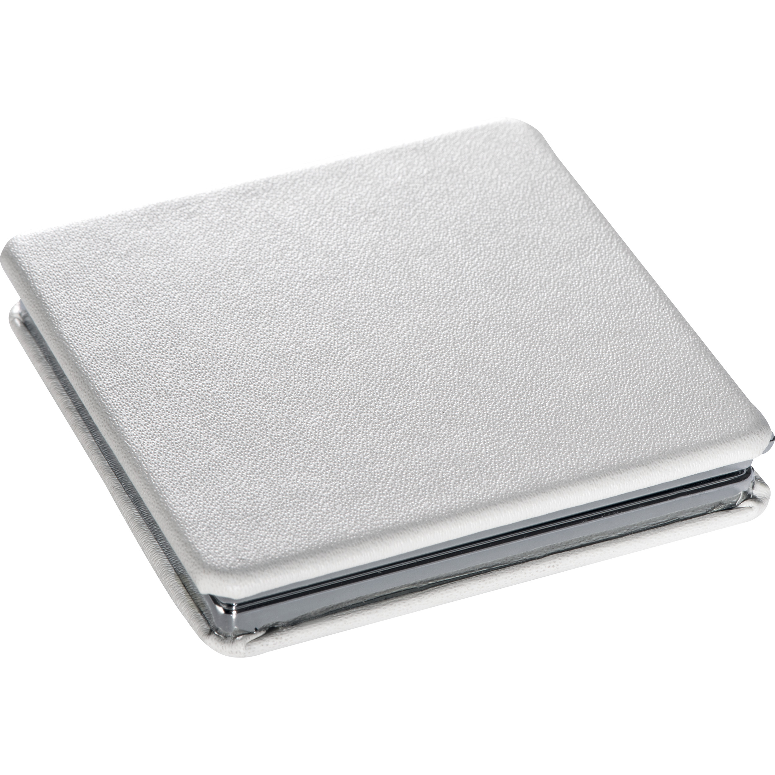 Bruchsicherer Doppelspiegel aus Metall in einem weißen Umschlag. Im Inneren befindet sich ein normaler und ein Vergrößerungsspiegel. Ihre Werbung wird per Lasergravur auf dem Normalspiegel angebracht.